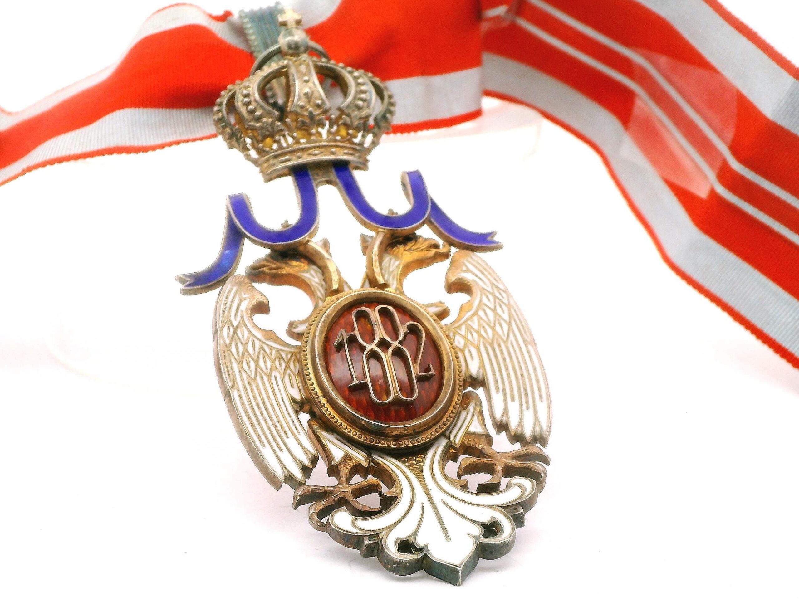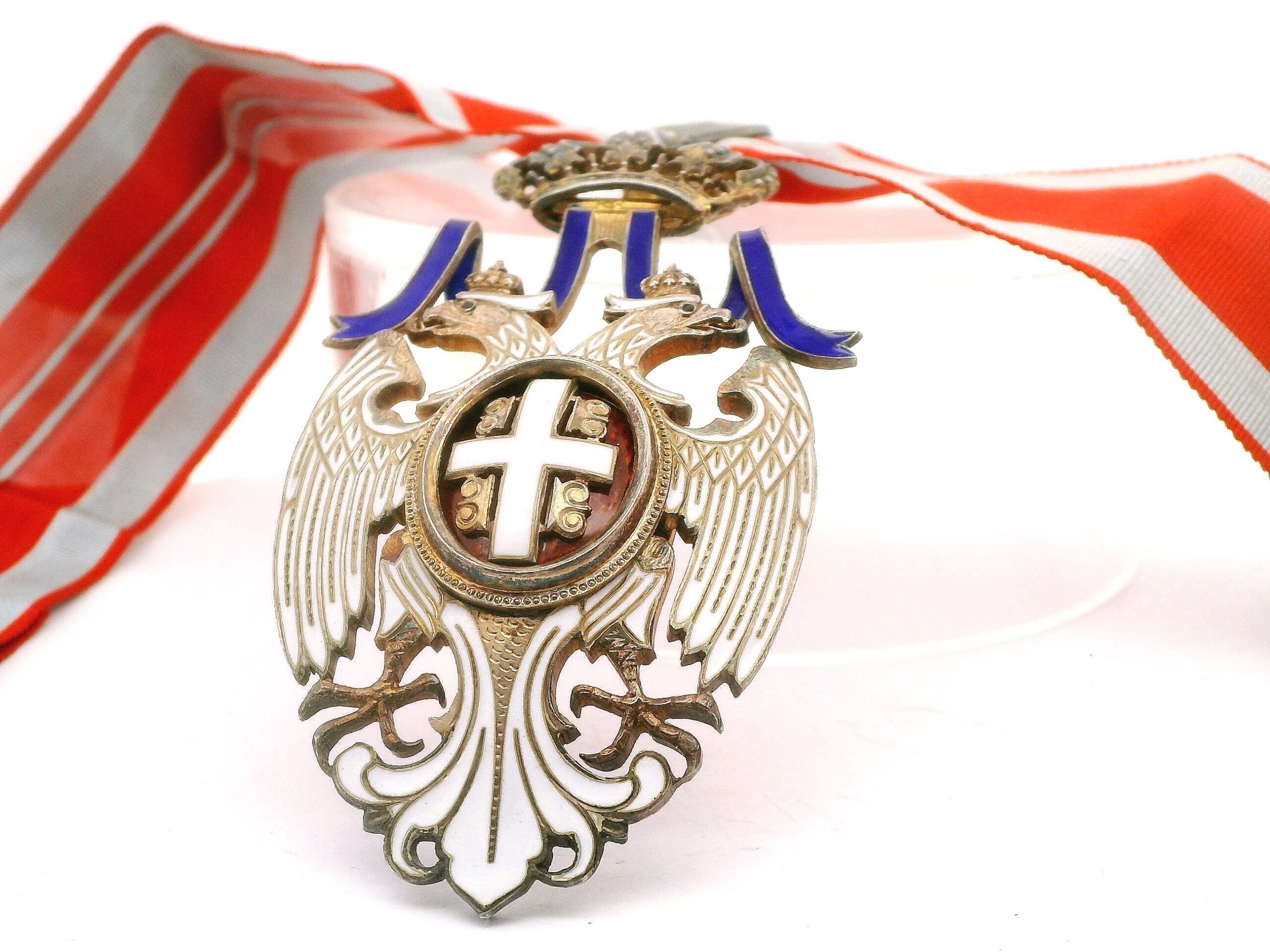 Der Orden des Weißen Adlers, III. Klasse, Typ II. ist eine geschichtsträchtige Auszeichnung, deren Ursprünge auf die Wiederherstellung des Königreichs Serbien zurückgehen. Gestiftet wurde der Orden am 23. Januar 1883 (nach julianischem Kalender, oft als 22. Februar/8. März 1882 zitiert, dem Tag der Proklamation des Königreichs) von König Milan I. Obrenović. Es ist ein Typ II, Ausgabe 1903–1941, Orden, wobei der Unterschied in den Typen mit dem Dynastiewechsel 1903 zusammenhängt. Er ist aus vergoldetem Silber gefertigt, mit mehrfarbigen Emaillearbeiten. Beidseitig sind fein ausgeführte, weiß emaillierter Doppeladler mit vergoldeten Details zu sehen. Auf der Vorderseite ist ein rotes ovales Medaillon mit emailliertem serbischen Kreuz in vergoldetem, gekörntem Rand und auf der Rückseite ist ein rotes ovales Medaillon mit erhabenem Stiftungsjahr „1882“, ebenfalls in vergoldetem, gekörntem Rand zu erkennen. Abgerundet wird das ganze mit der oben dargestellten hohle Krone mit blauen Emailbändern und originalem Halsband. Der Orden ist unsigniert, leicht getragen aber in sehr schönem Zustand. Maße: ca. 46,8 × 90,4 mm | The Order of the White Eagle, 3rd Class, Type II, is a historically significant decoration whose origins date back to the restoration of the Kingdom of Serbia. It was instituted on January 23, 1883 (according to the Julian calendar, often cited as February 22/March 8, 1882, the day of the Kingdom’s proclamation) by King Milan I Obrenović. It is a Type II order, issued between 1903 and 1941, the difference in types being related to the dynastic change in 1903. It is made of gilt silver with polychrome enamel work. Both sides feature a finely executed, white enameled double-headed eagle with gilt details. The obverse features a red oval medallion with an enameled Serbian cross within a gilt, grained border. The reverse displays a red oval medallion with the raised inscription “1882,” also within a gilt, grained border. The design is completed with the hollow crown shown above, adorned with blue enamel bands and the original neck ribbon. The order is unsigned, shows light wear, but is in very fine condition. Dimensions: approx. 46,8 × 90,4 mm