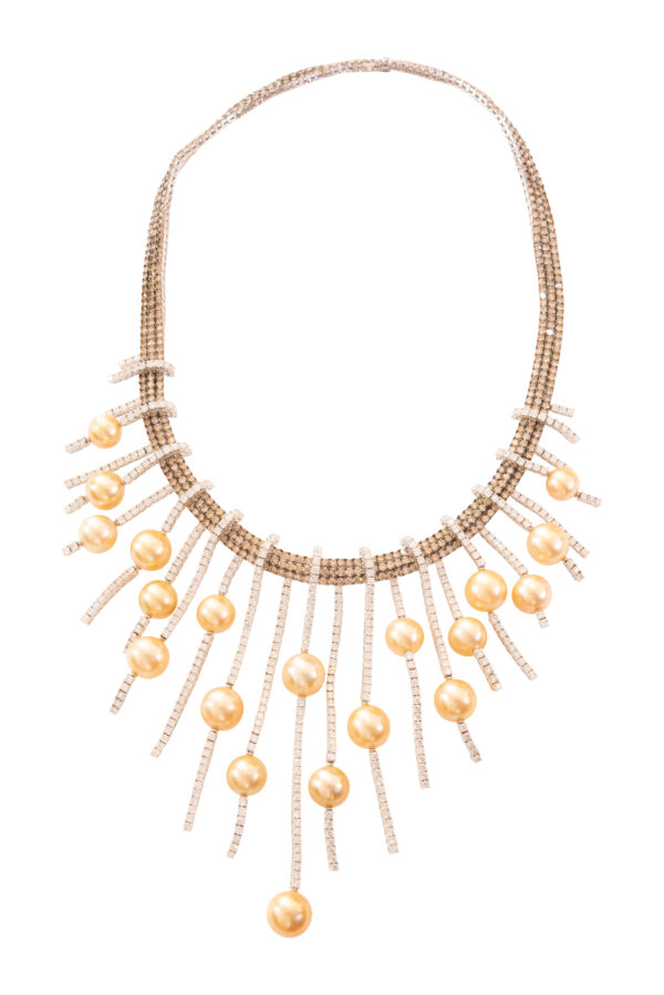 Collier WG 750/fein mit Brillanten zus.ca. 46.426,0ct H/SI1 inkl. Gelbe Brillanten und Kulturperlen 20 x 12,1-9,8 mm 215.868ct, Gesamtgewicht 161,29 g | Necklace WG 750/fine with diamonds total approx. 46,426.0ct H/SI1 incl. yellow diamonds and cultured pearls 20 x 12.1-9.8 mm 215.868ct, total weight 161.29 g