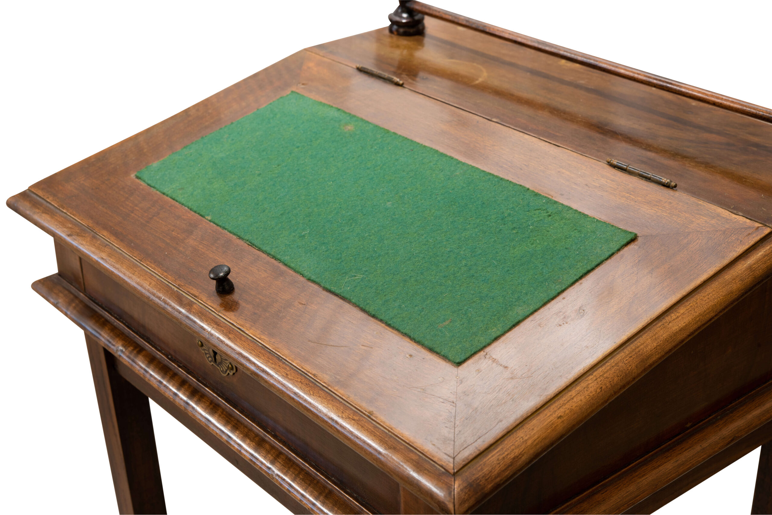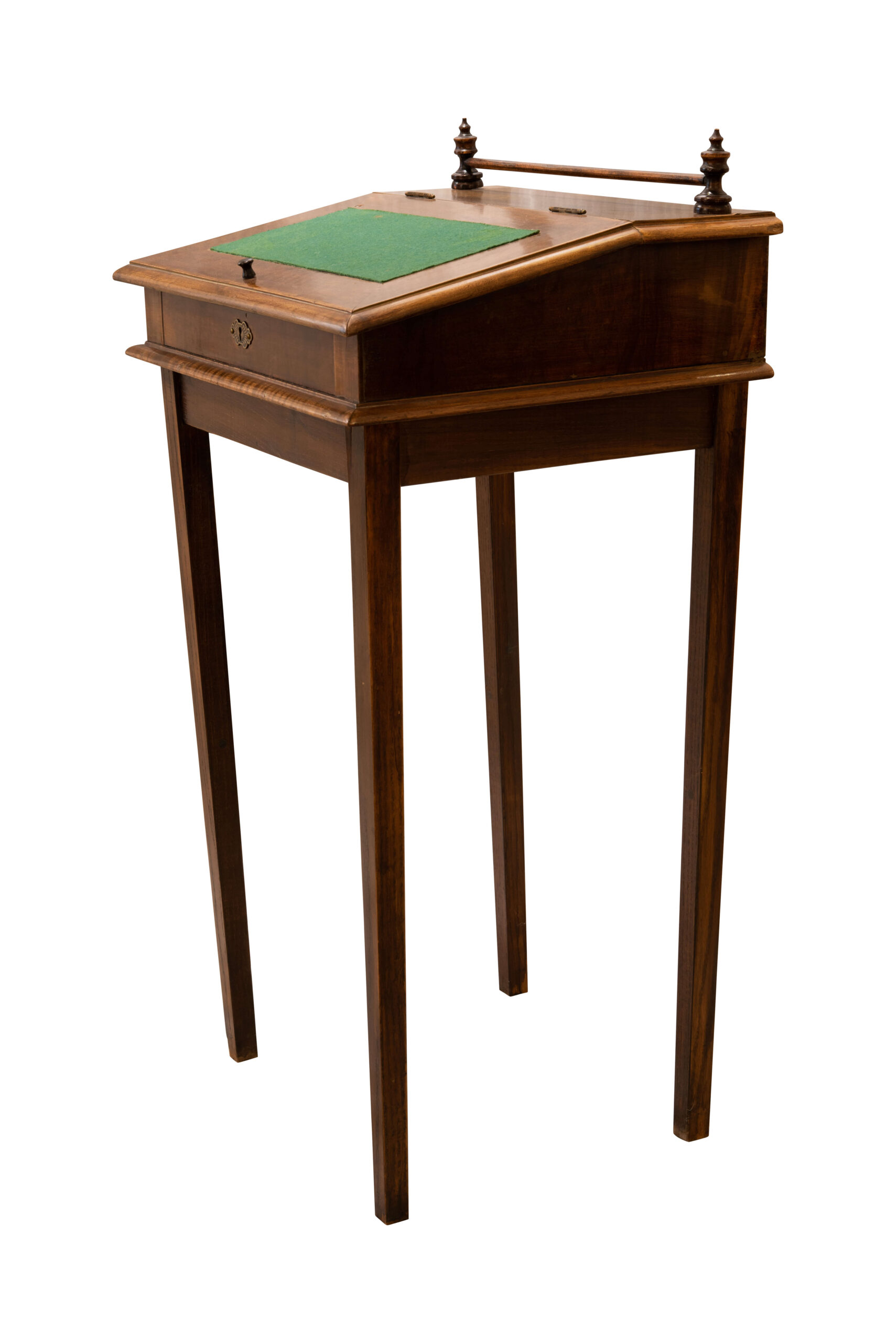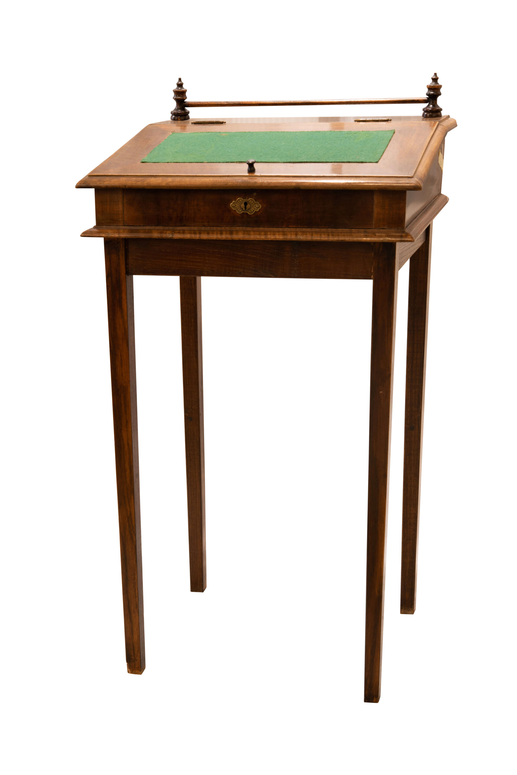 A ladies’ secretary desk, designed as a small wooden writing desk with a green felt insert on the writing surface, stands out with a foldable worktop and decorative elements. Dimensions: 52,5 x 43 x 90 cm | Ein Damensekretär, der als kleiner Holzschreibtisch mit grünem Filzeinsatz auf der Schreibfläche gestaltet ist, besticht durch eine klappbare Arbeitsplatte und dekorative Elemente. Maße: 52,5 x 43 x 90 cm