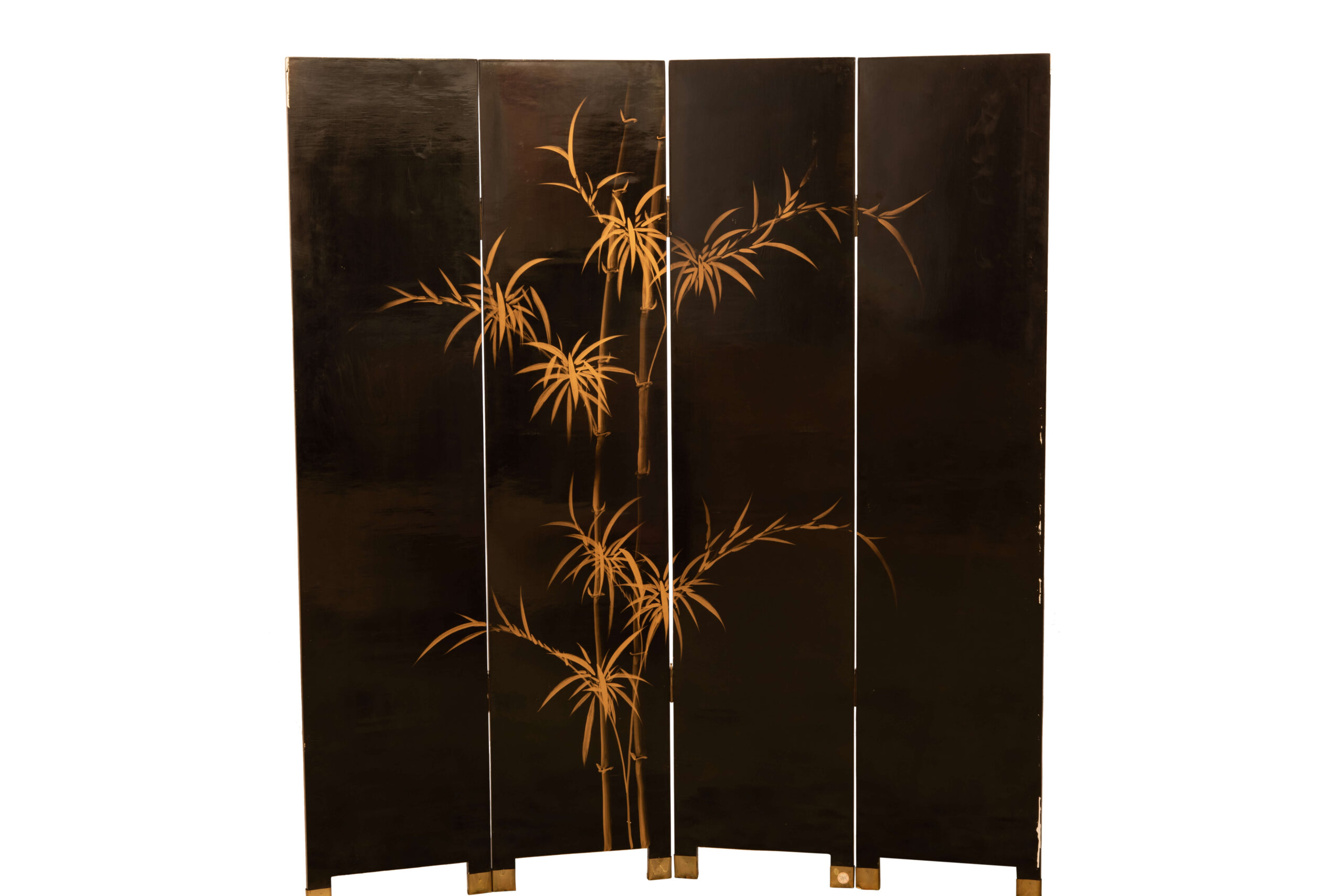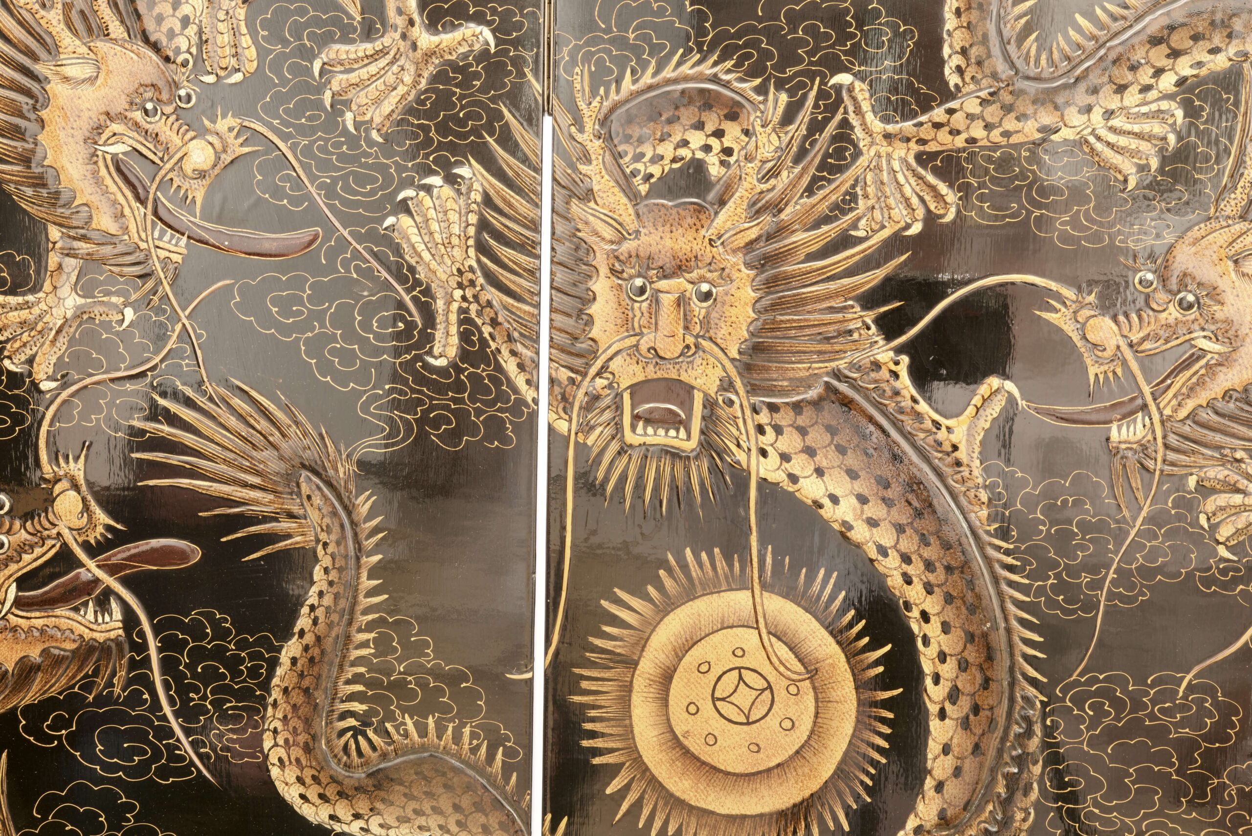 This beautifully lacquered folding screen features four intricately designed panels, each adorned with traditional Asian dragon motifs. Measurements: Height approx. 183 cm. | Der asiatische Paravent mit vier lackierten Blättern zeigt kunstvoll gestaltete Drachenmotive und ist ein stilvolles Dekorationsobjekt. Maße: Höhe ca. 183 cm.