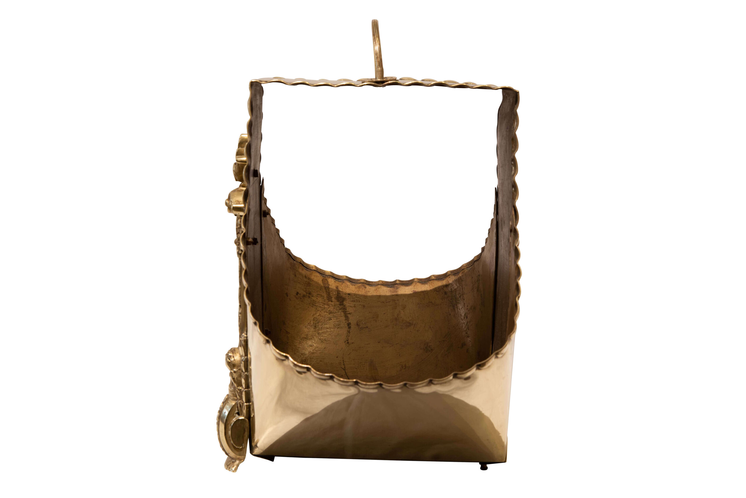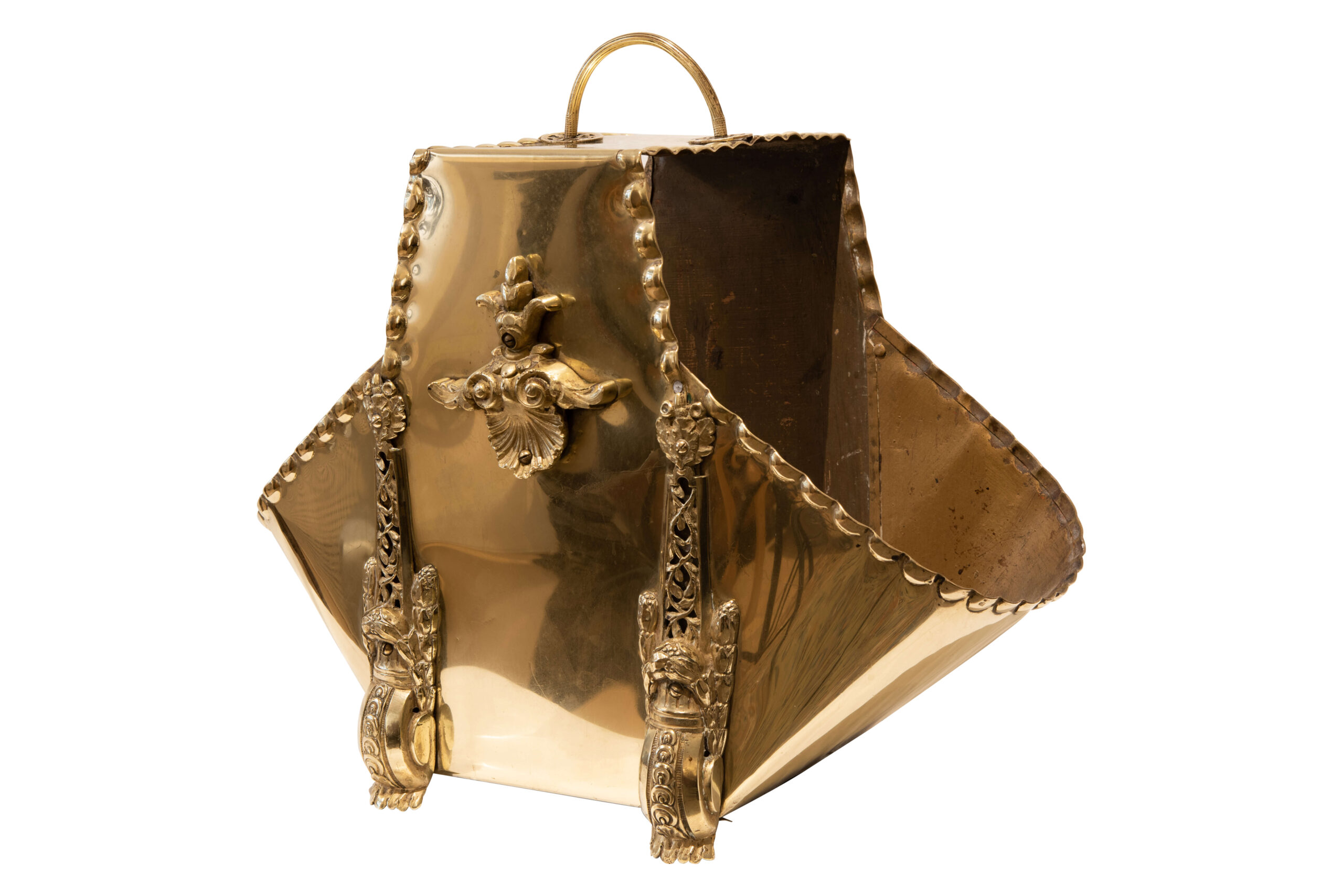 Metal container for firewood, gold-colored, oval, carrying handle, decorative edges, ornate feet, embossed patterns, dimensions: 43 x 46 cm. | Metallbehälter für Kaminholz, goldfarben, oval, Tragegriff, dekorative Kanten, verzierte Füße, geprägte Muster, Maße: 43 x 46 cm