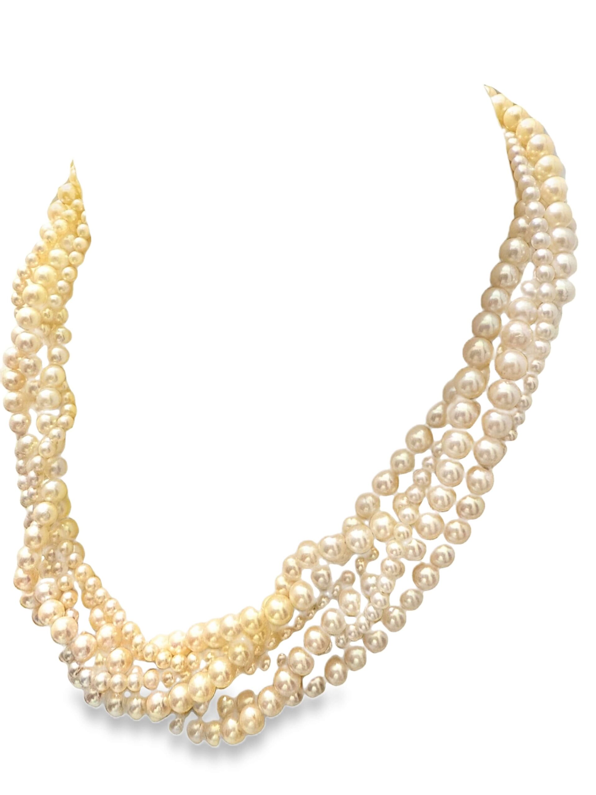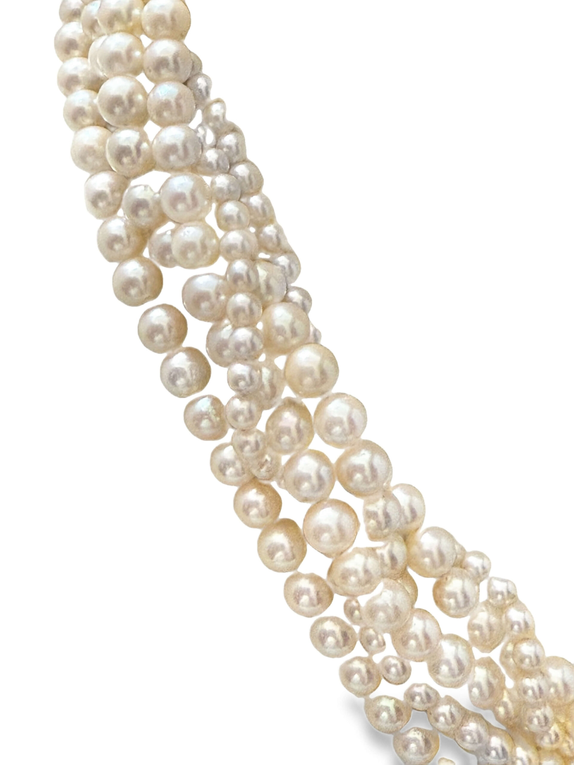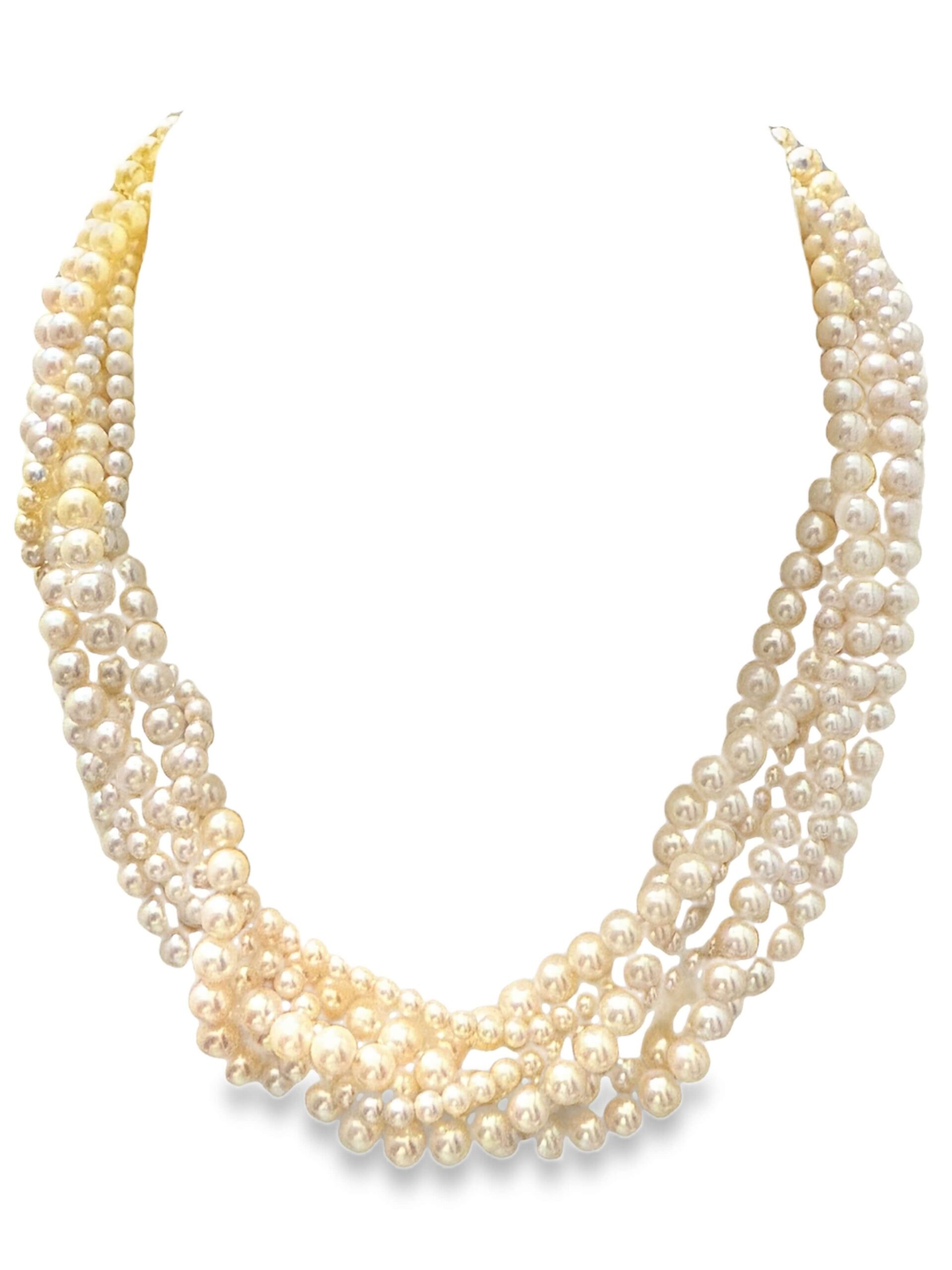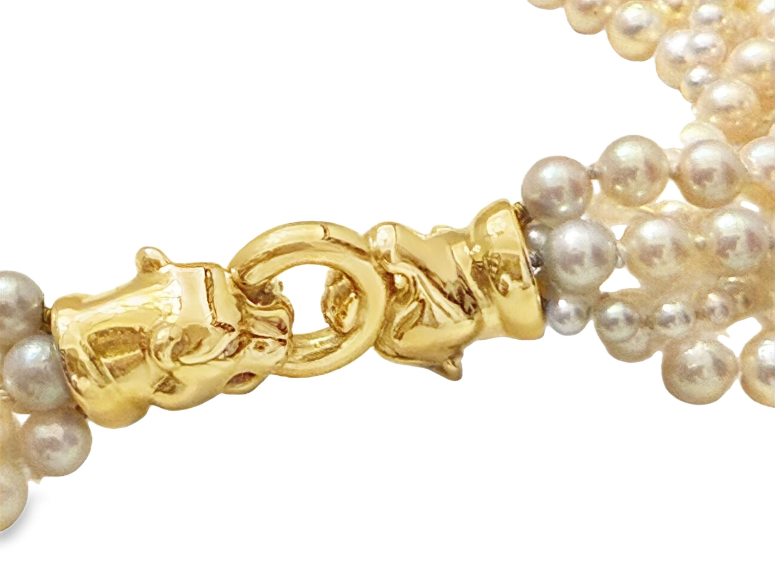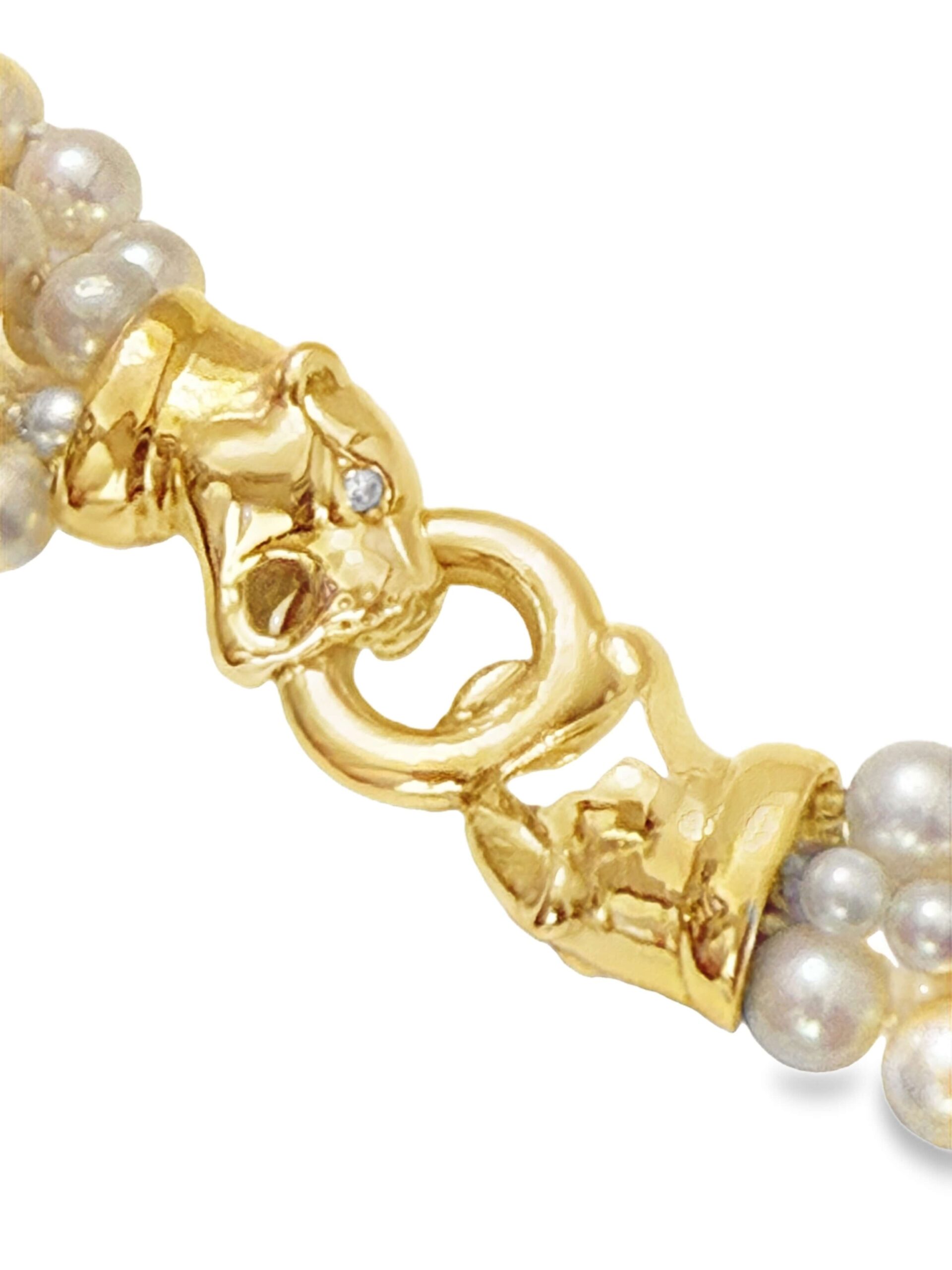 Collier mit Akoya-Kulturperlen, 6-reihig, in verschiedenen Größen, mit einer Schließe in Form eines Pantherkopfes aus Gelbgold 585/fein, besetzt mit Brillanten zusammen ca. 0,03 ct, Gesamtgewicht 105,6 g, Länge 45 cm | Collier with Akoya cultured pearls, 6-strand, in various sizes, with a clasp in the shape of a panther head in 585/fine yellow gold set with diamonds together approx. 0.03 ct, total weight 105.6 g, length 45 cm