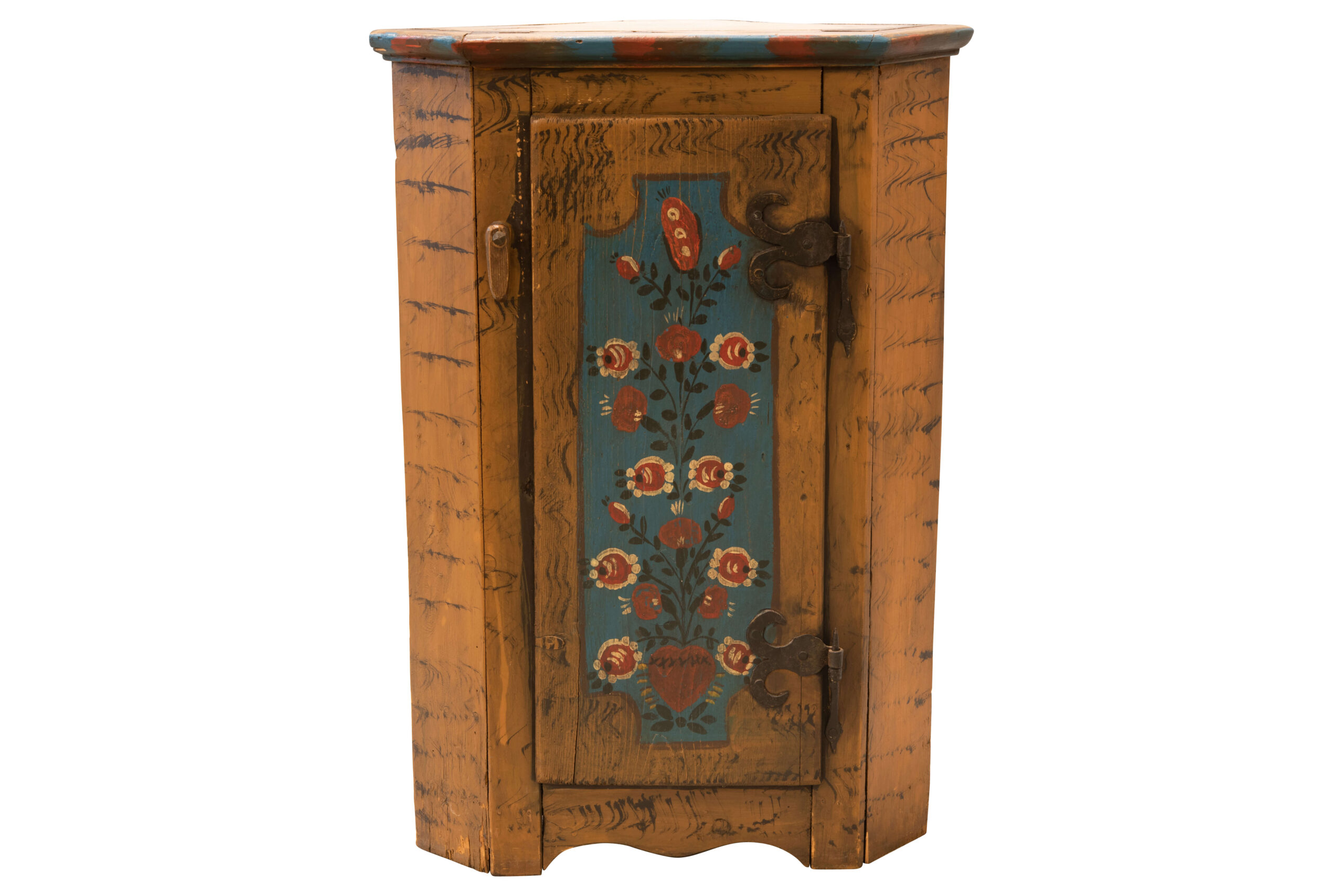 Small, rustic corner cabinet made of wood with hand-painted floral decorations on a blue front, massive metal fittings, and visible wood texture, suitable for traditional or country-style interiors, dimensions: 77 cm high. | Kleiner, rustikaler Eckschrank aus Holz mit handbemalten floralen Verzierungen auf einer blauen Front, massiven Metallbeschlägen und sichtbarer Holzstruktur, passend für traditionelle oder ländliche Einrichtung, Maße: 77 cm hoch