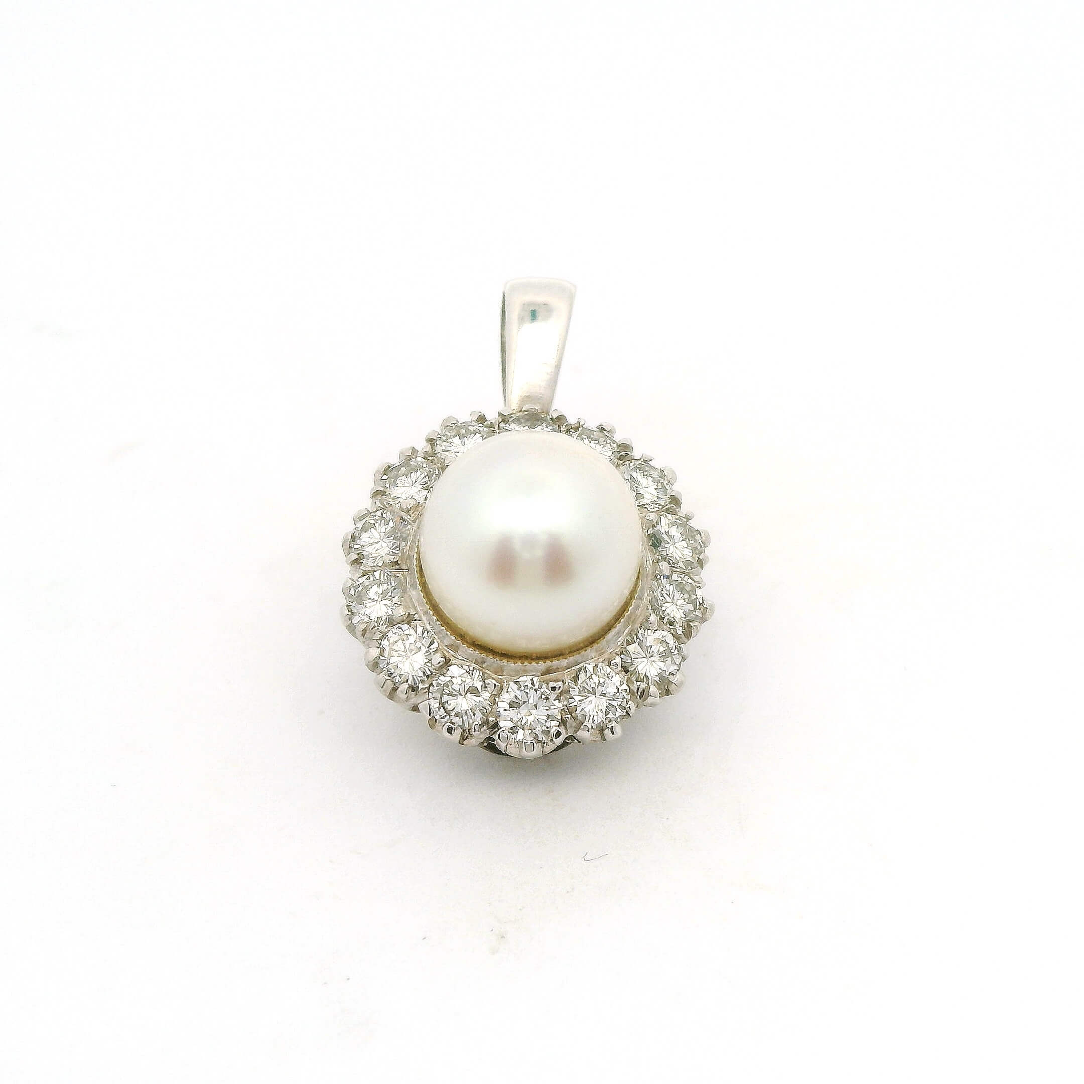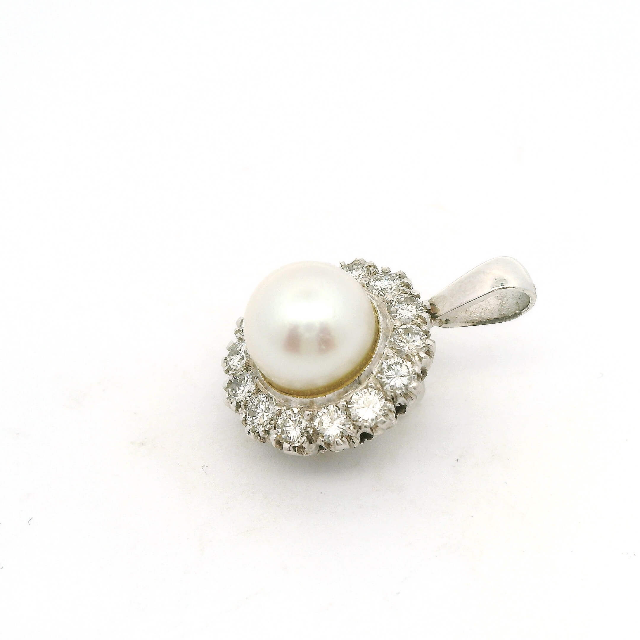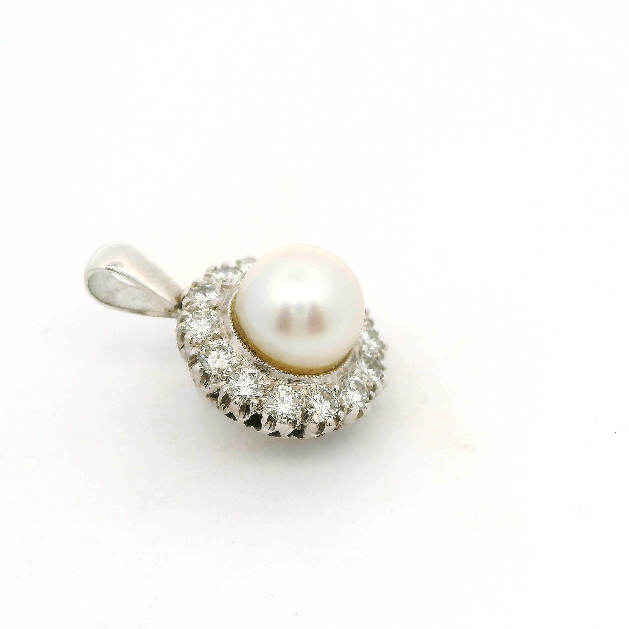 Anhänger Weißgold 585/fein mit 14 Brillanten zusammen ca. 0,35 ct und einer Akoya-Kulturperle ca. 7,9 mm, Gesamtgewicht 3,08 g | Pendant White Gold 585/fine with 14 Brilliant Cut Diamonds together approx. 0.35 ct and One Akoya Cultured Pearl approx. 7.9 mm, Total weight 3.08 g