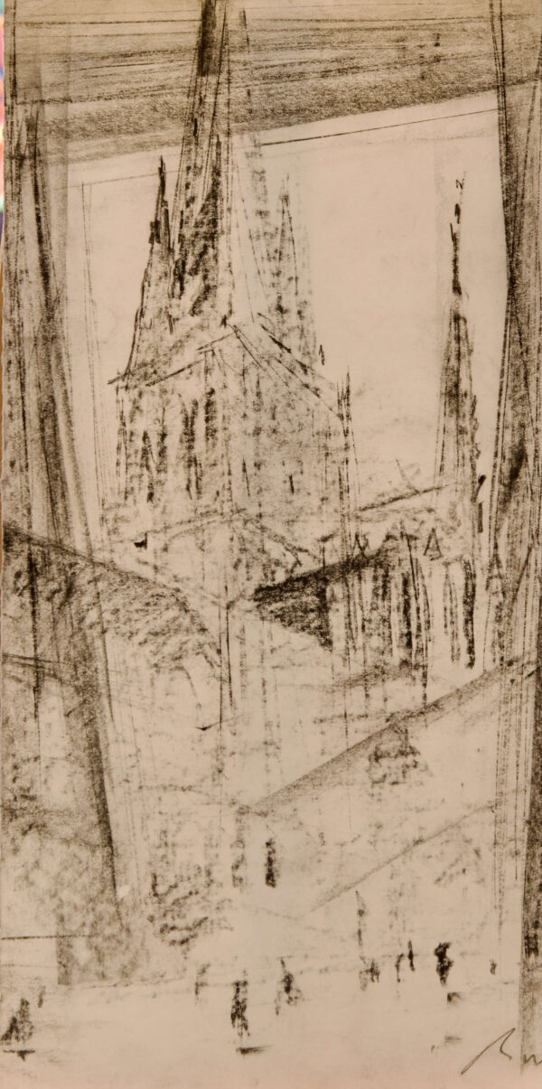 Church with Tower, charcoal, signed, dimensions: 55 x 28 cm | Kirche mit Turm, Kohle, signiert, Maße: 55 x 28 cm