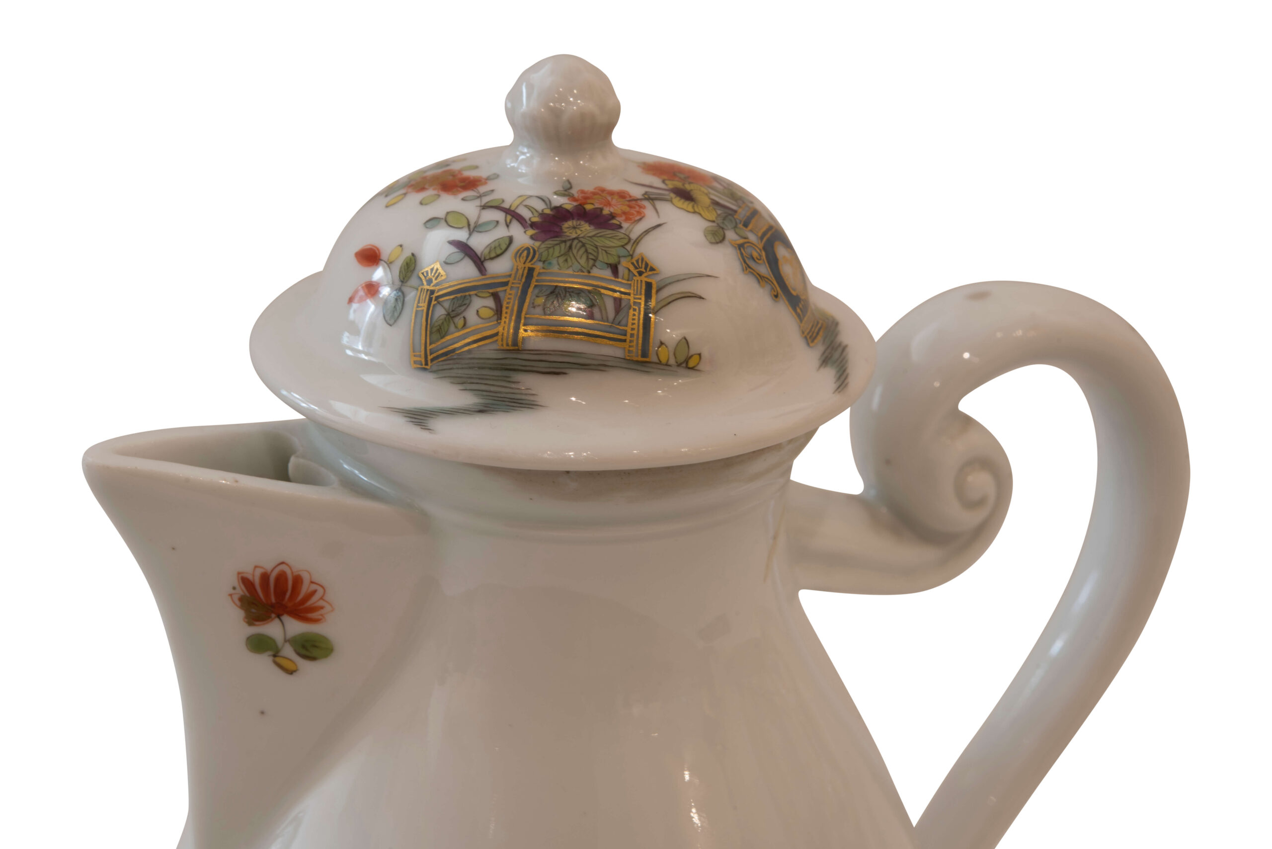 Porzellan, farbig gefasste Ballusterform, im japanischen Kakiemon-Stil bemalt. Volutenhenkel und Schnabelausguss, runder Haubendeckel mit Kugelknauf, überhängender gewölbter Deckel, umlaufend mit Kakiemon bemalt, ohne Goldmontierung, Schwertermarke. Maße: Höhe 22 cm | Porcelain, painted in Japanese Kakiemon style. A scrolled handle and spout, a round, domed lid with a ball finial, and an overhanging domed lid, painted all around with kakiemon motifs. No gold mountings, and a sword mark. Dimensions: Height 22 cm