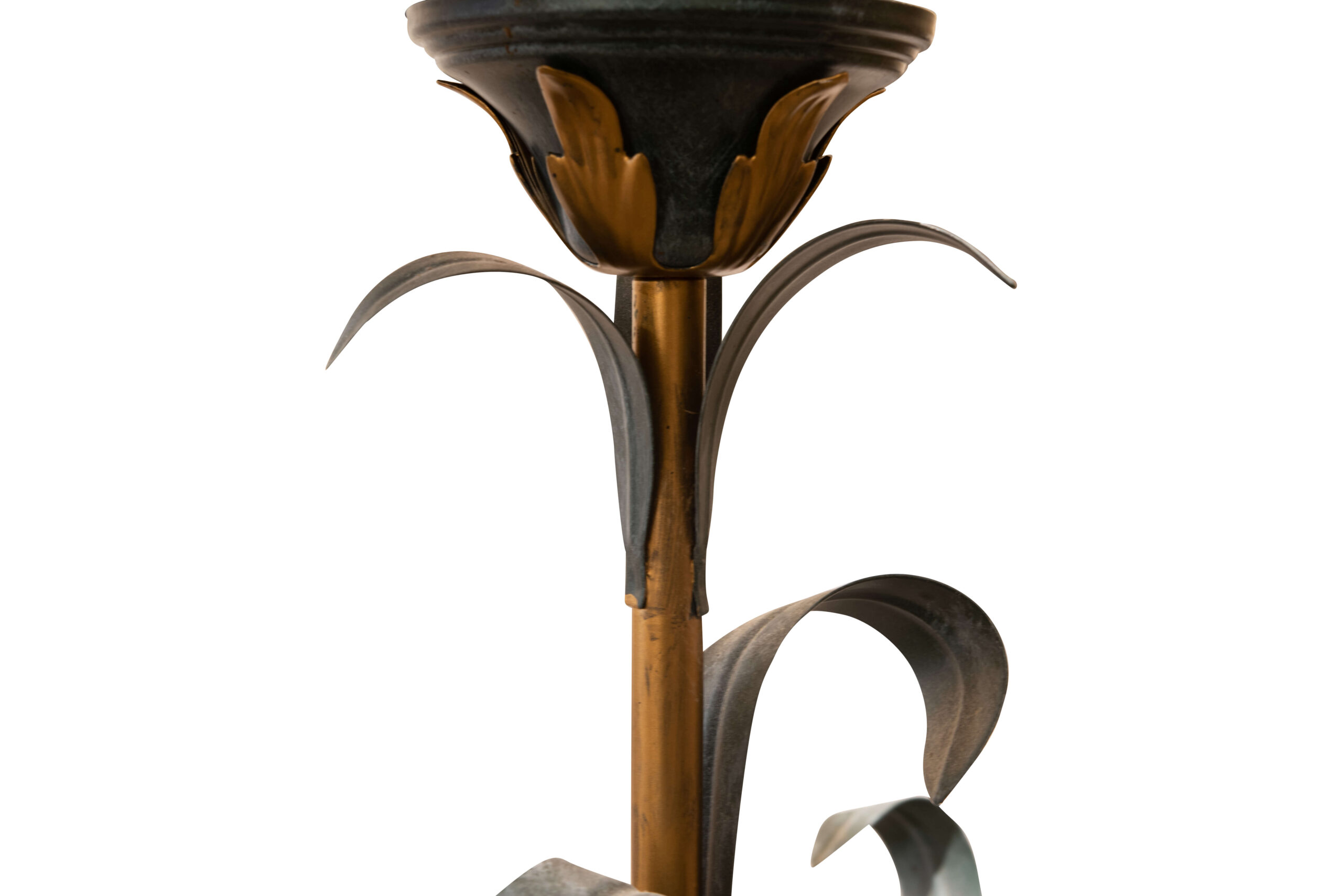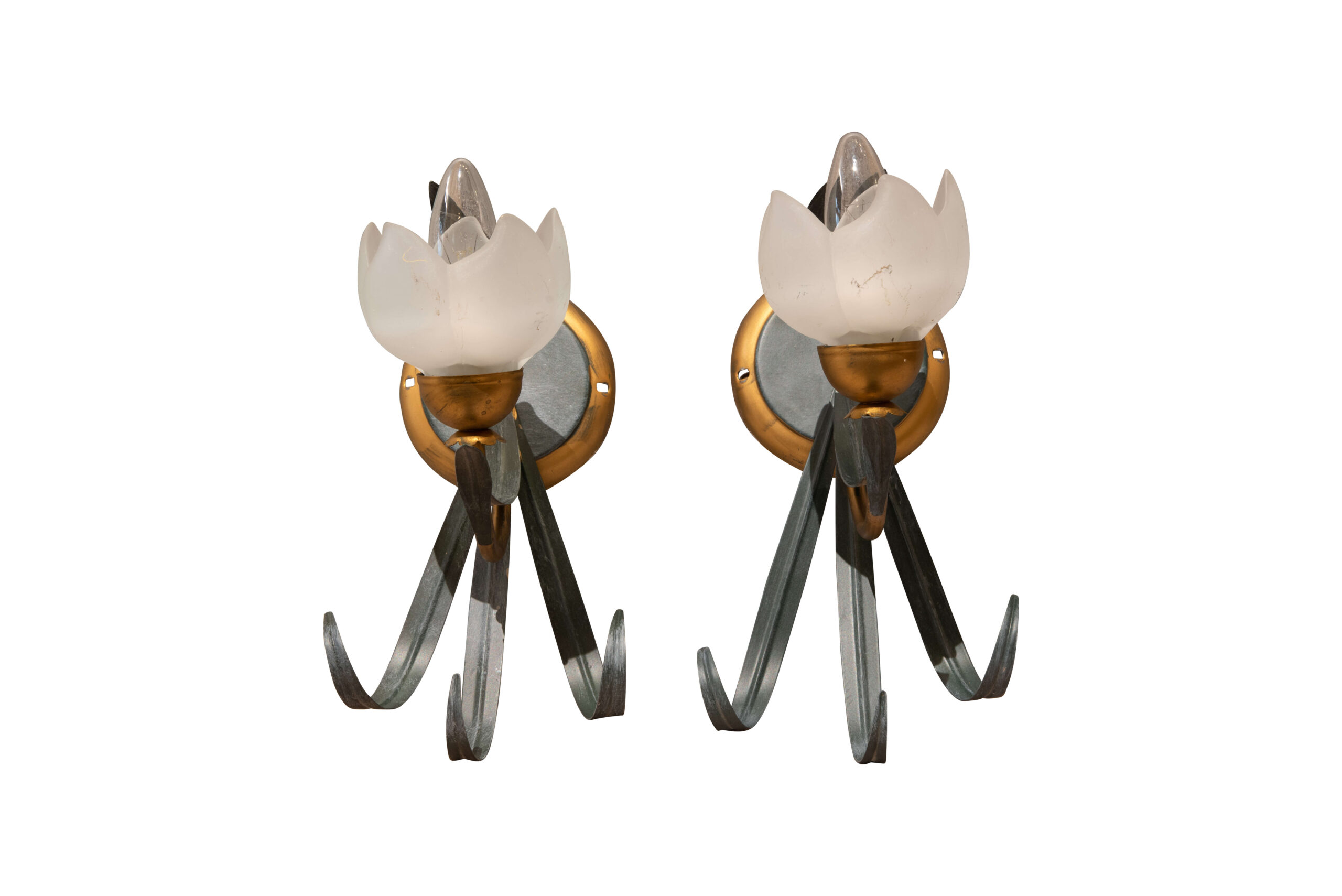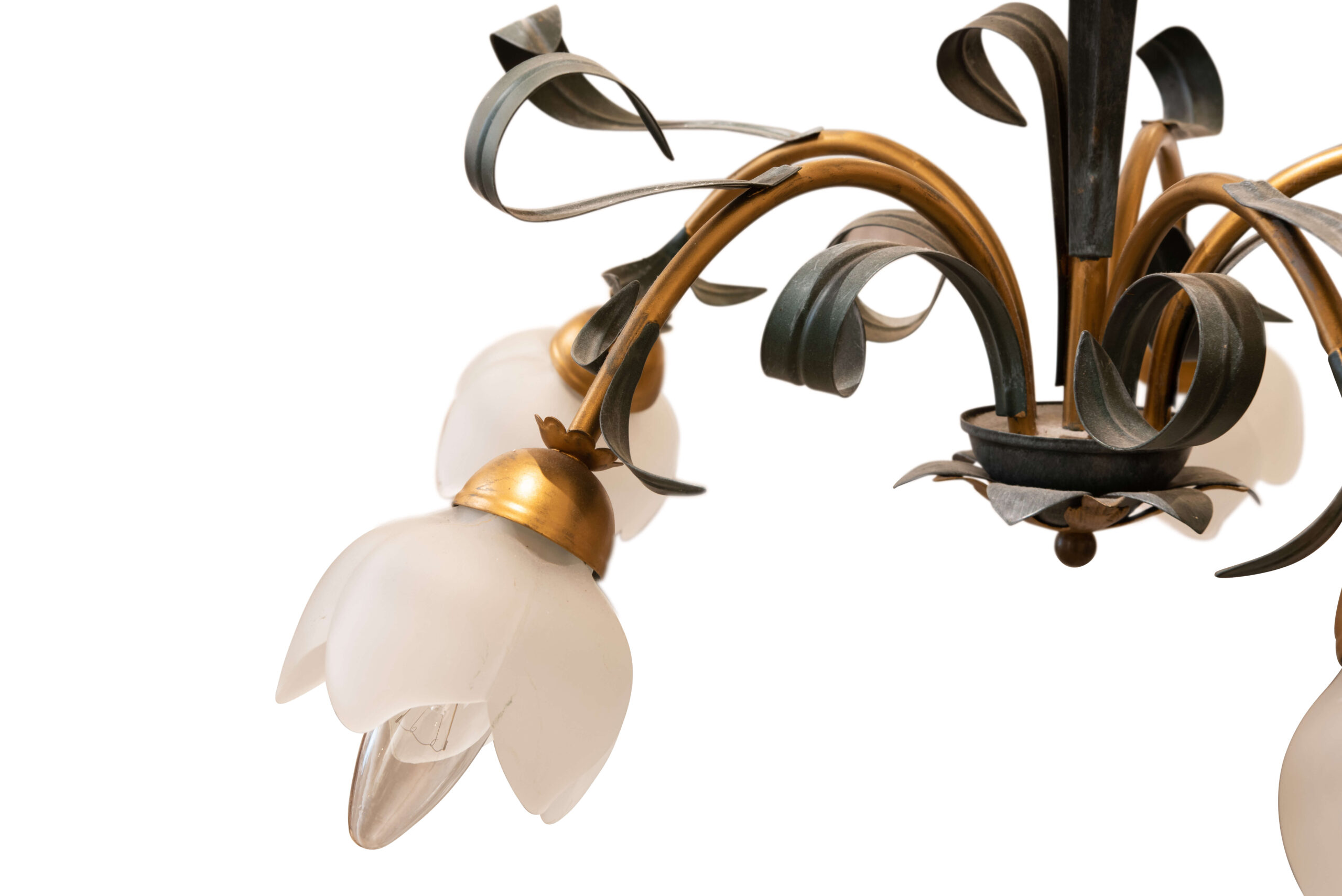 Chandelier in a floral design, made from a combination of bronze-colored metal and satin-finished glass in the shape of flowers, plus two small and one medium-sized applique in the same style. They look elegant and organic, with curved details and fine craftsmanship, dimensions: chandelier hanging approx. 130 cm long including chain, medium-sized applique 64 cm long, small applique 30 cm long | Luster im floralen Design gefertigt, kombiniert aus bronzefarbenem Metall und satiniertem Glas in Blütenform, dazu zwei kleine und eine mittelgroße Applike im selben Stil. Sie wirken elegant und organisch, mit geschwungenen Details und feiner Handwerkskunst, Maße: Luster hängend circa 130 cm lang inklusive Kette, Mittelgroße Applike 64 cm lang, Kleine Appliken 30 cm lang