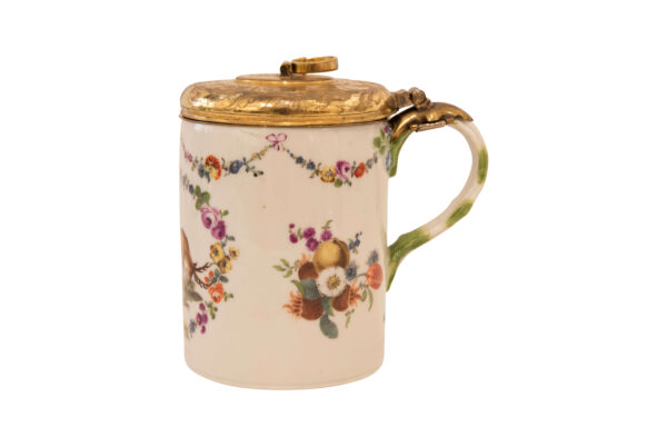 Zylindrischer Walzenkrug mit geschweiftem Bandhenkel und farbig bemalten Porzellan, mit Blütenranken und Blütenmotiven. An der vorderen Wandung ist eine Blüten umgebene Kartusche mit einem springenden Hirsch. Ein gewölbter Deckel im vergoldetem Silber mit Tiergravuren und restaurierten Schwertermarke. Maße: Höhe 15 cm, Durchmesser 11 cm | Cylindrical cylinder-shaped jug with a curved ribbon handle and colorfully painted porcelain, featuring floral tendrils and floral motifs. The front wall features a cartouche surrounded by flowers depicting a leaping stag. The domed lid is gilt silver with animal engravings and a restored crossed swords mark. Dimensions: Height 15 cm, Diameter 11 cm