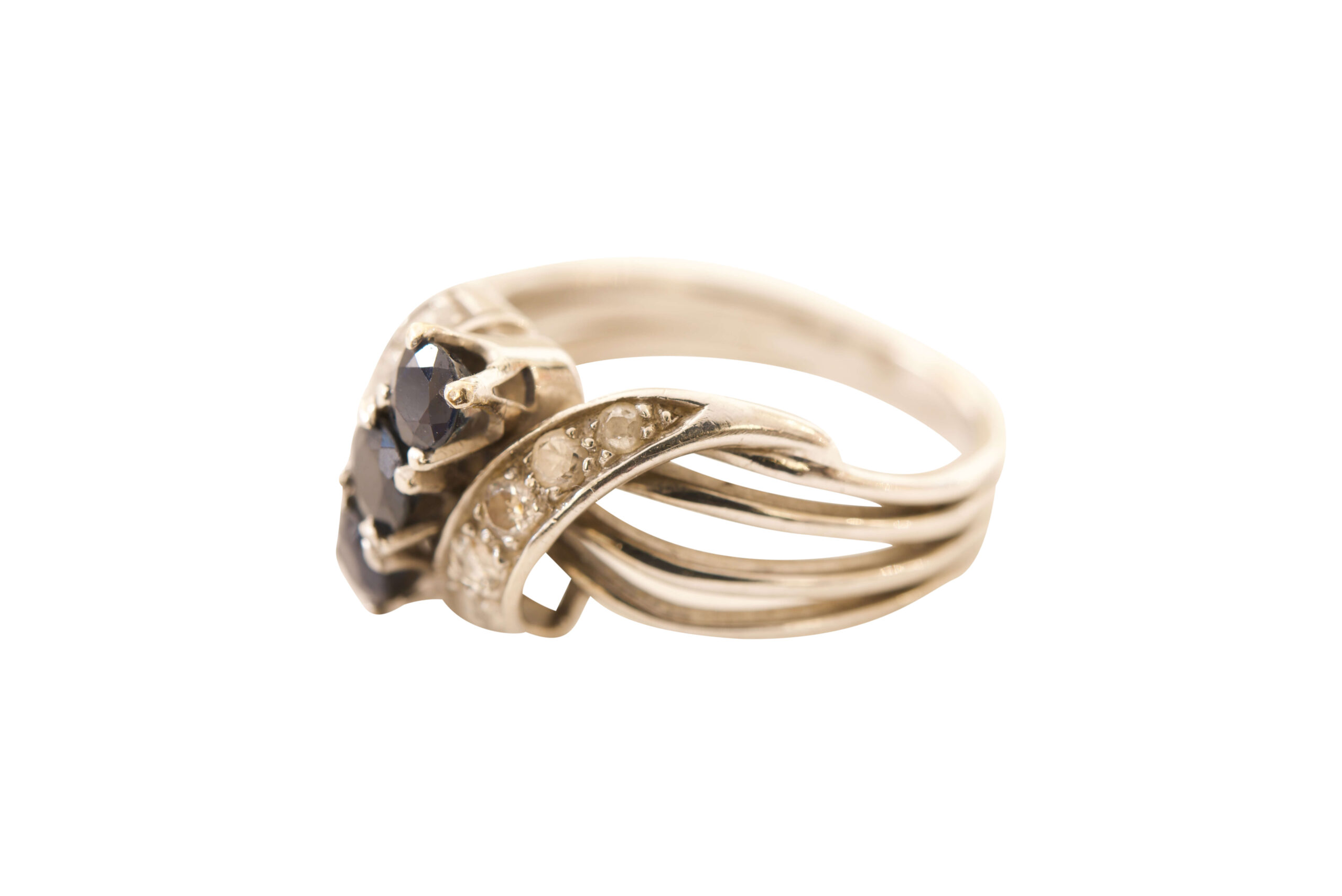 Ring Weißgold 585/fein mit Altschliff-Diamanten, zusammen ca. 0,15 ct und drei Saphiren, zusammen ca. 0,69 ct, Gesamtgewicht 5,5 g, RW 55 | Ring white gold 585/fine with old-cut diamonds, together approx. 0.15 ct and three sapphires, together approx. 0.69 ct, total weight 5.5 g, size 55