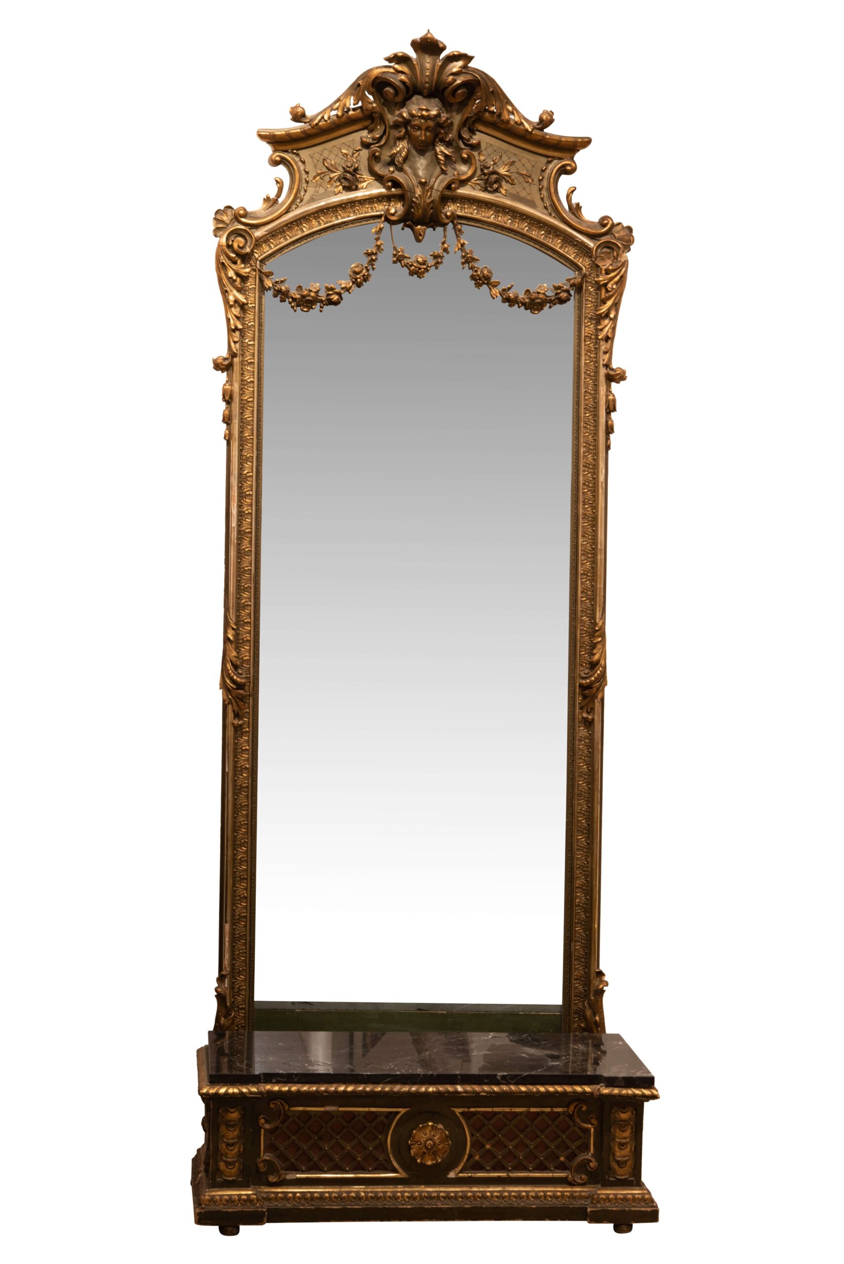 Florentine Mirror with gilded frame on Pedestal, Handcrafted with richly decorated Ornamentation, Dimensions: Mirror 252 x 96 cm, Pedestal 95 x 37 x 35 cm | Florentiner Spiegel mit vergoldetem Rahmen auf Sockel, handgefertigt mit reich verzierten Ornamenten, Maße: Spiegel 252 x 96 cm, Sockel 95 x 37 x 35 cm