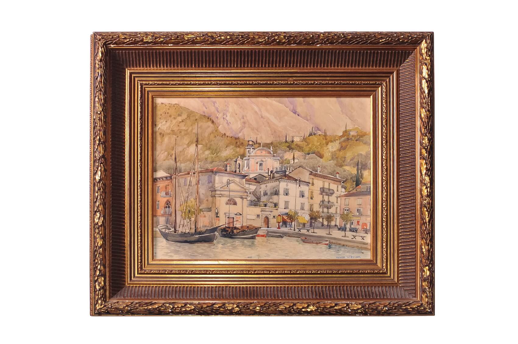 Adolf Wiesler 1878-1958, Aquarell auf Papier, das Bild zeigt den Blick vom See auf den Hauptplatz von Malcesine im Vordergrund Segelschiffe im Hintergrund die Berge, signiert, Maße 29 x 38 cm | Adolf Wiesler 1878-1958, watercolor on paper, the picture shows the view from the lake to the main square of Malcesine in the foreground sailing ships in the background the mountains, signed, dimensions 29 x 38 cm