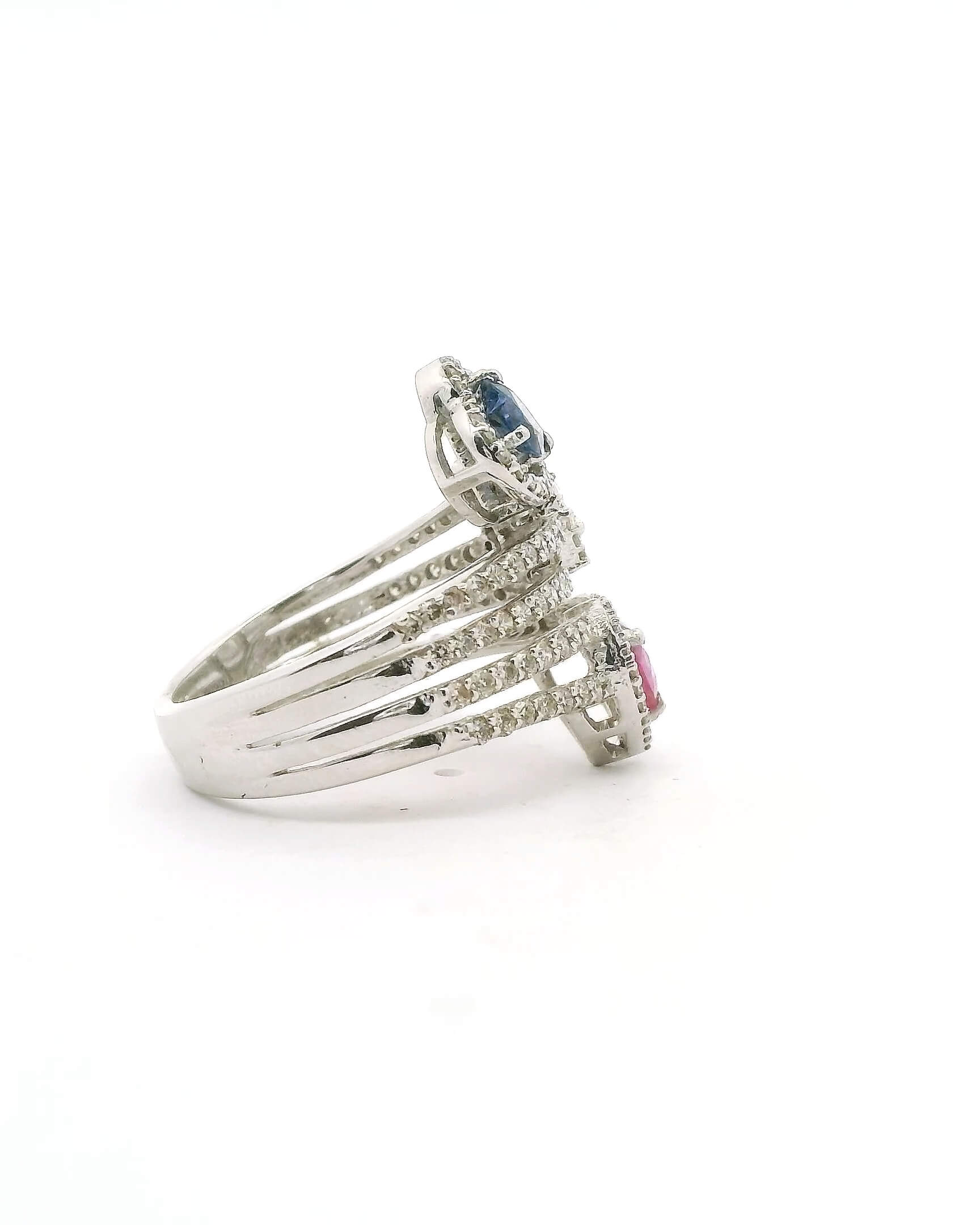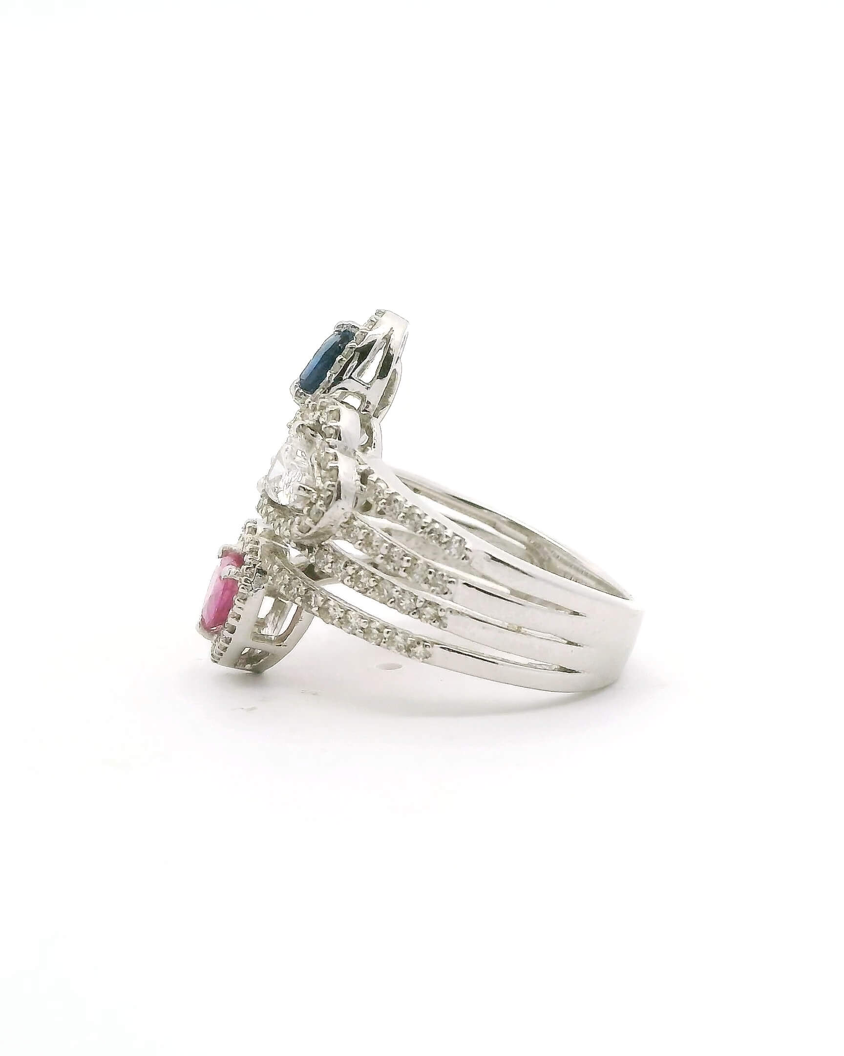 Ring aus Weißgold 750/fein mit Brillanten und einem Diamanten in Herzform von zusammen circa 1,01 ct sowie je einem Rubin- und Saphirherz von zusammen circa 0,83 ct, Gesamtgewicht 6,9 g, Ringweite 55 | Ring Made of White Gold 750/Fine with Diamonds and a Heart-Shaped Diamond of Approximately 1.01 ct Total and Ruby and Sapphire Hearts of Approximately 0.83 ct Total, Total Weight 6.9 g, Ring Size 55