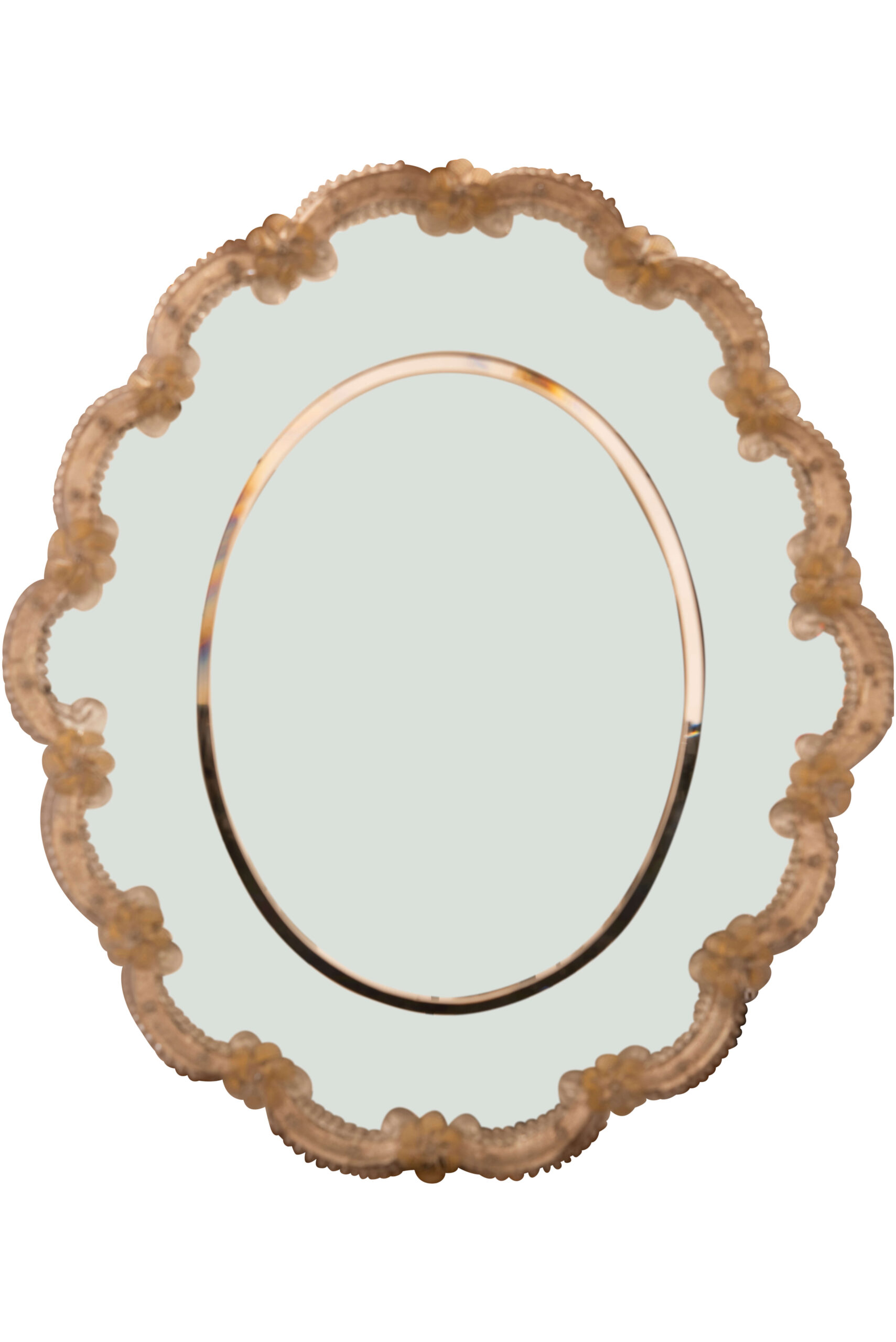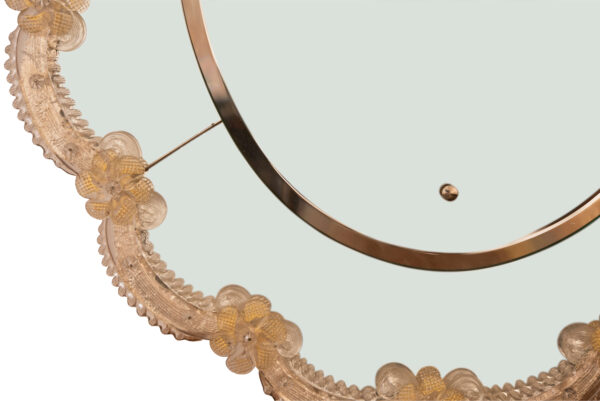 Murano wall mirror on wood, glass frame with floral applications, Italy, mid-20th century, Slight small blind spots in the mirror, dimensions: 69 x 61 cm | Murano Wandpiegel auf Holz, Glasrahmen mit floralen Applikationen, Italien, Mitte des 20. Jahrhunderts, Leichte kleine blinde Stellen im Spiegel, Maße: 69 x 61 cm