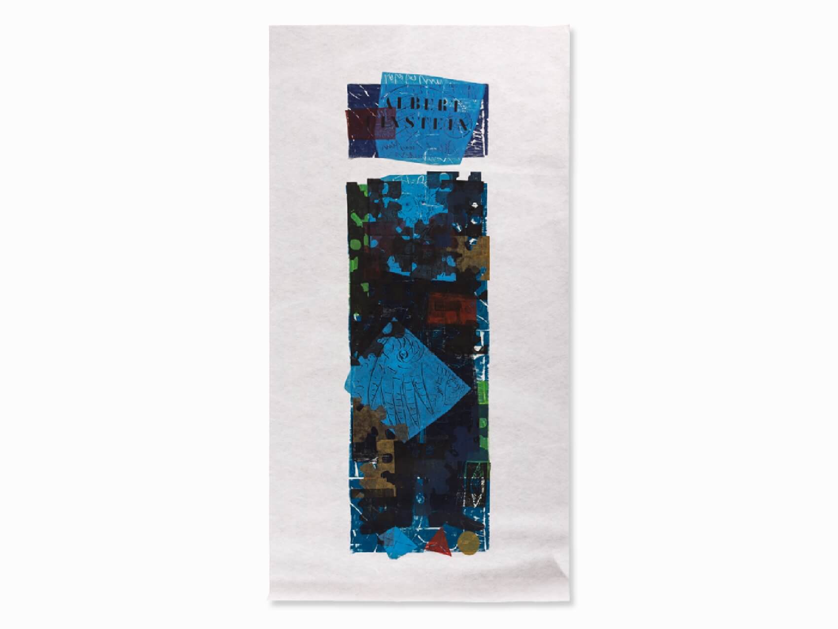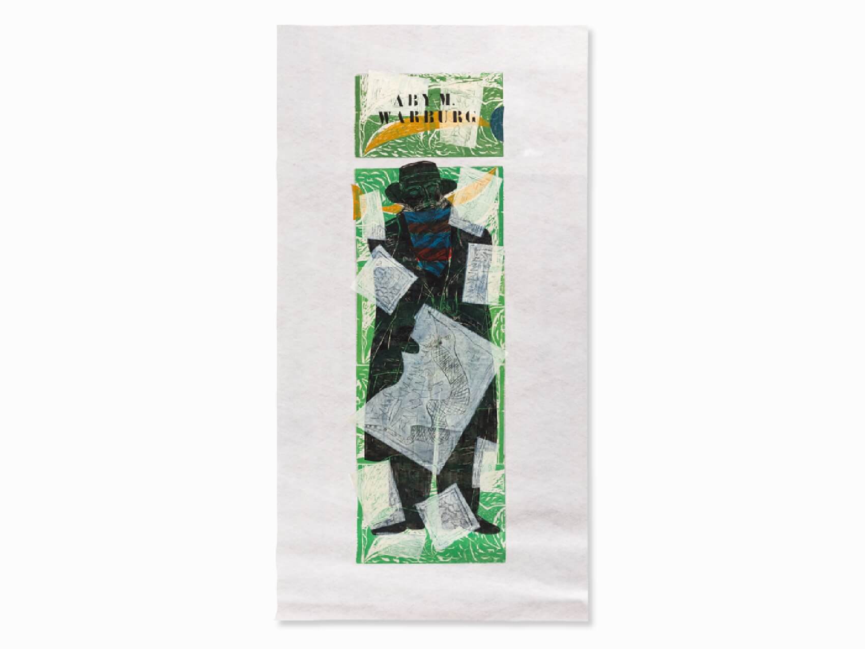 Ruth Tesmar,Folge von 12 Farbholzschnitten auf Vlies, auf Vlies aufgelegt, Deutschland, 1999/200, Handabzüge der Künstlerin, eines von 5 Exemplaren, Monumentale Farbholzschnitte, die 12 Persönlichkeiten der Wissenschaften zu einem Symposion versammeln, DarstellungsMaße variierend, circa 250 x 90 cm, Maße jeweils circa 302 x 160cm | Ruth Tesmar, series of 12 woodcuts in colors on fleece, laid down on fleece, Image dimensions varying, 250 x 90 cm, dimensions each around 302 x 160 cm