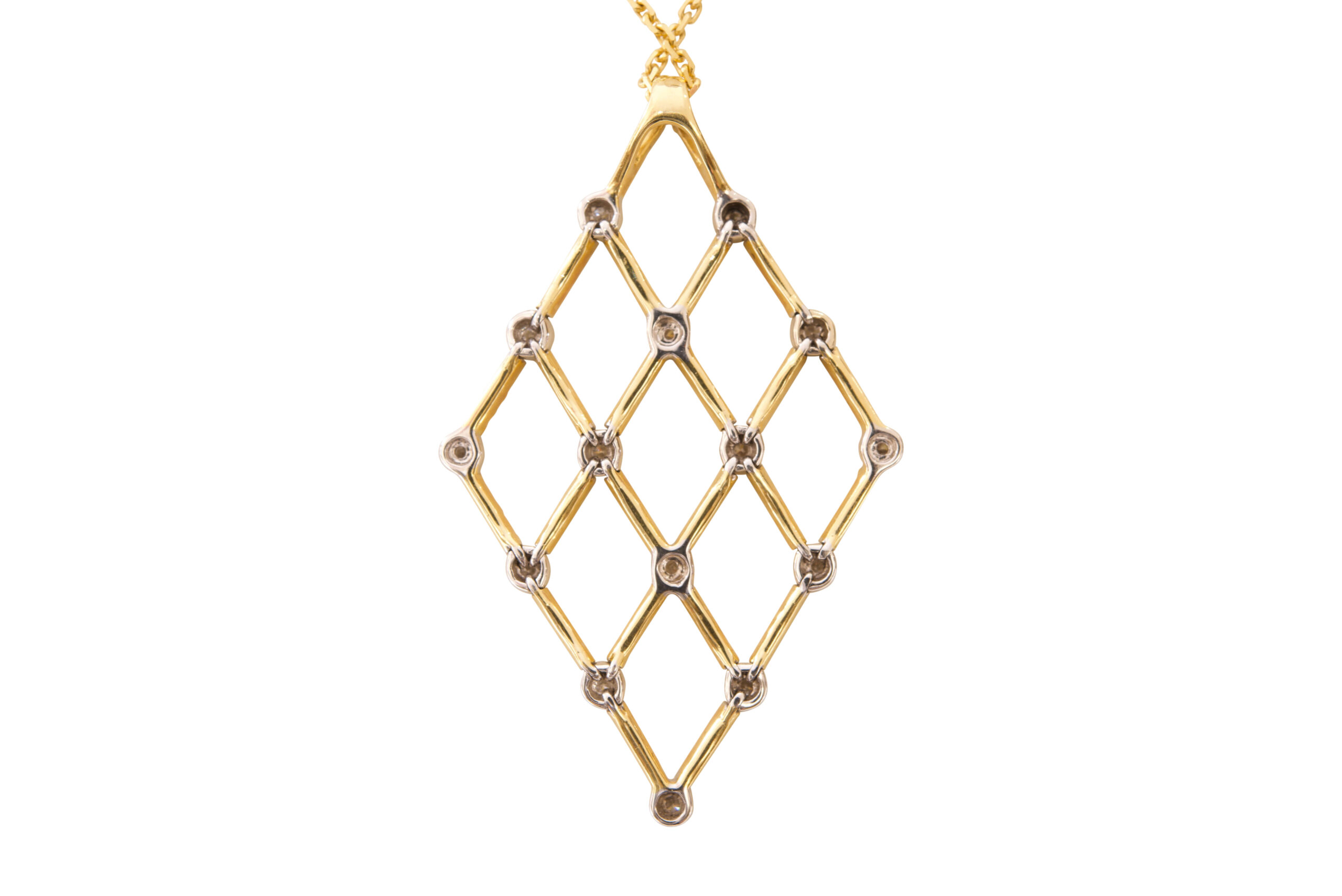 Anhänger mit Karee-Kette 750 Gelbgold/fein mit Brillanten, zusammen ca. 0,512 ct, Gesamtgewicht 8,6 g, Länge ca. 42 cm | Pendant with Karee chain 750 yellow gold/fine with diamonds, together approx. 0.512 ct, total weight 8.6 g, length approx. 42 cm