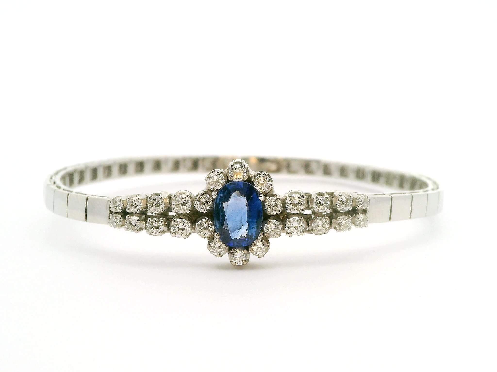 Armband aus Weißgold 750/fein mit Brillanten von zusammen circa 1,21 ct und einem Saphir von circa 1,56 ct, Gesamtgewicht 20,1 g, Länge circa 17,7 cm | Bracelet Made of White Gold 750/Fine with Diamonds of Approximately 1.21 ct Total and a Sapphire of Approximately 1.56 ct, Total Weight 20.1 g, Length Approximately 17.7 cm