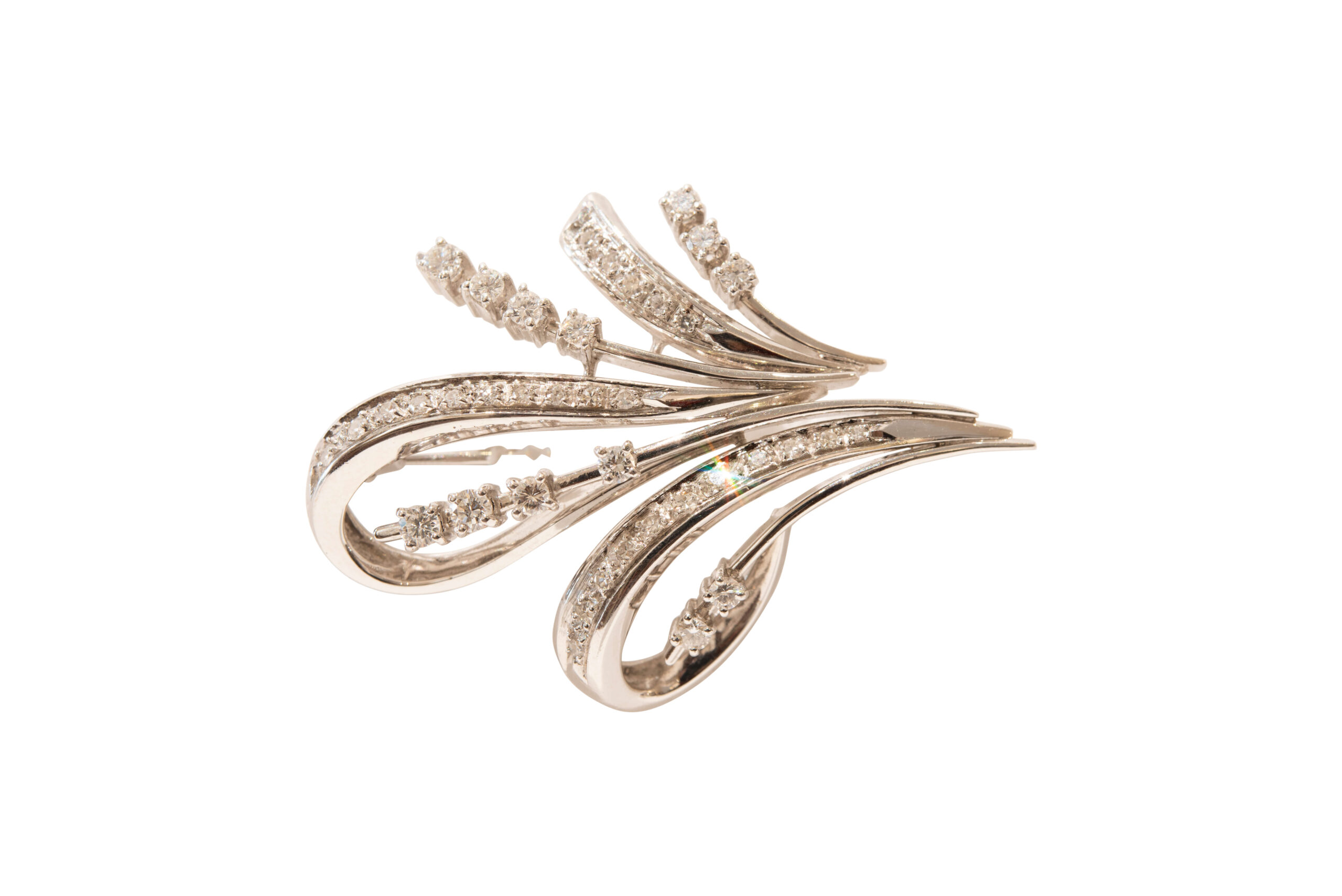 Brosche Weißgold 585/fein mit Brillanten und Achtkant-Diamant, zusammen ca. 1,058 t, Gesamtgewicht 14,6 g | Brooch white gold 585/fine with brilliant-cut diamonds and octagonal diamonds, together approx. 1.058 t, total weight 14.6 g