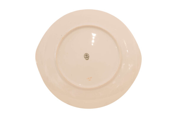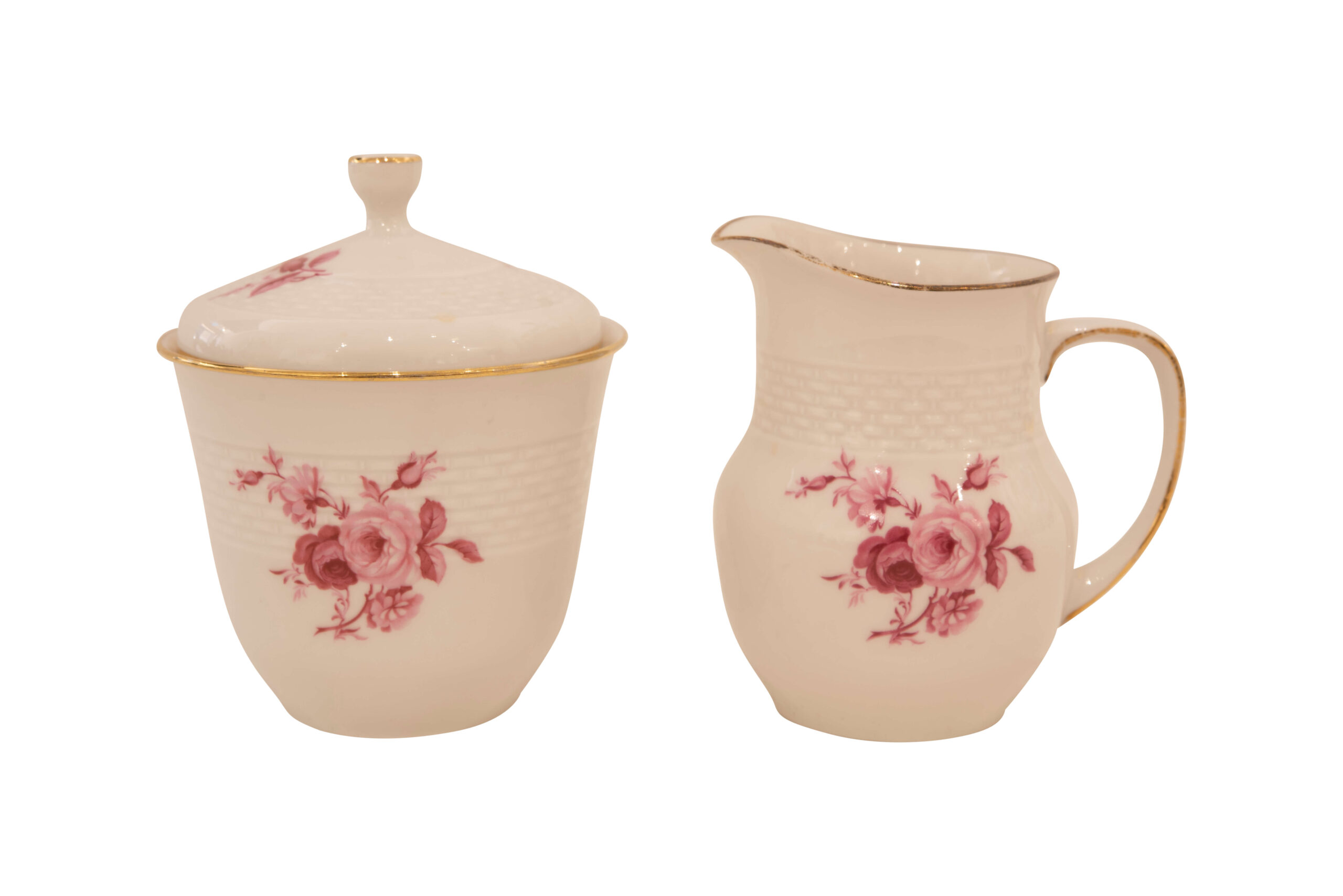 Das Porzellan ist mit purpurfarbenen Blumen bemalt und besteht aus: 11 Kaffeetassen, 12 Unterteller, 11 Dessertteller, 9 Suppenteller, 9 Essteller, 1 Suppenterrine mit Deckel, 2 Schüsseln, 1 Schüssel groß, 1 kleine Servierplatte, 1 große Servierplatte, 1 runde Platte, 1 Zuckerdose mit Deckel, 1 Milchkanne | The porcelain is painted with purple flowers and consists of: 11 coffee cups, 12 saucers, 11 dessert plates, 9 soup plates, 9 dinner plates, 1 soup tureen with lid, 2 bowls, 1 large bowl, 1 small serving platter, 1 large serving platter, 1 round platter, 1 sugar bowl with lid, 1 milk jug