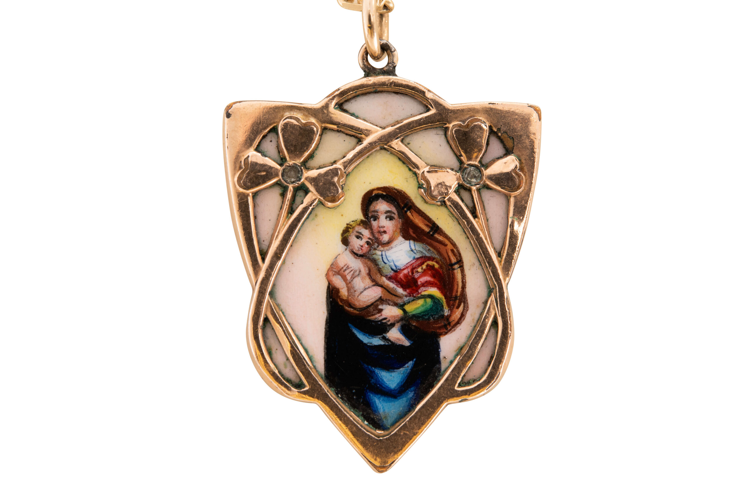 Anhänger ; Kette Roségold und Gelbgold 585/fein emaillierte Mutter Gottes mit Jesuskind, Gesamtgewicht 19,7 g | Pendant ; chain red gold gold and yellow gold 585/fine enameled Mother of God with baby Jesus, total weight 19.7 g