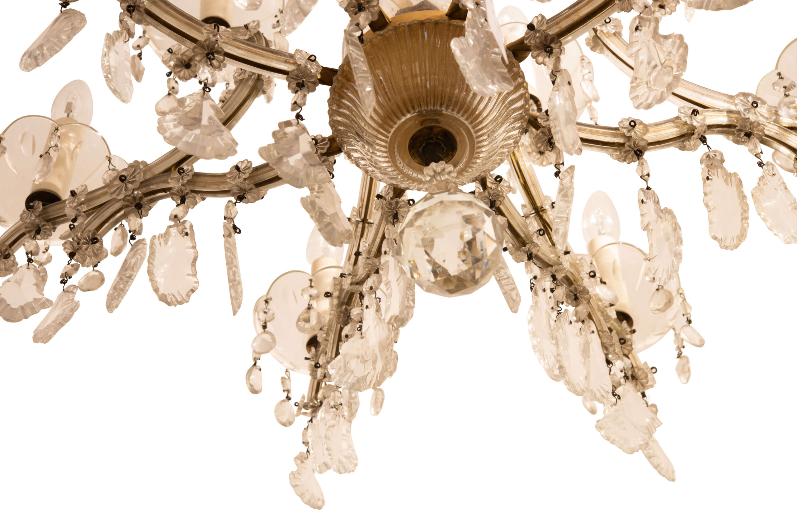 Classic crystal chandelier with brass structure, luxurious crystal chandelier with richly decorated glass elements and curved arms. The brass structure gives the chandelier an elegant touch, while the numerous crystal prisms create an impressive light refraction, dimensions: height 112 cm, width 76 cm | Prunkvoller Kristall-Kronleuchter mit reich verzierten Glaselementen und geschwungenen Armen. Die Messingstruktur verleiht dem Lüster eine edle Note, während die zahlreichen Kristallprismen für eine eindrucksvolle Lichtbrechung sorgen, Maße: Höhe 112 cm, Breite 76 cm