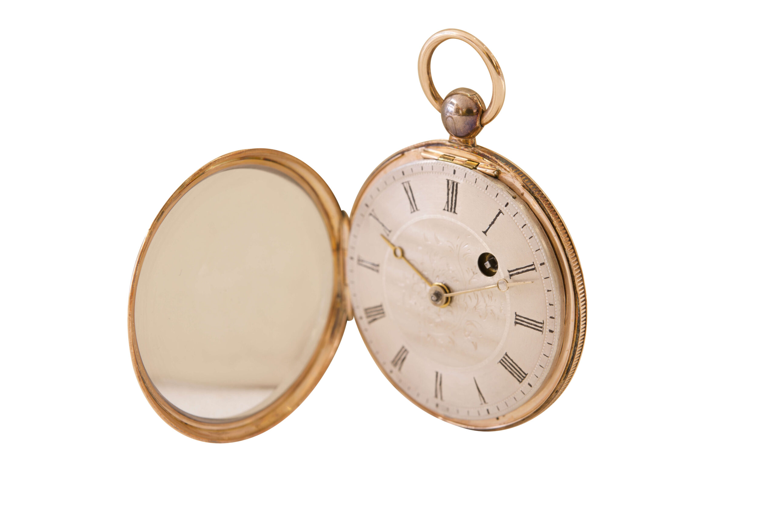 Taschenuhr Rotgold 585/fein, Spindelgang mit Kette und Schnecke, ca. Mitte 19. Jahrhundert, silbernes Zifferblatt, 1 Aufzugs-/Einstellschlüssel | Pocket watch red gold 585/fine, verge escapement with chain and fusee, mid 19th century, silver dial, 1 winding/setting key