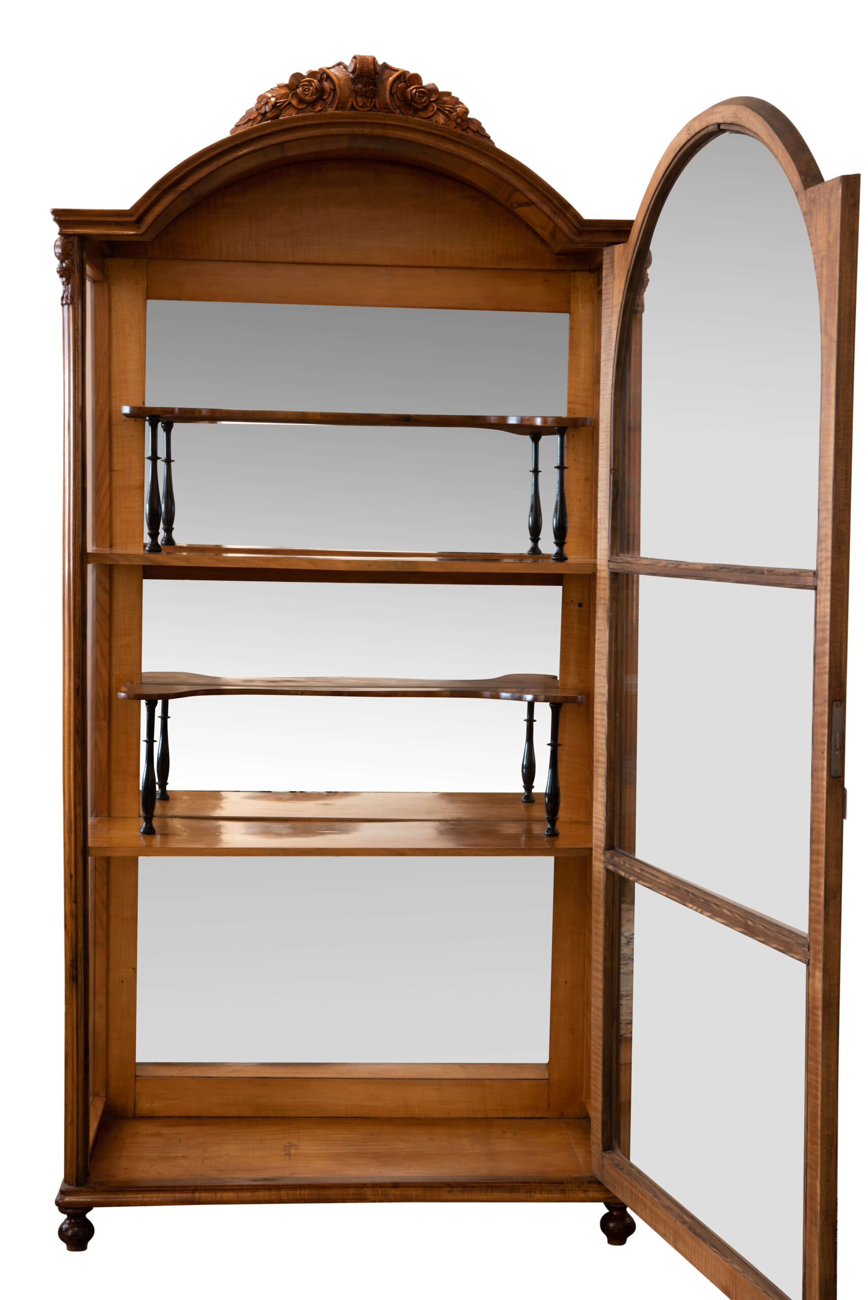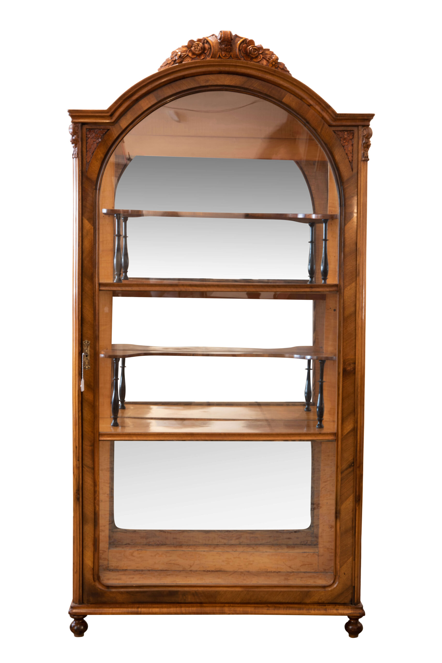 Showcase with curved glass and carved floral motif, high-quality wooden showcase with curved glass and fine floral carvings. The showcase features multiple shelves adorned with turned wooden supports, curved glass front, dimensions: height 181 cm, width 91 cm, depth 40 cm | Holzvitrine mit gebogenem Glas und feinen floralen Schnitzereien. Die Vitrine verfügt über mehrere Ablagen, die durch gedrechselte Holzstützen verziert sind, geschwungene, gläserne Front, Maße: Höhe 181 cm, Breite 91 cm, Tiefe 40 cm