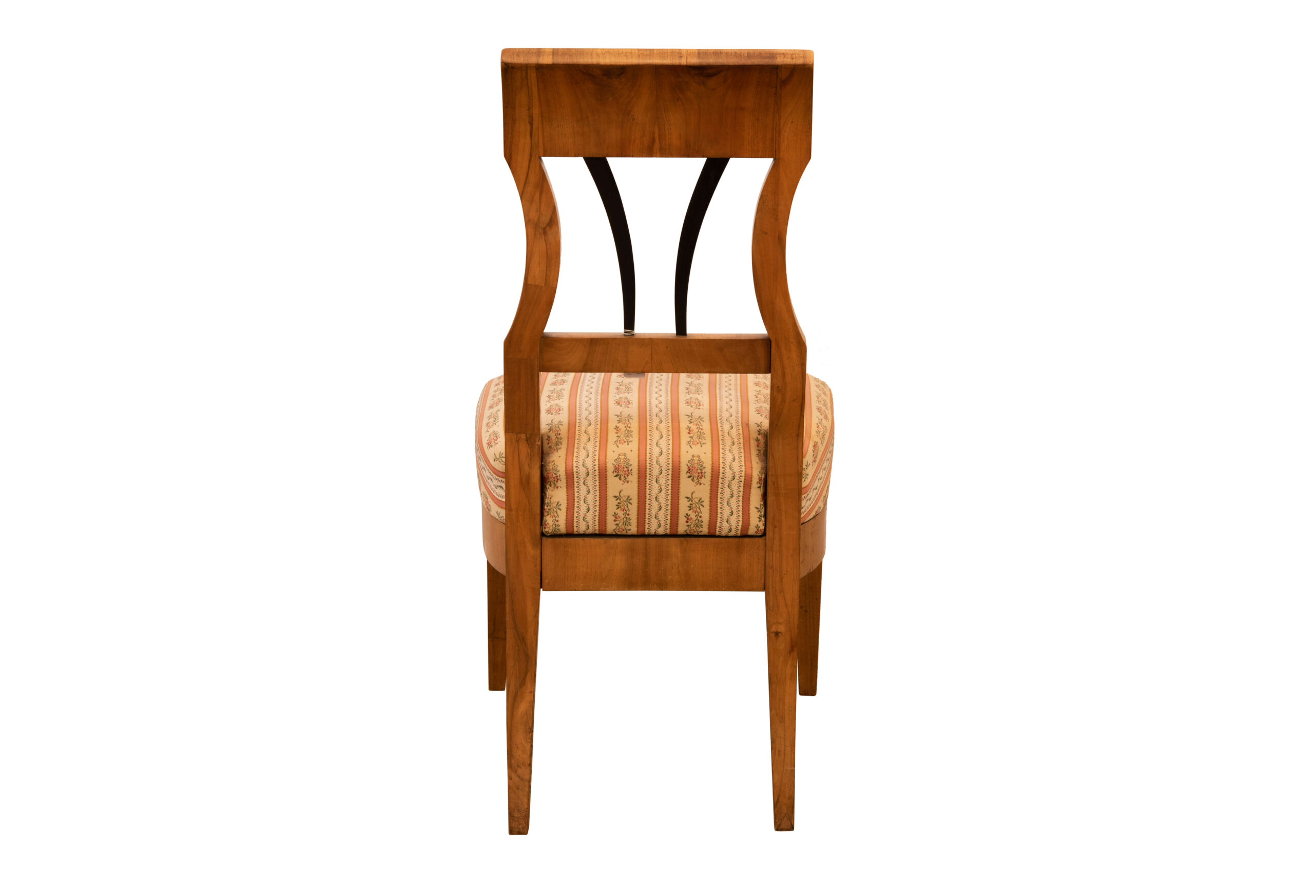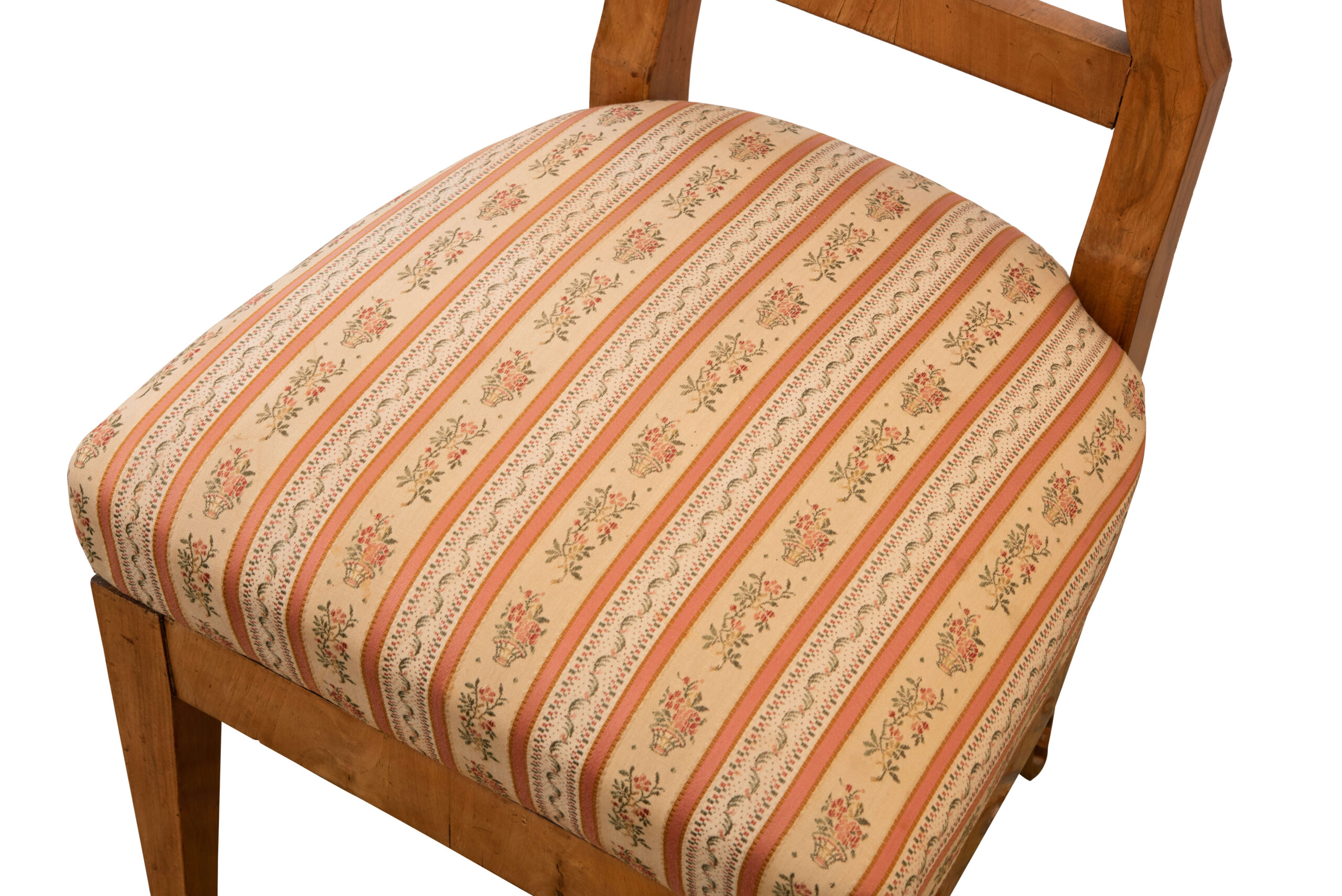 Three wooden chairs, seats covered with flowered fabric, height: 92 cm | Drei Stühle aus Holz, Sitzflächen mit geblümtem Stoff bezogen, Höhe: 92 cm