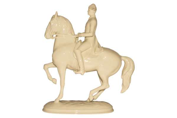 Dargestellt ist ein Reiter mit Pferd “Spanische Hofreitschule”. Entwurf: Albin Döbrich (1872-1945). Die Statue ist aus glasiertem Weißporzellan. Unterglasur Blauer Manufakturstempel. Model Nr. 1590. Maße: Höhe ca. 24,2 cm | Depicting a rider and horse, “Spanish Riding School.” Design: Albin Döbrich (1872-1945). The statue is made of glazed white porcelain. Underglaze blue manufactory stamp. Model No. 1590. Dimensions: Height approx. 24.2 cm