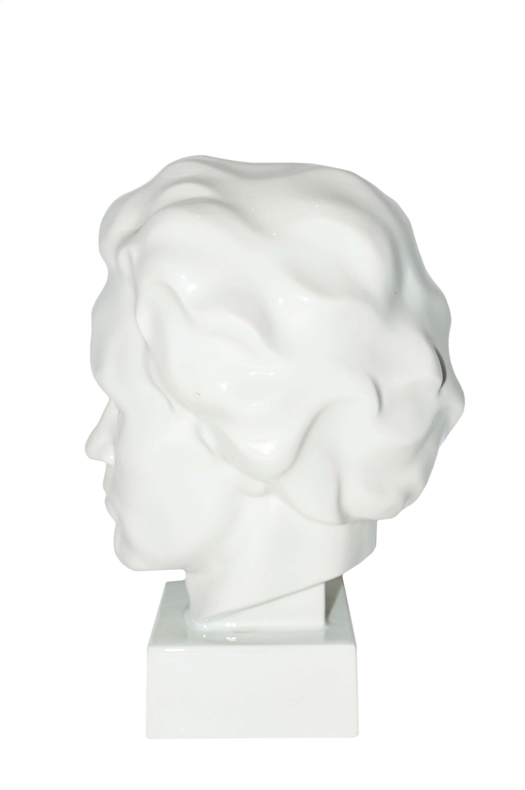 Die Ludwig van Beethoven-Büste basiert auf dem Entwurf von Ferdinand Opitz 1935. Die Ausführende Porzellanmanufaktur ist die Manufaktur Augarten in Wien. Die Büste ist uniweiß glasiert und besitzt die blaue Bodenmarke. Maße: Höhe ca. 25 cm, Gewicht: 1,4 kg, gebraucht | The Ludwig van Beethoven bust is based on a design by Ferdinand Opitz from 1935. The porcelain manufacturer is the Augarten Manufactory in Vienna. The bust is glazed in plain white and bears the blue base mark. Dimensions: Height approx. 25 cm, Weight: 1.4 kg, used