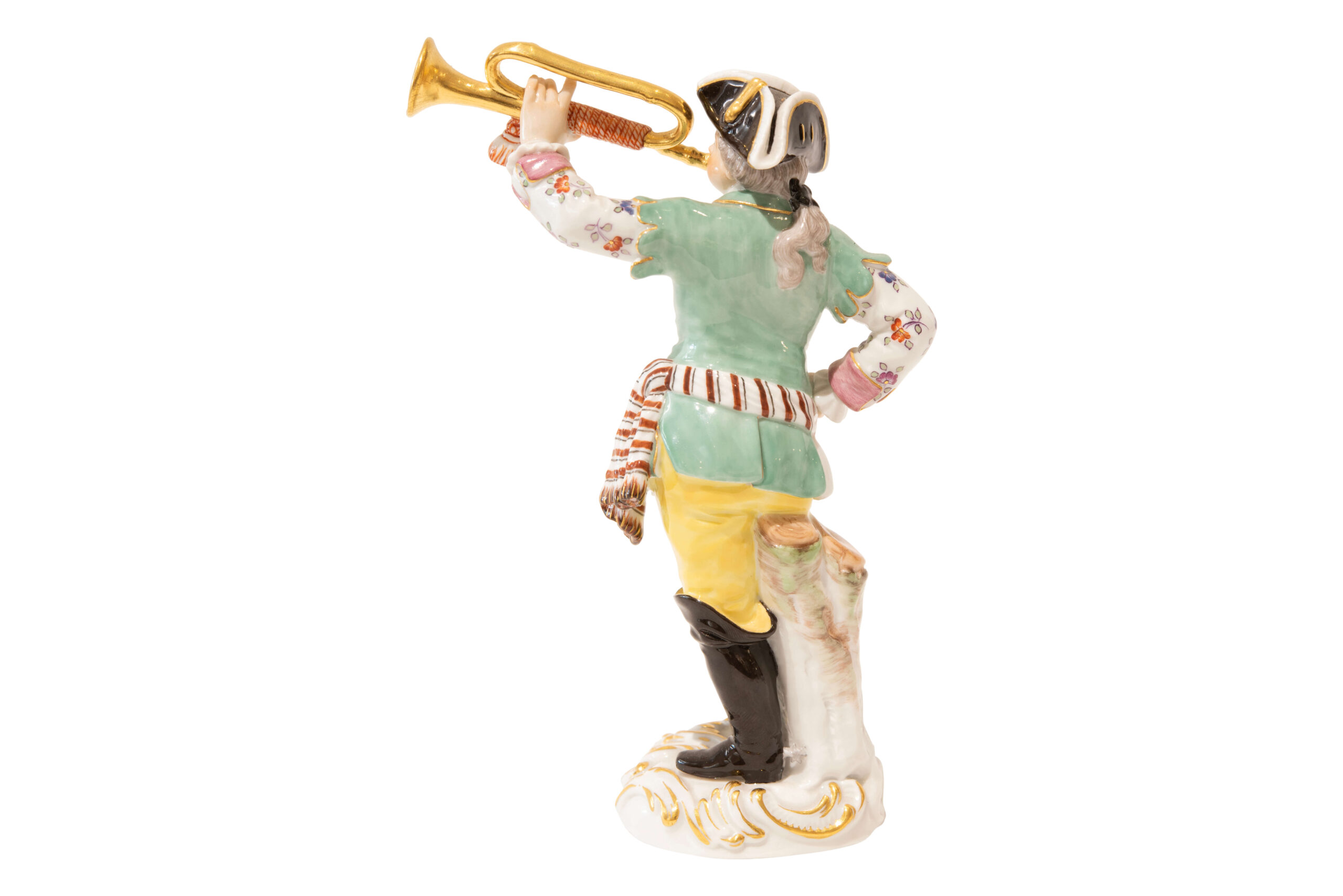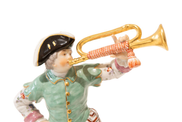 Die Meissener-Figur “Trompeter aus der galanten Kapelle” wurde hergestellt im 20. Jahrhundert. Sie zeigt eine detaillierte Darstellung eines Musikers in elegantem Barockkleid und ist kunstvoll handbemalt. Die Figur ist farbig gefasst, akzentuiert mit feiner Vergoldung und in hervorragender Zustand. Maße: Höhe ca. 14,5 cm | The Meissen figurine “Trumpeter from the Gallant Band” was made in the 20th century. It features a detailed depiction of a musician in elegant Baroque dress and is artfully hand-painted. The figure is colorfully painted, accented with fine gilding, and is in excellent condition. Dimensions: Height approx. 14,5 cm