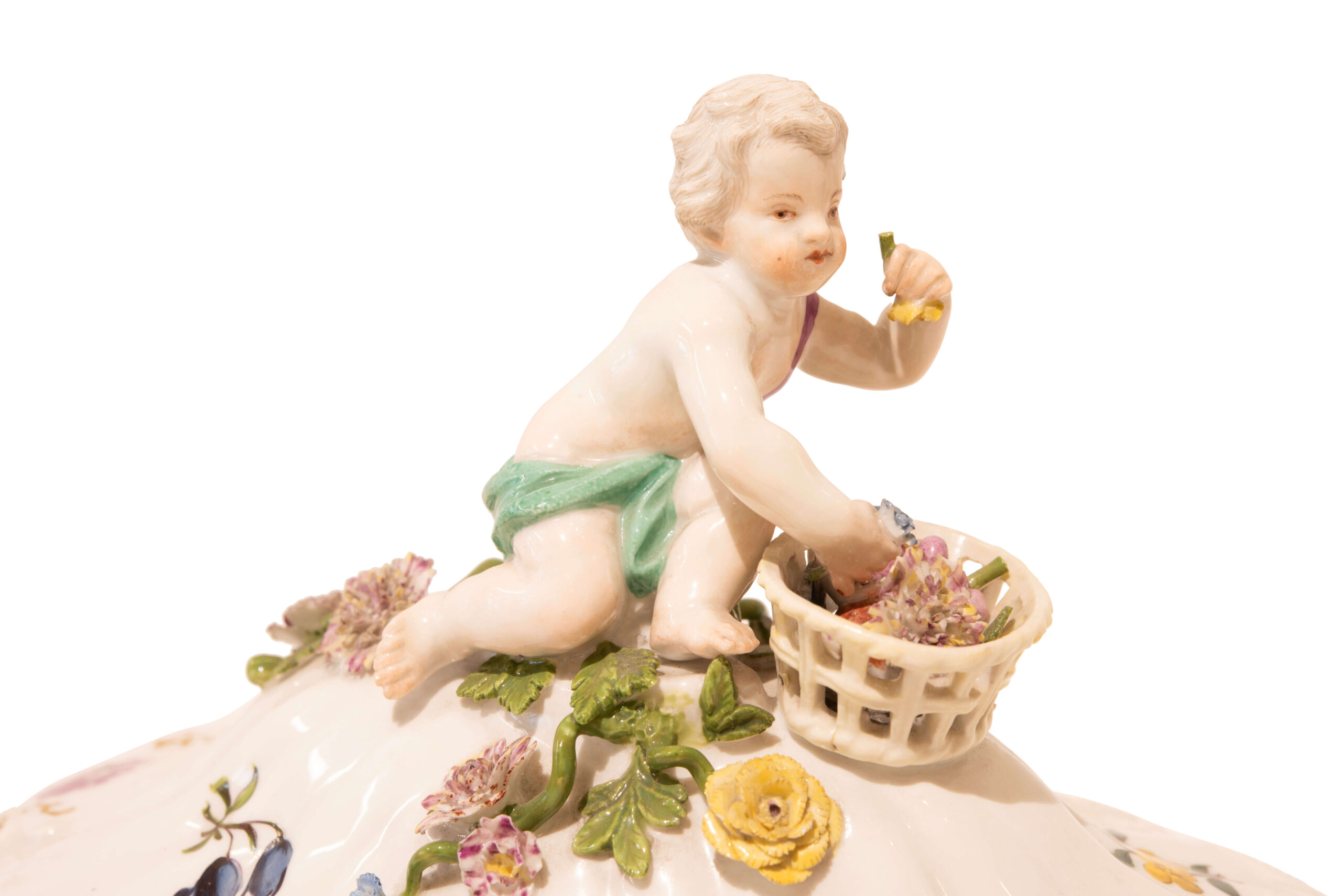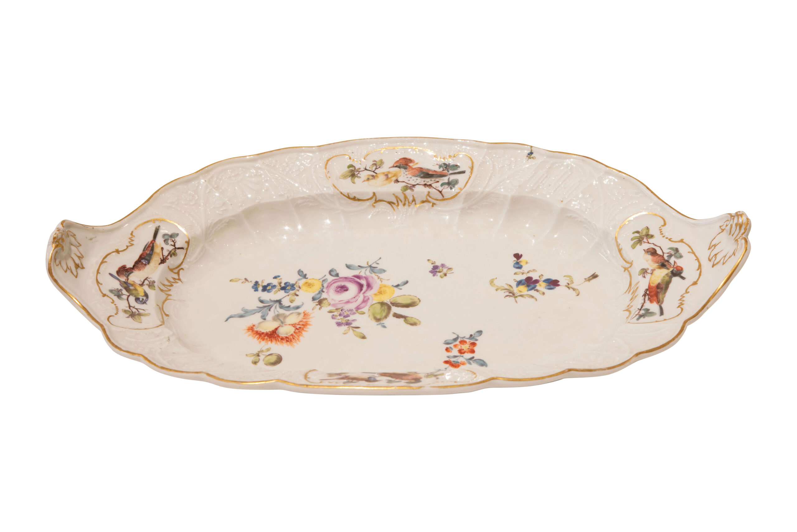 Die Deckelterrine mit Sockel, aus der Meissen Manufaktur um 1750, hat eine elegant gestaltete Form mit einem Doulton Relief. Sie ist weiß glasiert, mit floralen Motiven aufwendig verziert und die Dekoration ist in sehr gutem Zustand. Maße der Terrine ca. 27 x 30 cm, Länge des Sockels ca. 43 cm | This covered tureen with a base, from the Meissen manufactory around 1750, has an elegantly designed form with a Doulton relief. It is glazed white, elaborately decorated with floral motifs, and the decoration is in very good condition. The tureen measures approximately 27 x 30 cm, and the base is approximately 43 cm long
