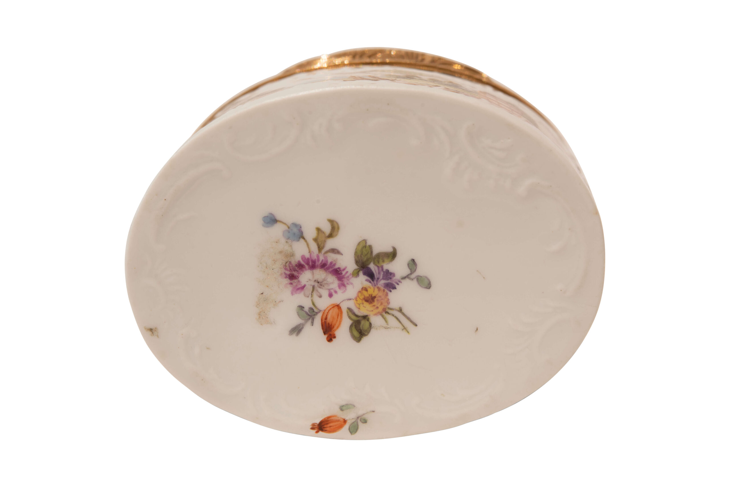 Das Porzellan aus der Meissen Manufaktur um 1760, zeigt eine ovale kunstvoll gestaltet und handbemalt Tabatière. Sie ist verziert mit feine Details, lebendige Farben und das alles auf einer weißen Glasur. Der Rand des Deckels und die Innenfläche der Tabatière sind vergoldet und die dekorative Arbeit ist in einem sehr guten Zustand. Maße: ca. 3,0 cm | This porcelain from the Meissen Manufactory around 1760 features an oval, artfully designed and hand-painted snuffbox. It is decorated with fine details and vibrant colors, all on a white glaze. The rim of the lid and the interior of the snuffbox are gilded, and the decorative work is in very good condition. Dimensions: approx. 3,0 cm