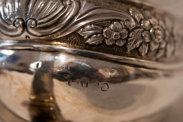 Die antike Teekanne ist mit reichem Blumenmuster verziert und unten monogrammiert MAH, Punzen: W*B – Markenzeichen des Londoner Herstellers William Bateman, Löwe – Silberstandard 925 Sterling. Der Kopf eines Leoparden ist das Zeichen des London Assay Office und der Buchstabe ‘S’ – 1818. Die Teekanne hat Gebrauchsspuren und ist 205 Jahre alt. Altersflecken, kleine Dellen und Risse a den Wärmedämmeinlagen am Griff sind ebenfalls vorhanden. Maße: Gewicht 733,7 g, Höhe: 16,5 cm, Länge 30 cm. | The antique teapot is decorated with a rich floral pattern and monogrammed MAH on the bottom. Hallmarks: W*B – hallmark of the London maker William Bateman, lion – 925 sterling silver standard. The leopard’s head is the mark of the London Assay Office, and the letter ‘S’ – 1818. The teapot shows signs of wear and is 205 years old. Age spots, small dents, and cracks in the heat-insulating inserts on the handle are also present. Dimensions: Weight 733,7 g, height 16.5 cm, length 30 cm. |