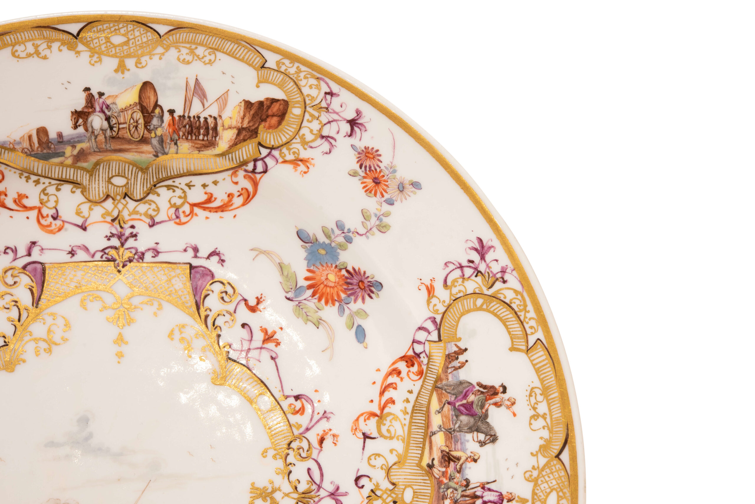 Ein vergoldeter Teller aus der Meissen Manufaktur, um 1740, welcher für den dänischen König angefertigt wurde. Er zeigt eine eindrucksvolle Darstellung von Kriegsszenen, ist kunstvoll handbemalt mit lebendigen Farben und zeugt von einer exquisiten Arbeit in sehr gutem Zustand. Maße: Durchmesser ca. 22 cm | A gilt plate from the Meissen manufactory, circa 1740, made for the Danish king. It features an impressive depiction of war scenes, is artfully hand-painted with vibrant colors, and is a testament to exquisite craftsmanship in very good condition. Dimensions: Diameter approx. 22 cm