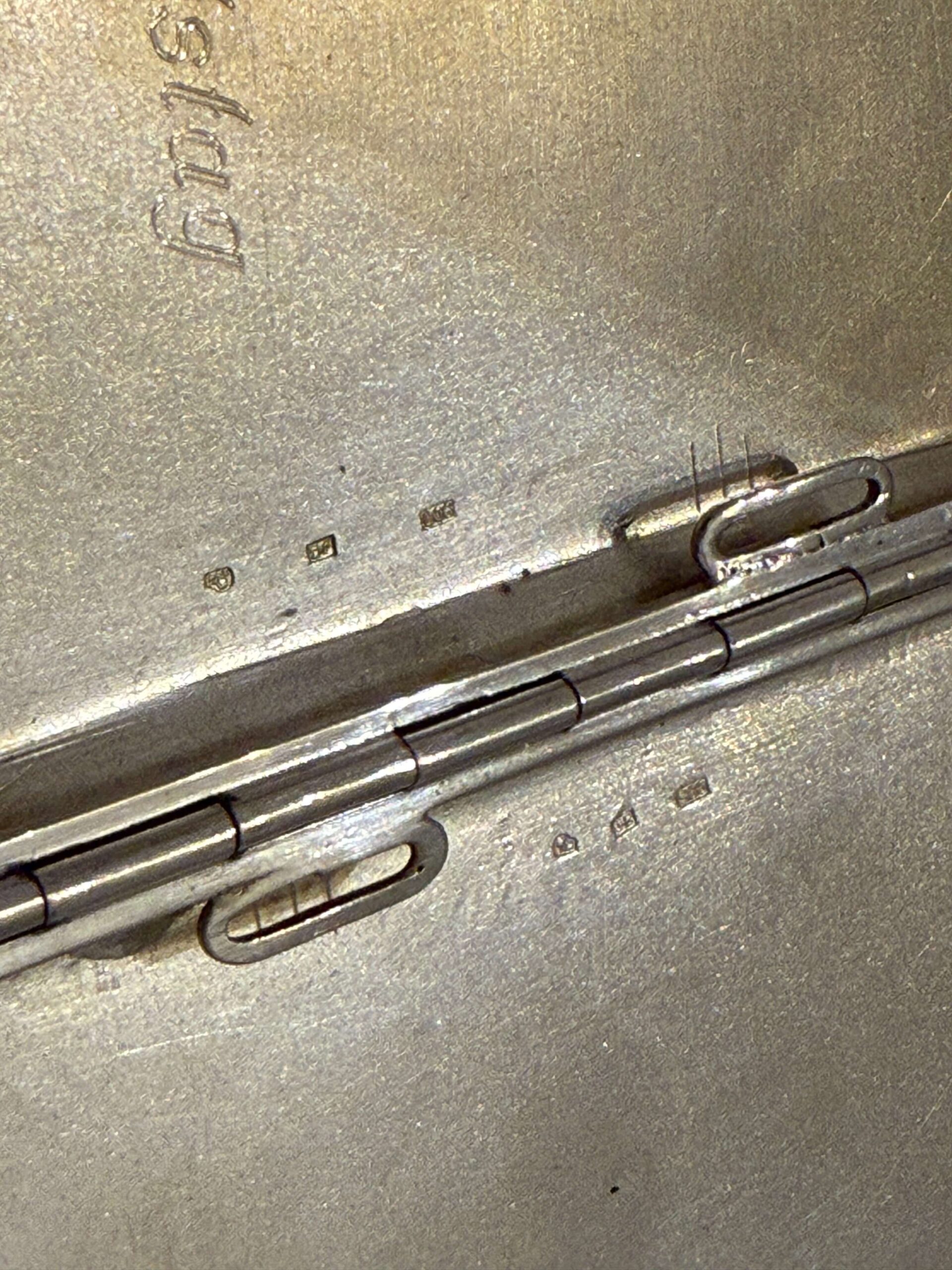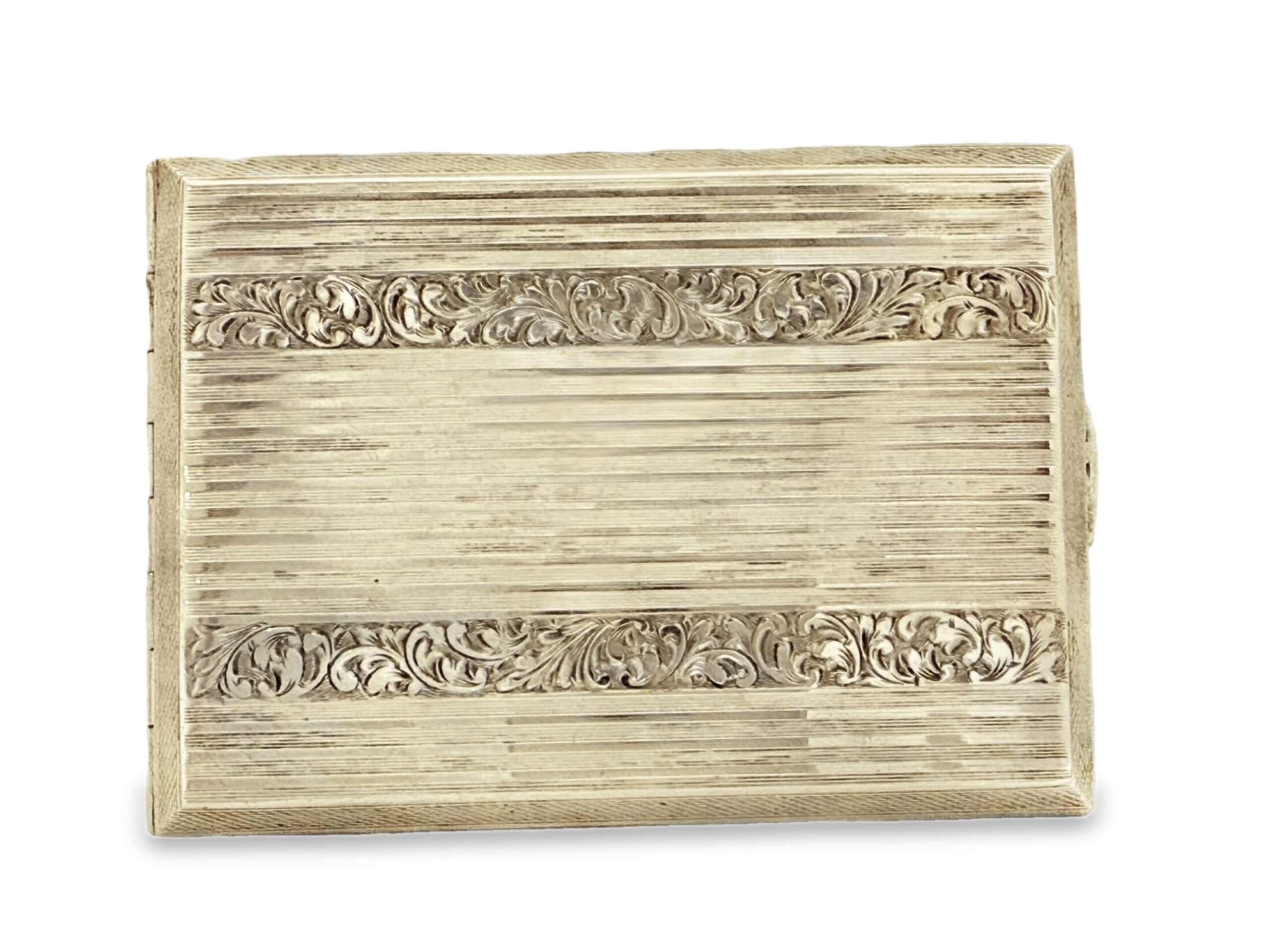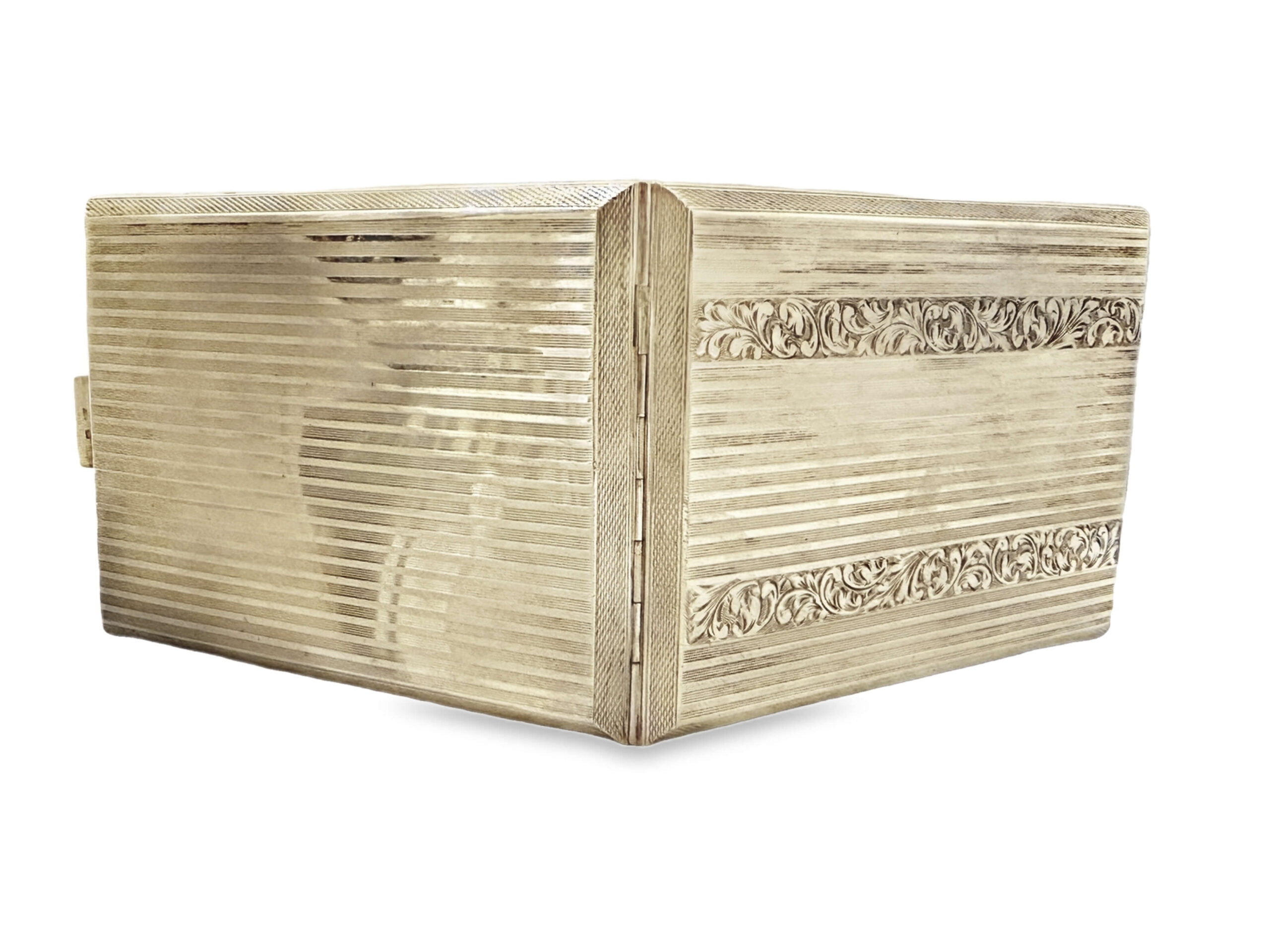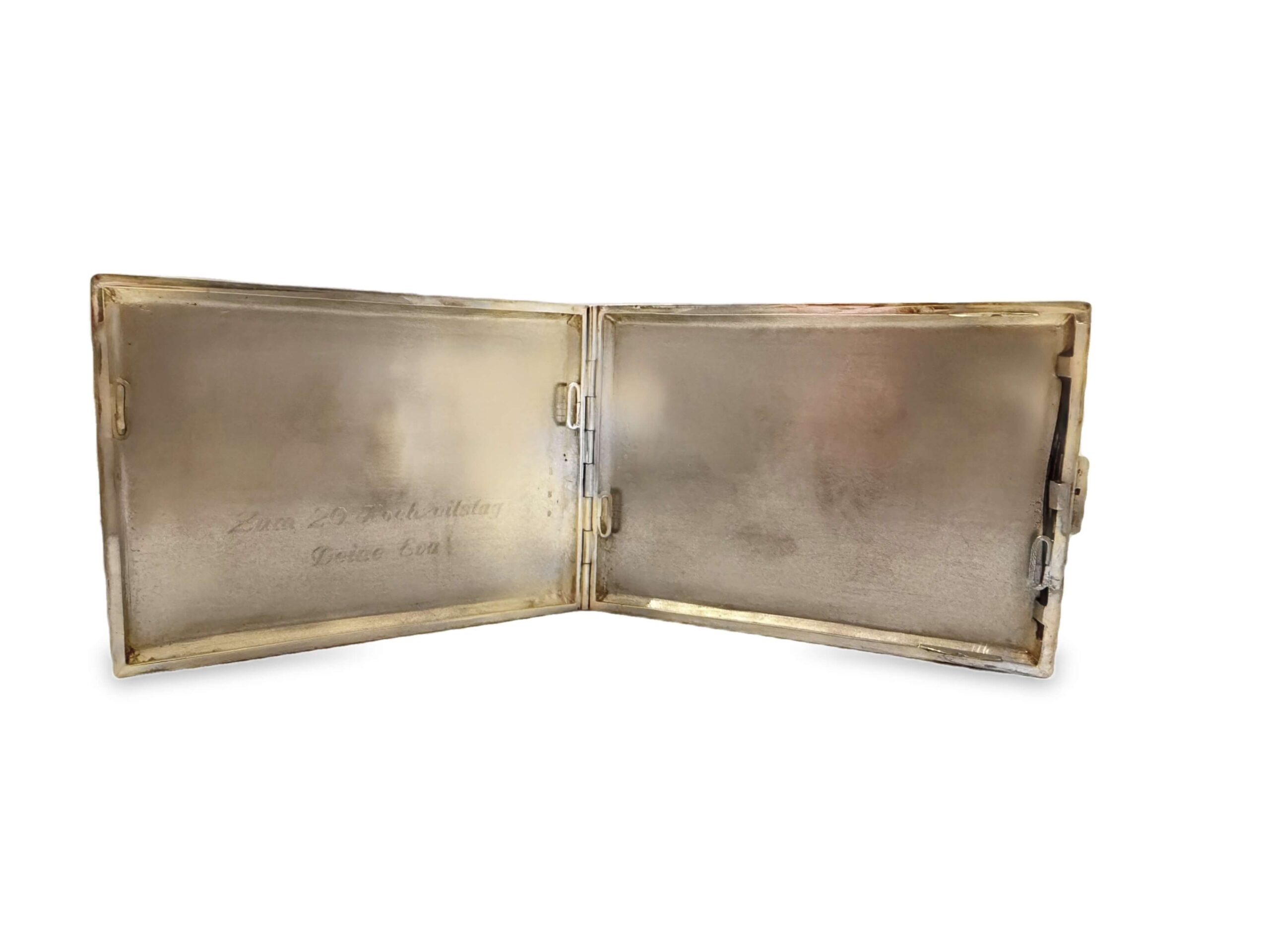 Zigarettendose Silber 900/fein Sprungdeckel Gesamtgewicht 146,3g Maße: 11 x 8cm mit Gravur innen | Cigarette case silver 900/fine, spring lid, total weight 146.3 g, dimensions: 11 × 8 cm, with engraving inside