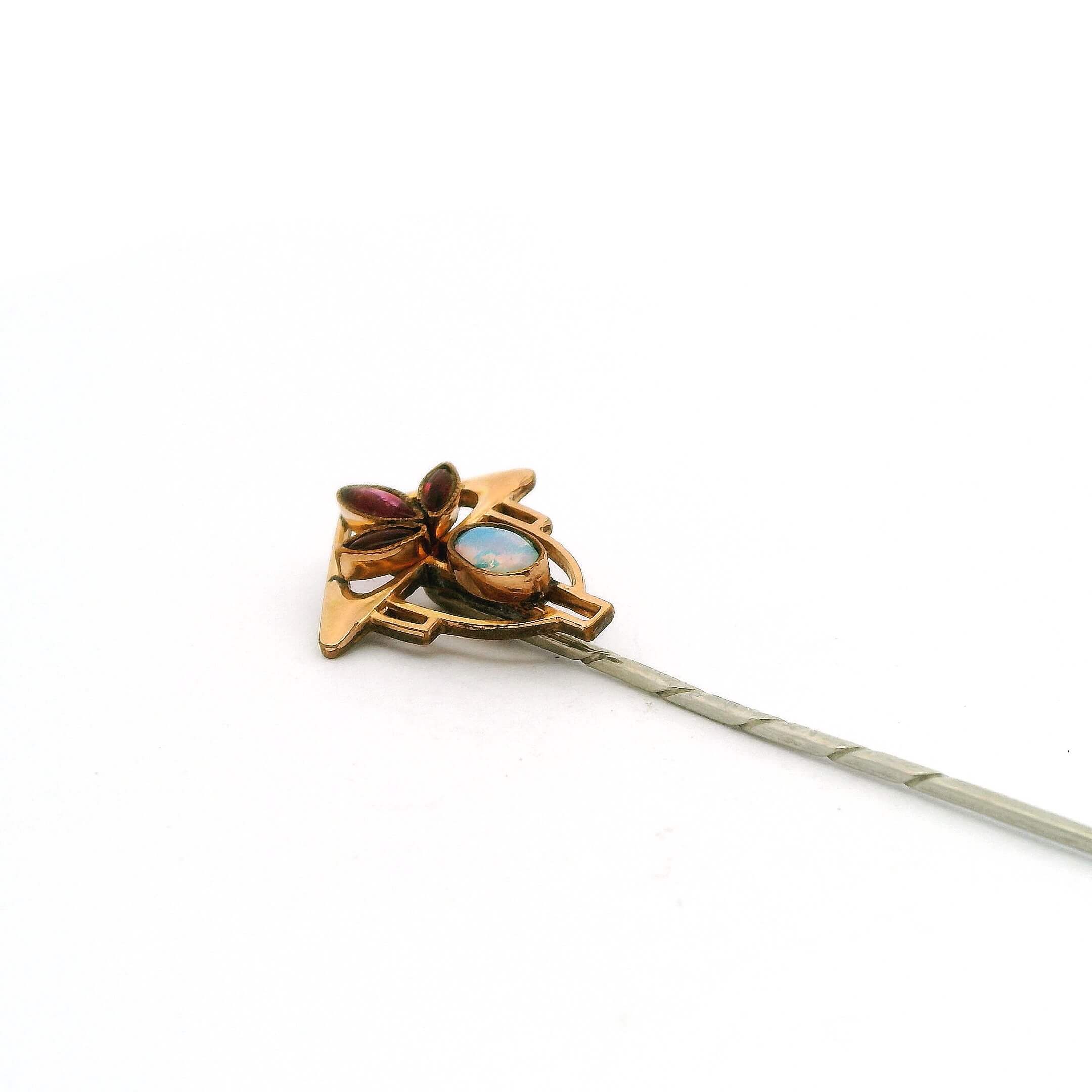 Schmucknadel im Jugendstil Gelbgold 585/fein mit drei Granaten und einem Milchopal, Gesamtgewicht 1,8 g | Art Nouveau Brooch Yellow Gold 585/fine with Three Garnets and One Milk Opal, Total weight 1.8 g