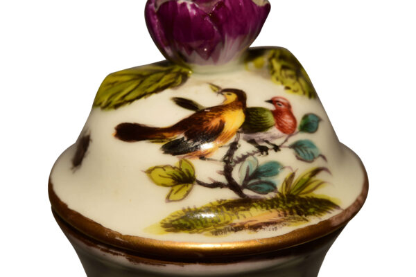 Dieses Set besteht aus 2 Vasen (sechseckige Balusterform), 1 große Vase mit Deckel und 2 kleinere Vasen mit Deckeln. Bemalt mit Blumendekor und Vögeln an der Wandung. AR (Marke Augustus Rex). Die Porzellane aus der Meissener Manufaktur, mit der Marke AR in Unterglasurblau, wurden exklusiv für August den Starken hergestellt. Maße: Höhe 2 x 20 cm, 2 x 20,5 cm, 1 x 25 cm | This set consists of two vases (hexagonal baluster shape), one large vase with lid, and two smaller vases with lids. Painted with floral decorations and birds on the walls. AR (Augustus Rex mark). These porcelain pieces from the Meissen manufactory, bearing the AR mark in underglaze blue, were produced exclusively for Augustus the Strong. Dimensions: Height 2 x 20 cm, 2 x 20.5 cm, 1 x 25 cm