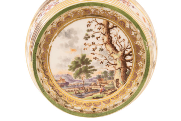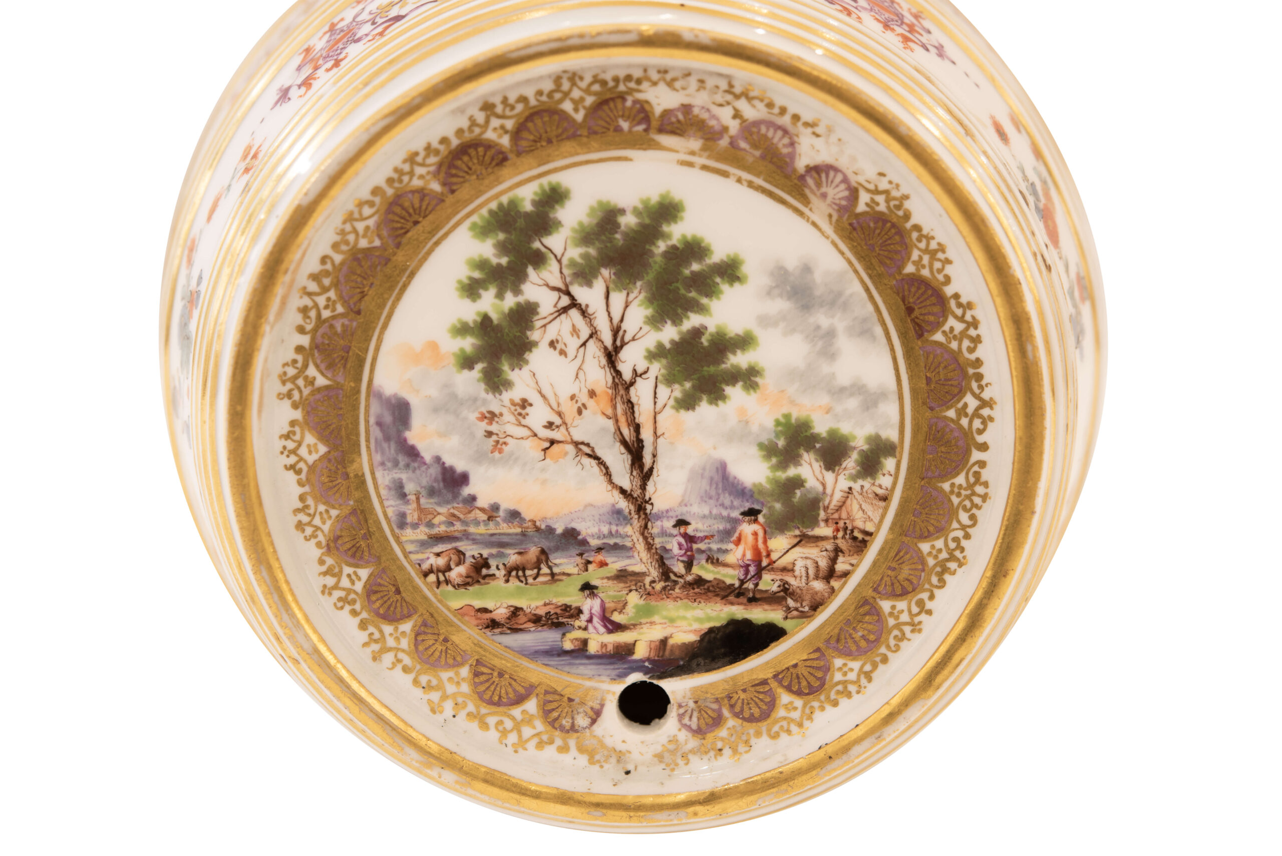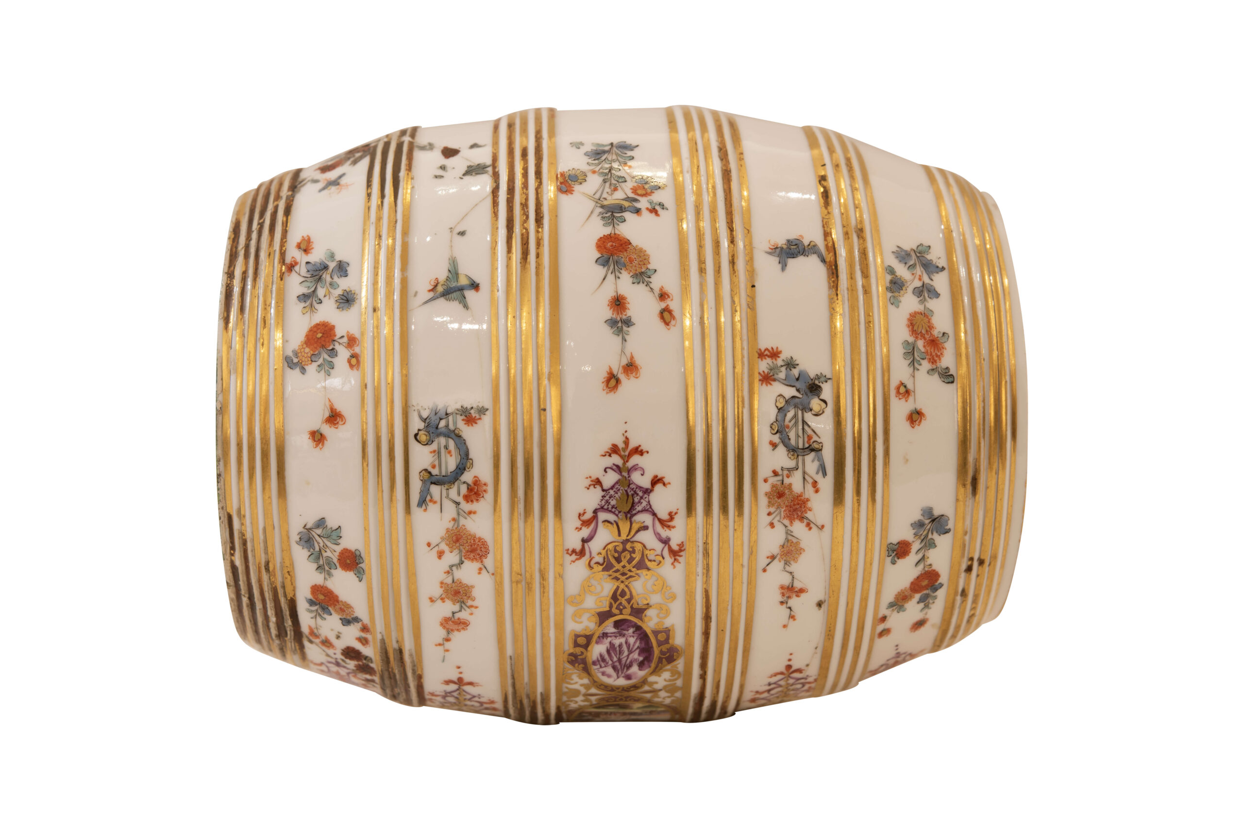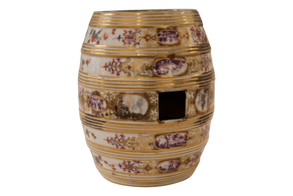 Das Porzellan Likörfass ist tonnenförmig mit einem bauchigen Korpus und durch profilierte Goldstreifen gegliedert. Insgesamt sind es 10 gegliederten Kartuschen, in monochromer eisenroter Malerei mit Kaufmannsszenen. Beschädigte Schwertermarke. Maße: Höhe 18 cm | The porcelain liqueur barrel is barrel-shaped with a bulbous body and structured by profiled gold stripes. It features a total of 10 articulated cartouches, painted in monochrome iron-red with merchant scenes. Damaged crossed swords mark. Dimensions: Height 18 cm
