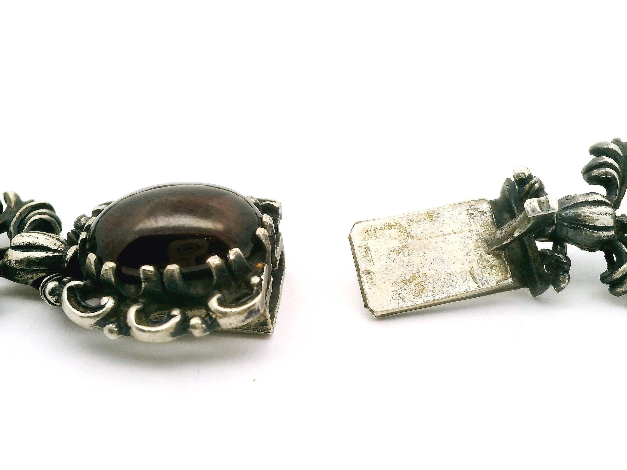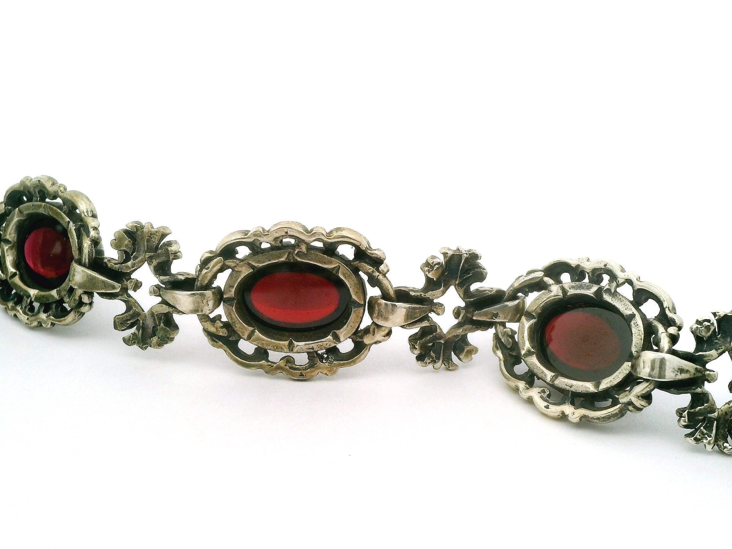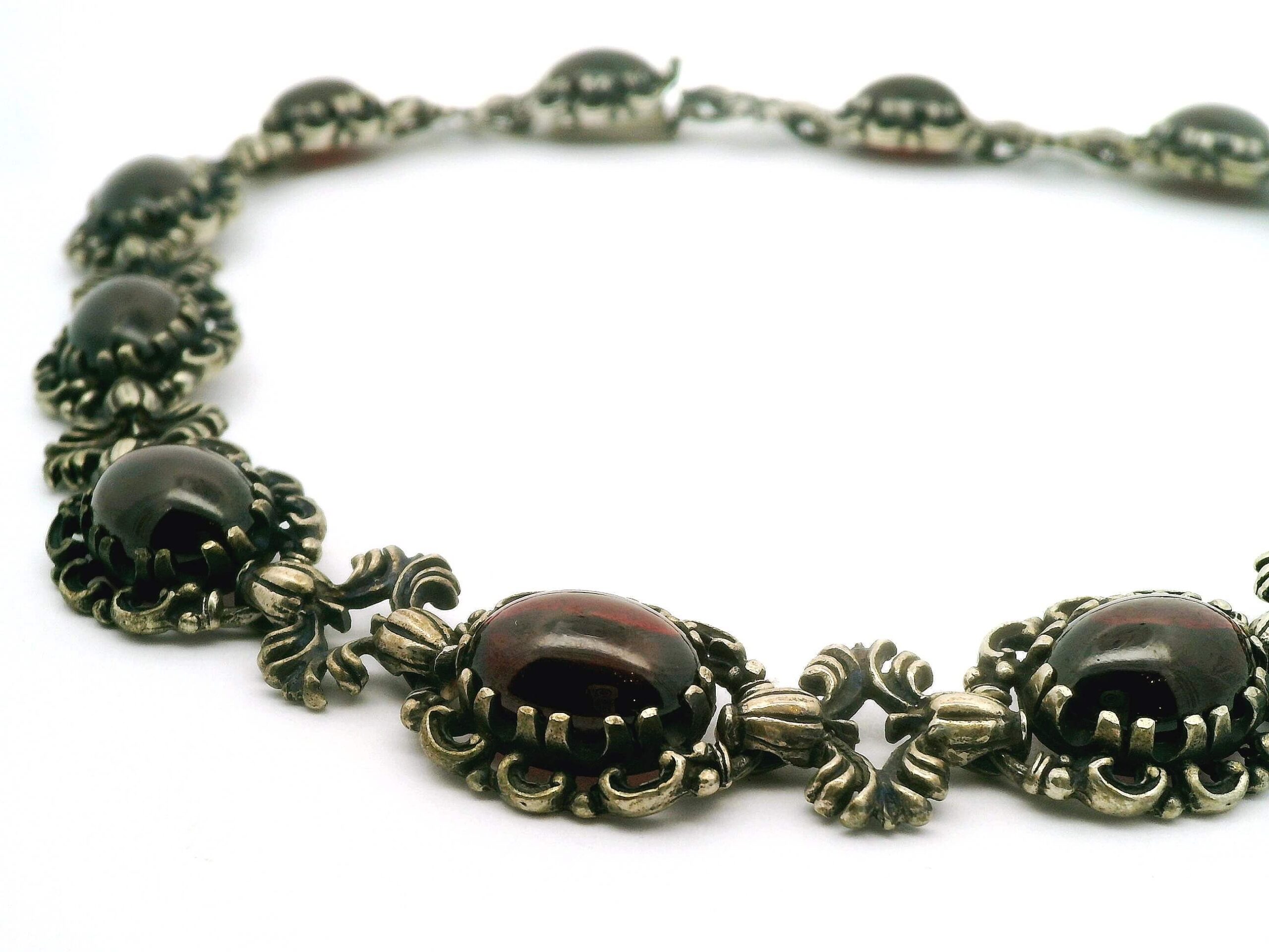 Elegantes Collier aus Silber 835/fein, besetzt mit zwölf Granaten im Cabochonschliff von zusammen etwa 48 ct. Länge ca. 44 cm, Gesamtgewicht 96,82 g | Elegant necklace made of 835 fine silver, set with twelve cabochon-cut garnets totaling approximately 48 ct. Length approx. 44 cm, total weight 96.82 g