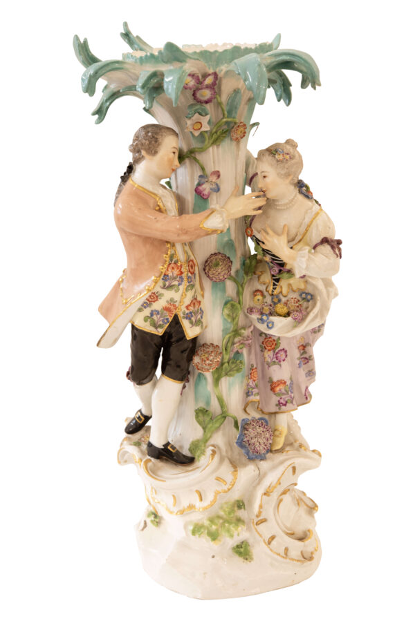 Der Tafelaufsatz aus Porzellan ist farbig und gold staffiert. Der Rundsockel ist ein mit Rocaillen verzierter, stammartiger Schaft, welcher in Palmetten endet. Um den Schaft läuft ein junges Paar. Der Schaft ist mit reicher Blütenauflage wobei die Schale aufsitzend auf den Palmetten fehlt. Maße: Höhe 37 cm | The porcelain centerpiece is decorated with color and gold. The round base is a trunk-like shaft decorated with rocailles, terminating in palmettes. A young couple walks around the shaft. The shaft is richly decorated with flowers, but the bowl resting on the palmettes is missing. Dimensions: Height 37 cm