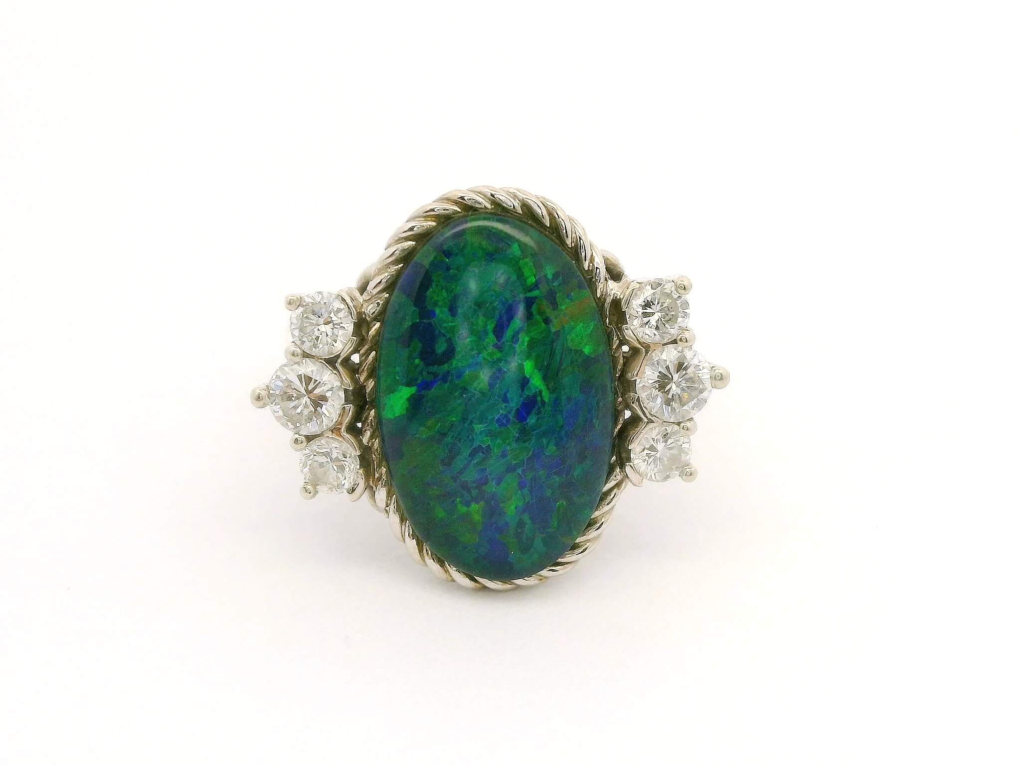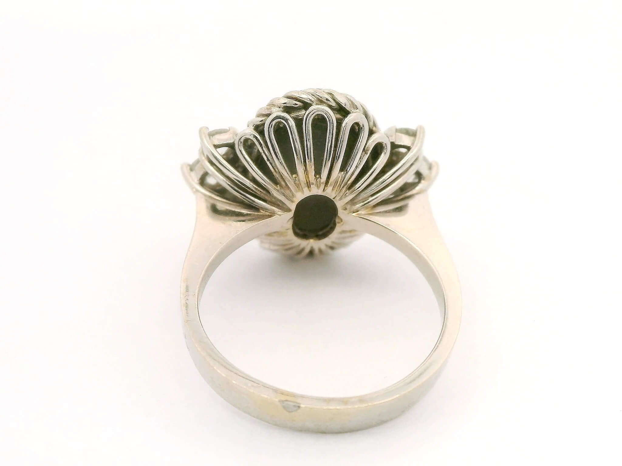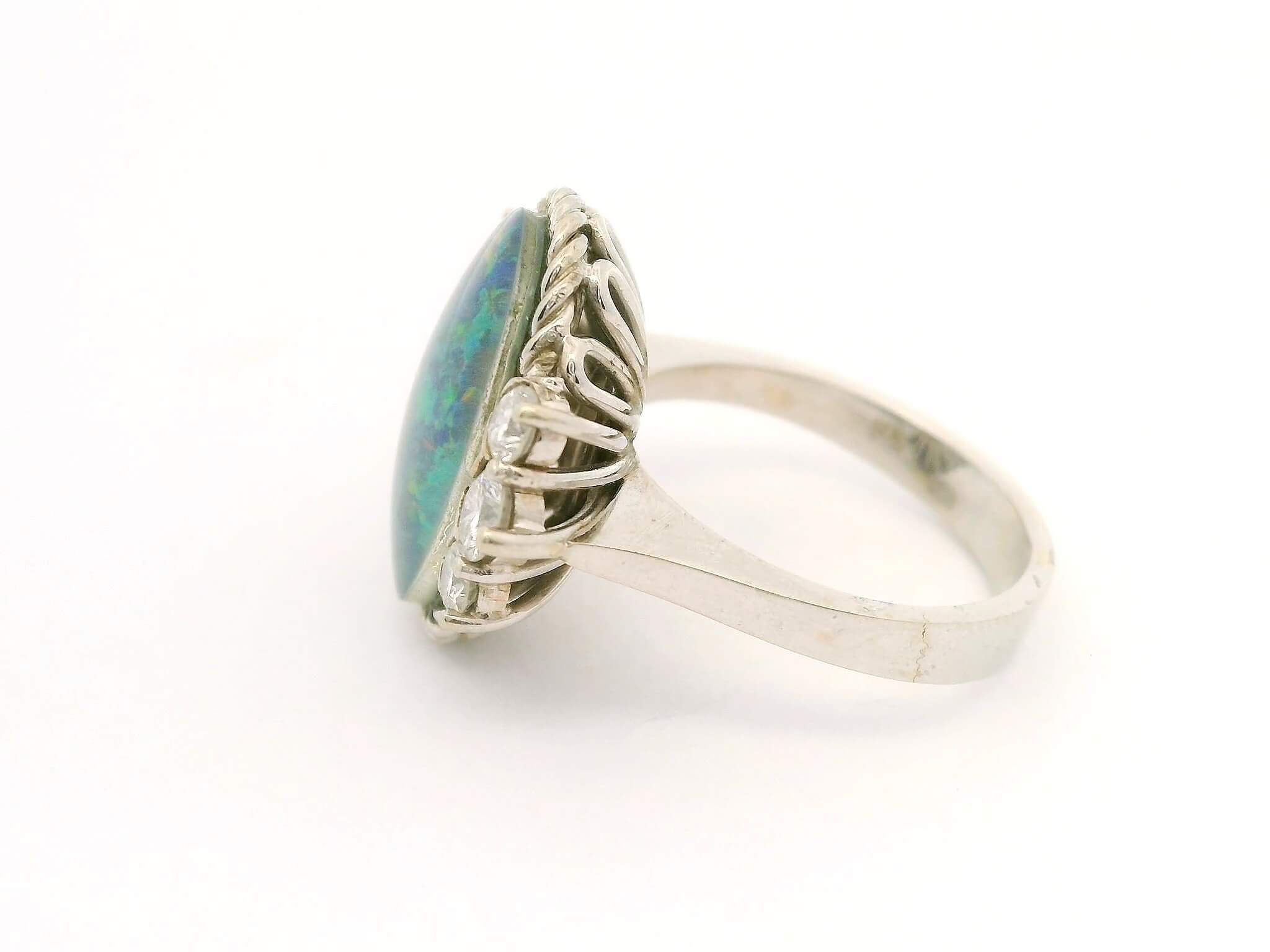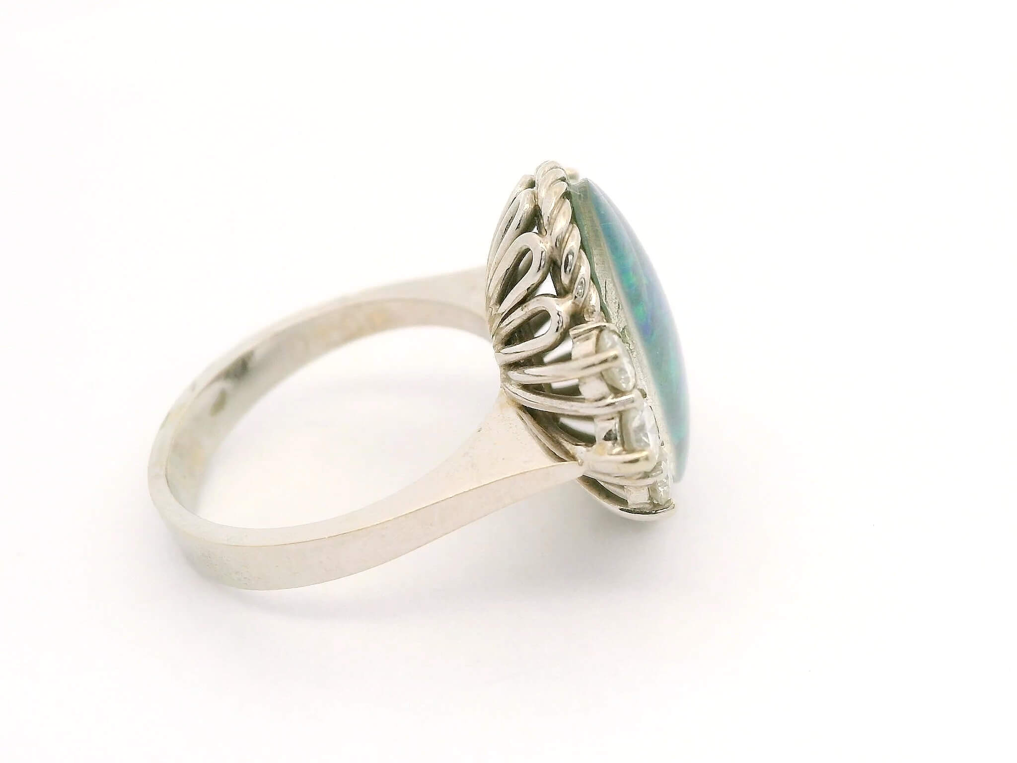 Klassischer Damenring aus Weißgold 585/fein, besetzt mit Brillanten von zusammen etwa 0,52 ct sowie einer ovalen Opaldouplette. Ringweite 51, Gesamtgewicht 8,9 g | Classic ladies’ ring made of 585 fine white gold, set with diamonds totaling approximately 0.52 ct and an oval opal doublet. Ring size 51, total weight 8.9 g
