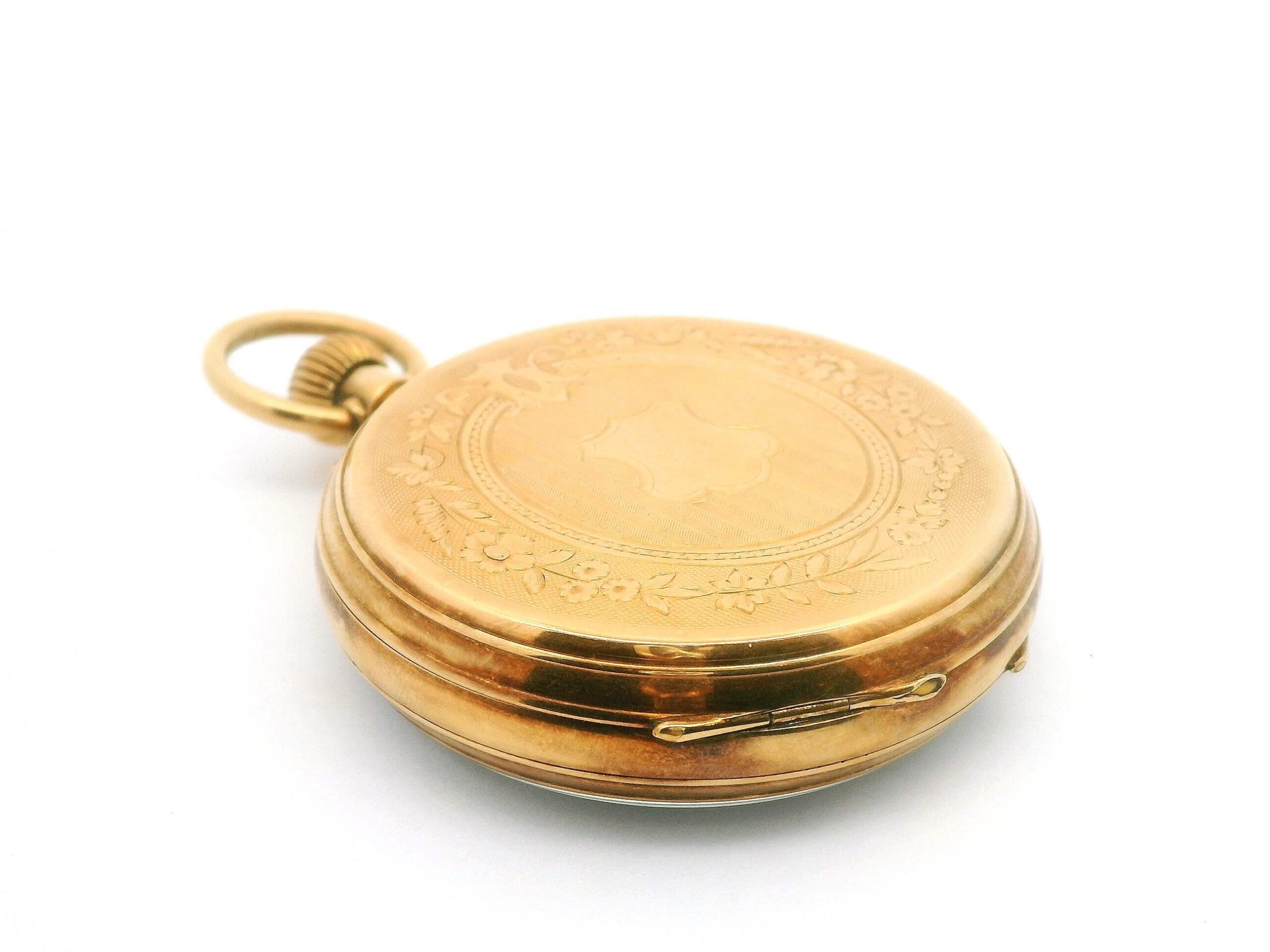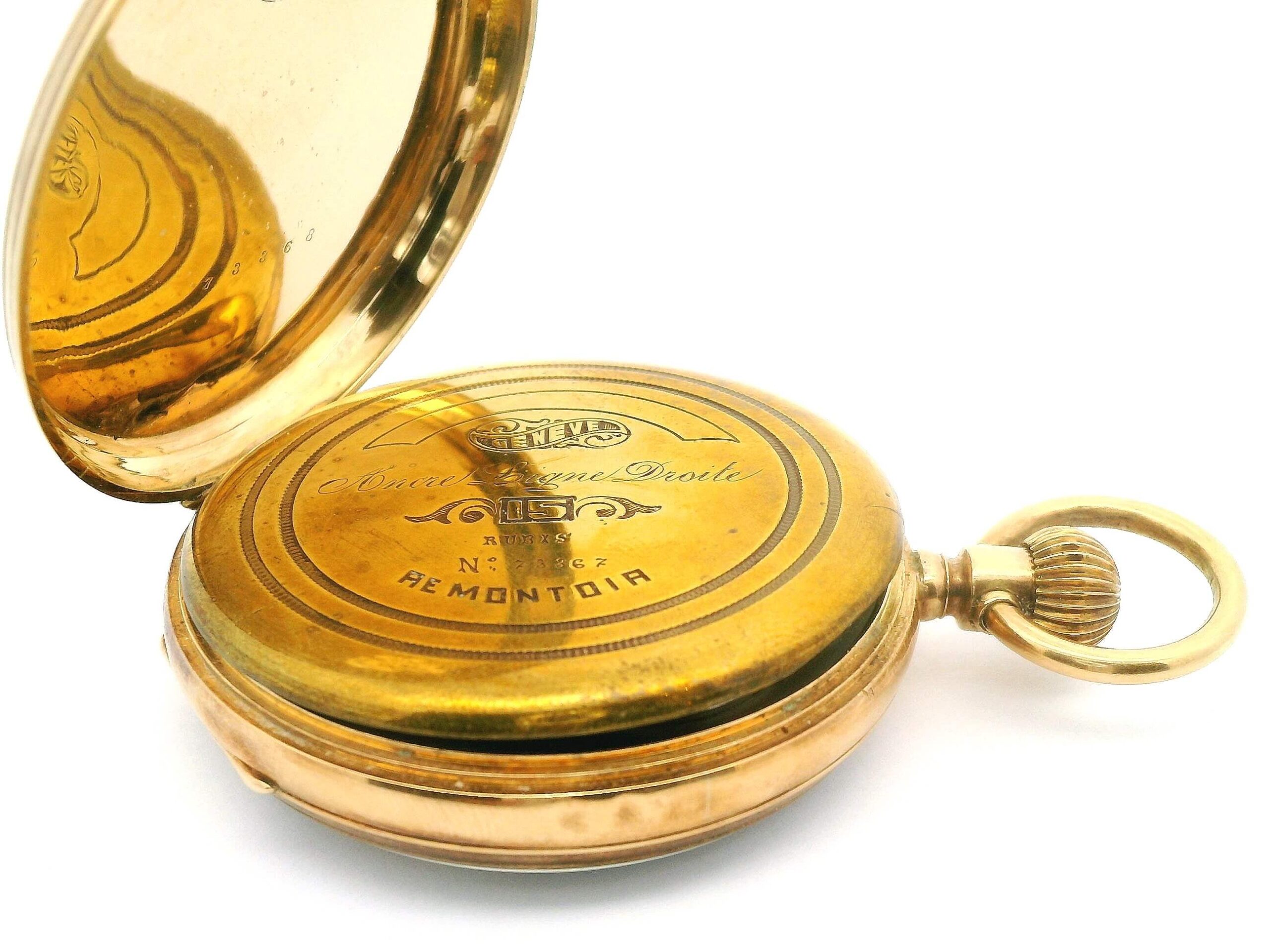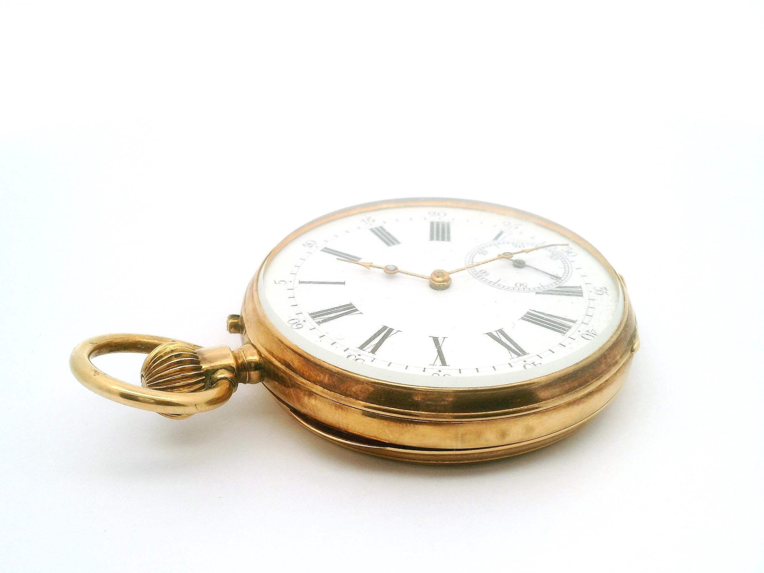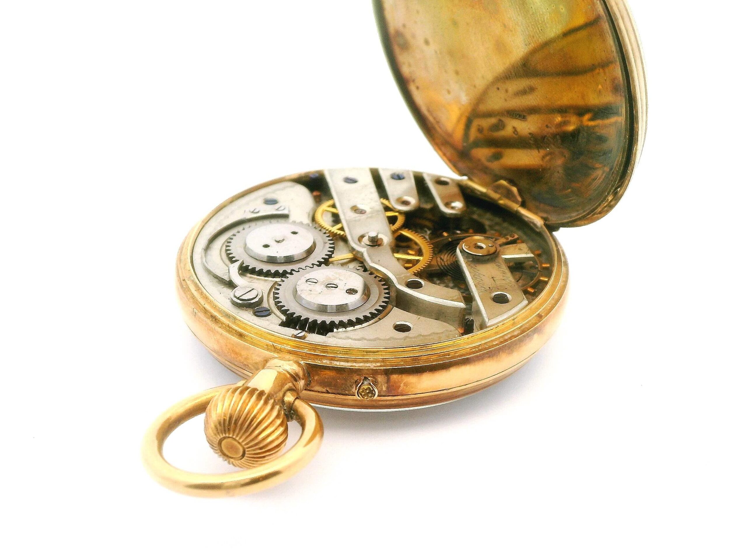 Taschenuhr aus Gelbgold 585/fein, Geneve Ancre Ligne Droite 15 Rubis, Nr. 73367 Aemontoia G.Nr. 73368, mit unbeschädigtem Emaillezifferblatt, Minuten- und Stundenzeiger jeweils mit einer Diamantraute besetzt, Sekundenzeiger auf sechs Uhr, Gehäusedurchmesser 48 mm, Gesamtgewicht 79,4 g, Funktion nicht überprüft | Pocket watch made of yellow gold 585/fine, Geneve Ancre Ligne Droite 15 Rubis, No. 73367 Aemontoia G.No. 73368, with intact enamel dial, minute and hour hands each set with a diamond-shaped ornament, seconds hand at six o’clock, case diameter 48 mm, total weight 79.4 g, function not tested
