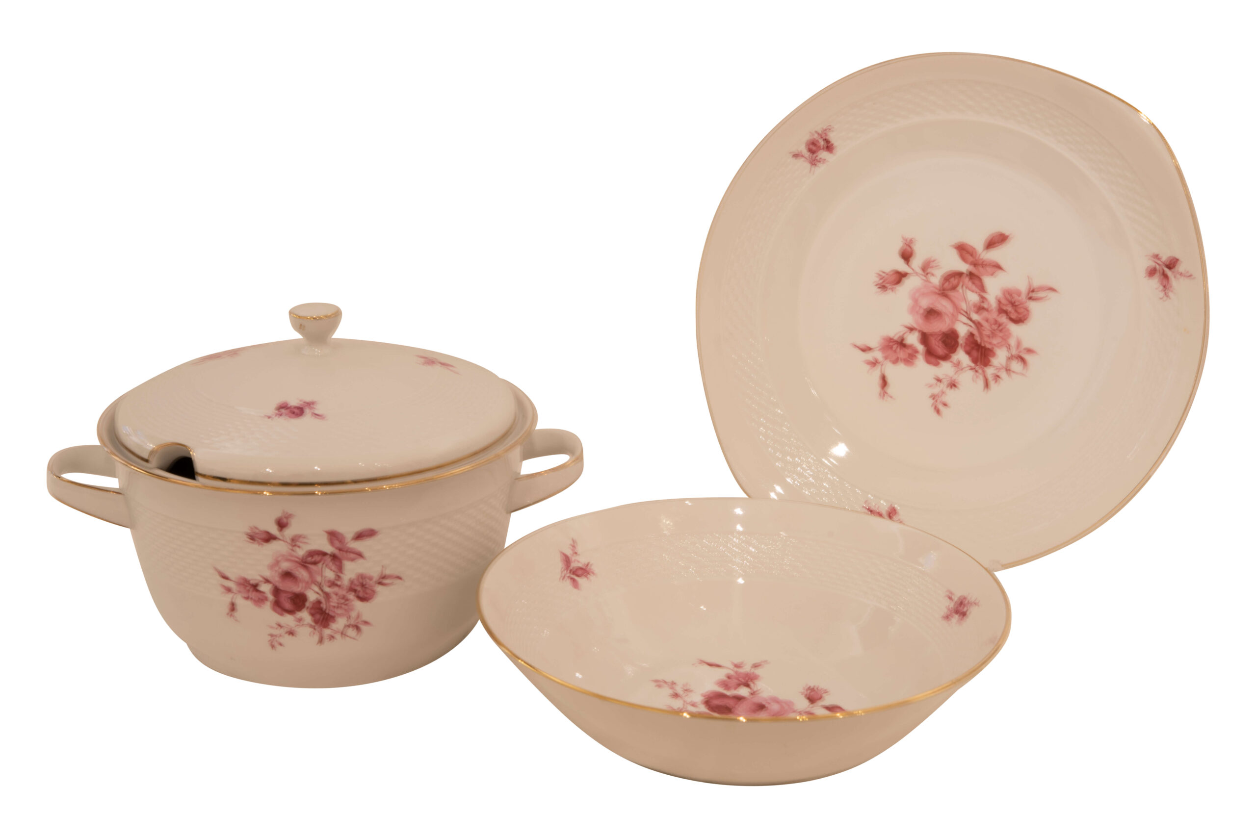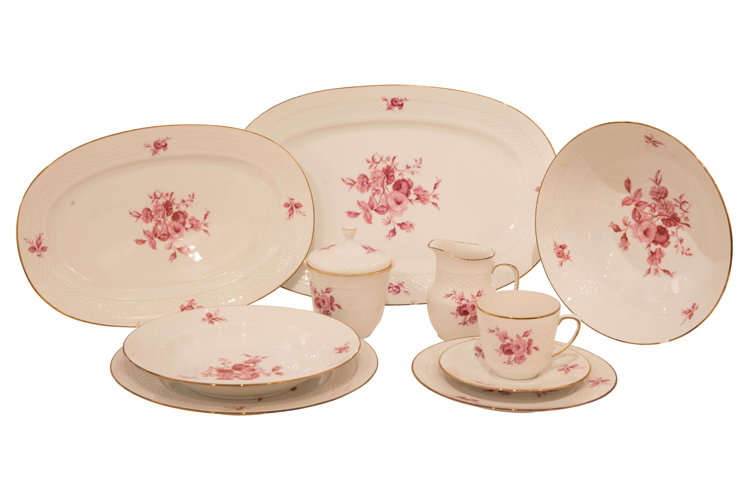 Das Porzellan ist mit purpurfarbenen Blumen bemalt und besteht aus: 11 Kaffeetassen, 12 Unterteller, 11 Dessertteller, 9 Suppenteller, 9 Essteller, 1 Suppenterrine mit Deckel, 2 Schüsseln, 1 Schüssel groß, 1 kleine Servierplatte, 1 große Servierplatte, 1 runde Platte, 1 Zuckerdose mit Deckel, 1 Milchkanne | The porcelain is painted with purple flowers and consists of: 11 coffee cups, 12 saucers, 11 dessert plates, 9 soup plates, 9 dinner plates, 1 soup tureen with lid, 2 bowls, 1 large bowl, 1 small serving platter, 1 large serving platter, 1 round platter, 1 sugar bowl with lid, 1 milk jug