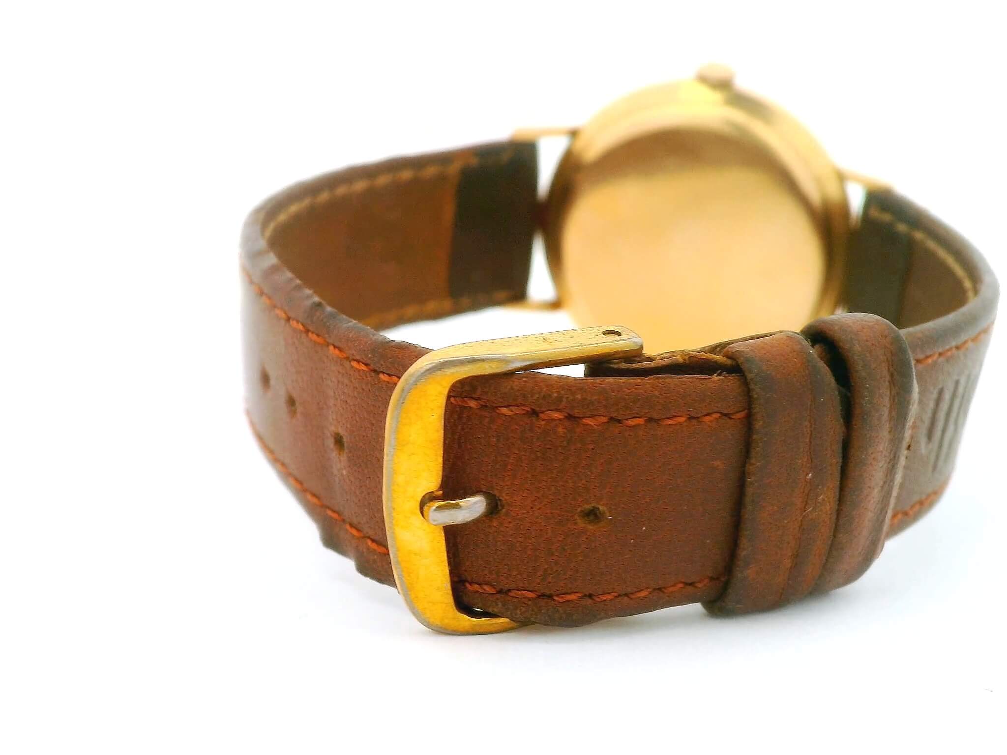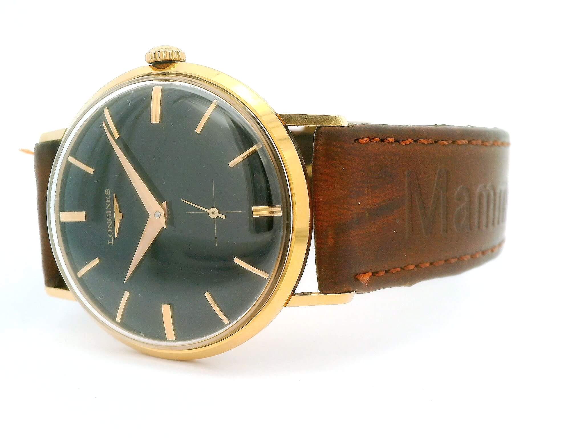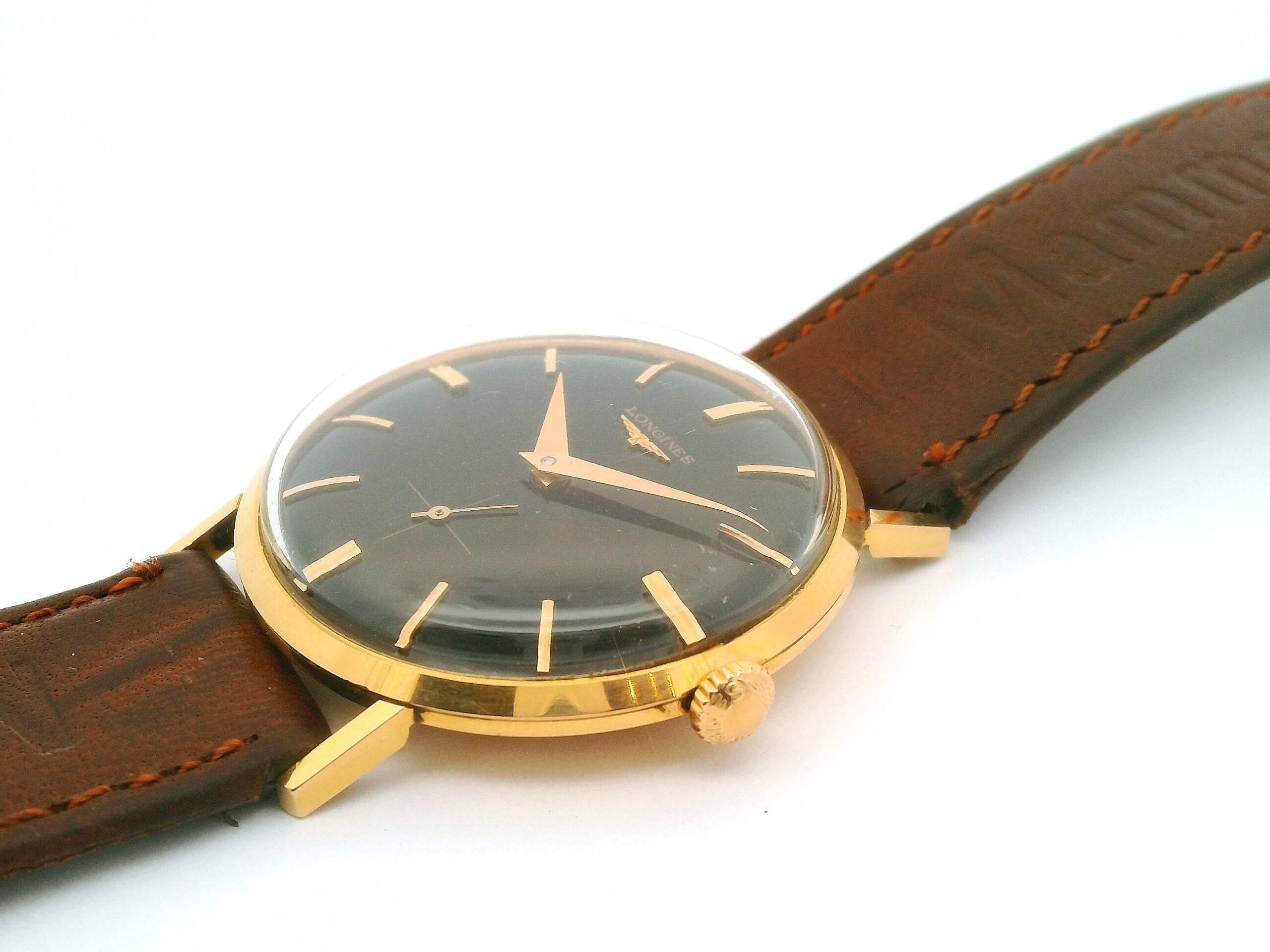 Armbanduhr Longines Kaliber 370L aus 18 Karat Rotgold, um 1960, Plexiglas, schwarzes Zifferblatt mit Keilindizes, Drückergehäuse, Sekundenanzeige bei sechs Uhr, die Uhr wurde im Jahr 1991 gewartet, Gehäusedurchmesser 33 mm, Dicke 8,5 mm, Länge über Hörner 40 mm | Longines wristwatch, caliber 370L, 18K rose gold, circa 1960, plexiglass, black dial with wedge indices, push-back case, seconds display at six o’clock, serviced in 1991, case diameter 33 mm, thickness 8.5 mm, lug-to-lug 40 mm