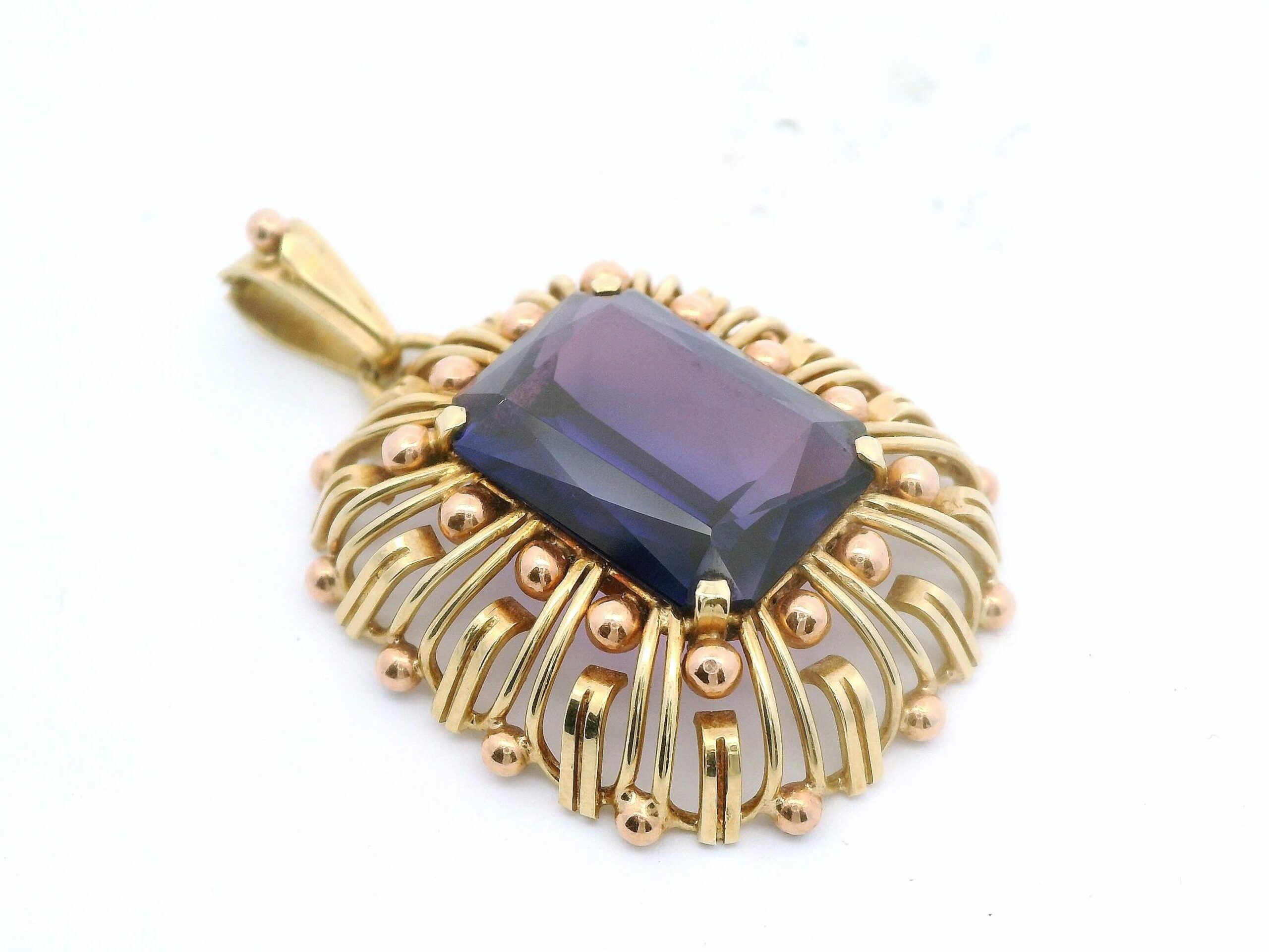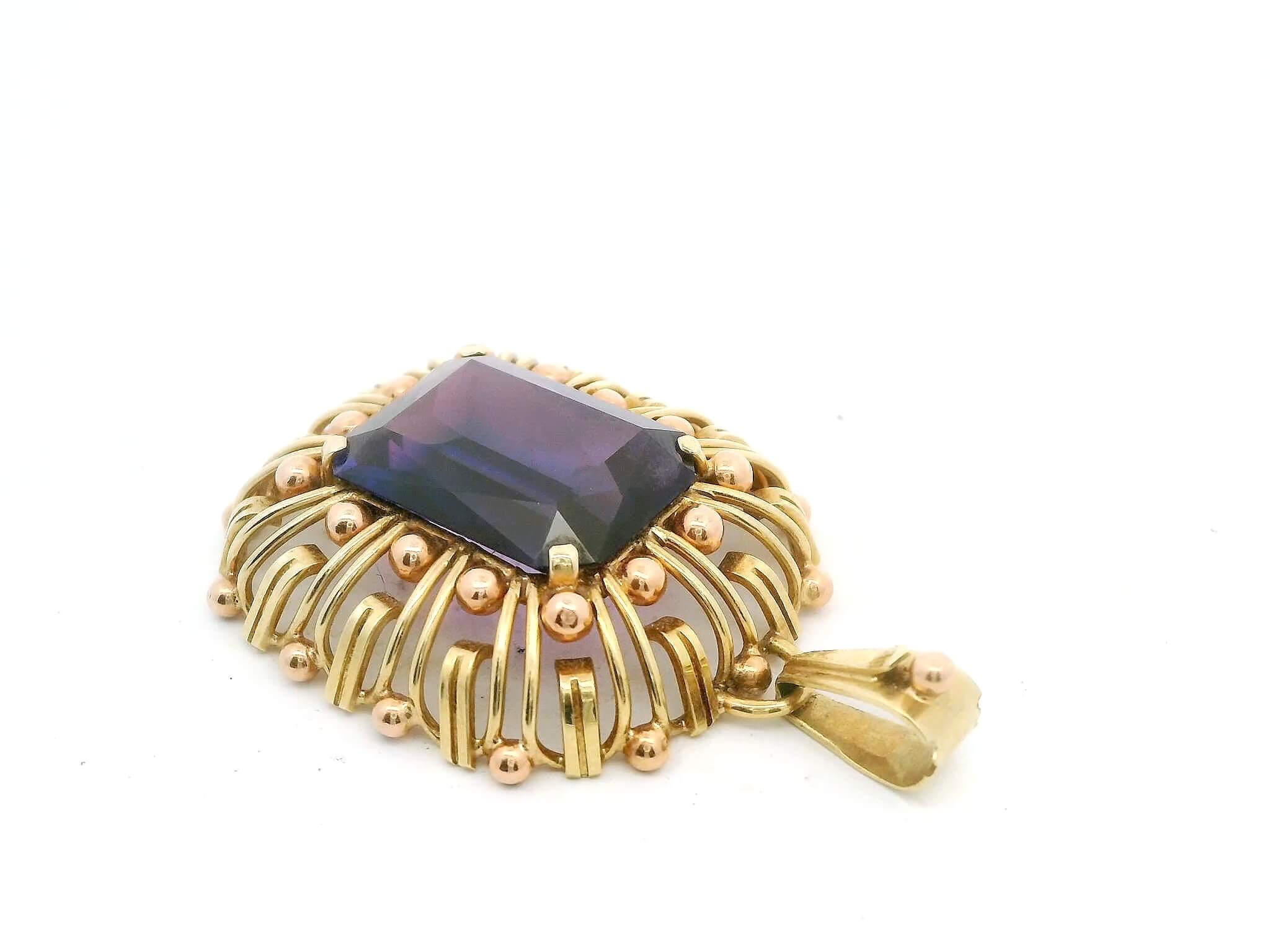 Anhänger aus Gelbgold/Rotgold 585/fein mit Amethyst, circa 12 ct, 1960er Jahre, Gesamtgewicht 7,4 g, Steingewicht 2,5 g | Pendant made of yellow gold/red gold 585/fine with amethyst, circa 12 ct, 1960s, total weight 7.4 g, stone weight 2.5 g