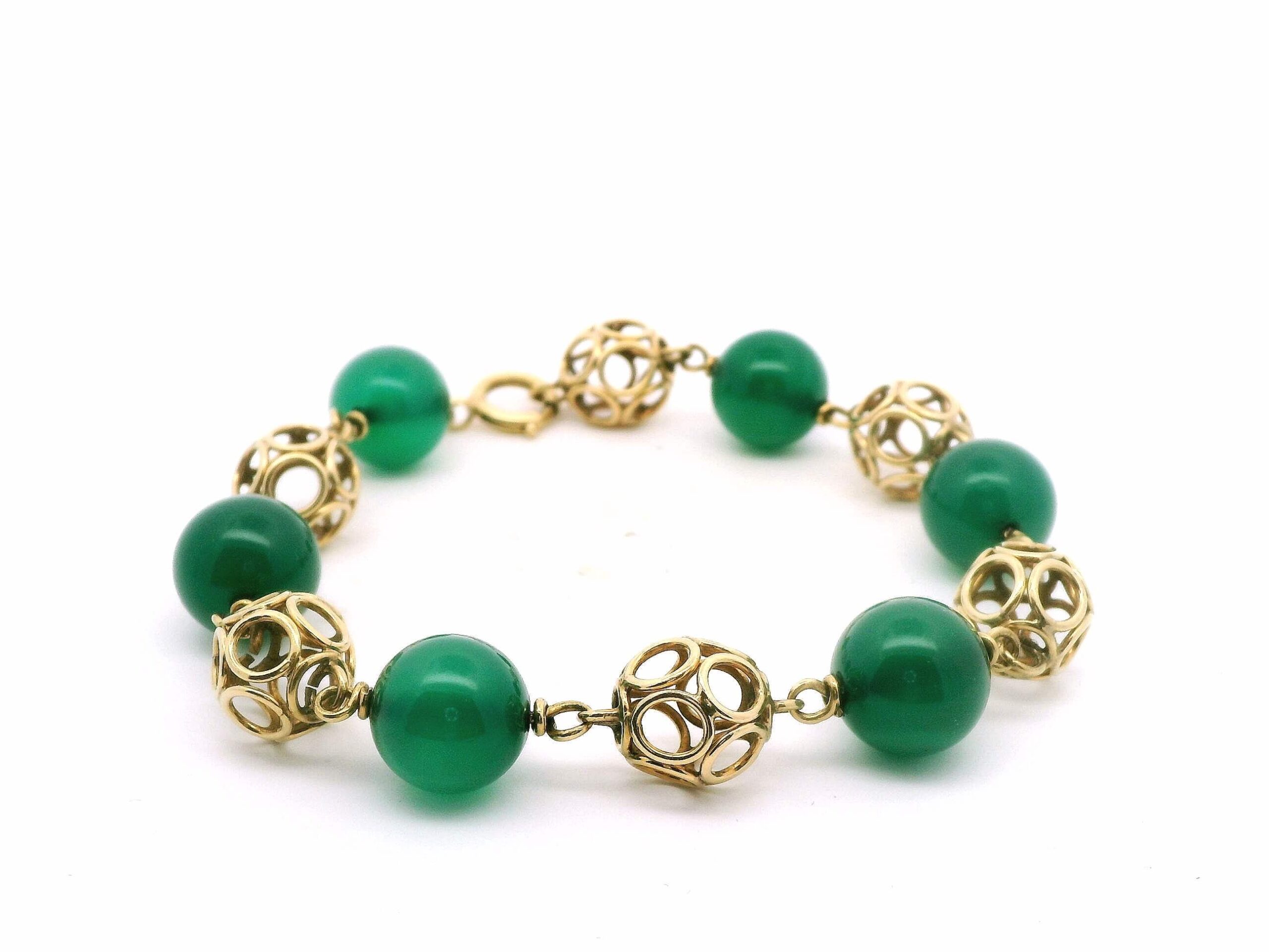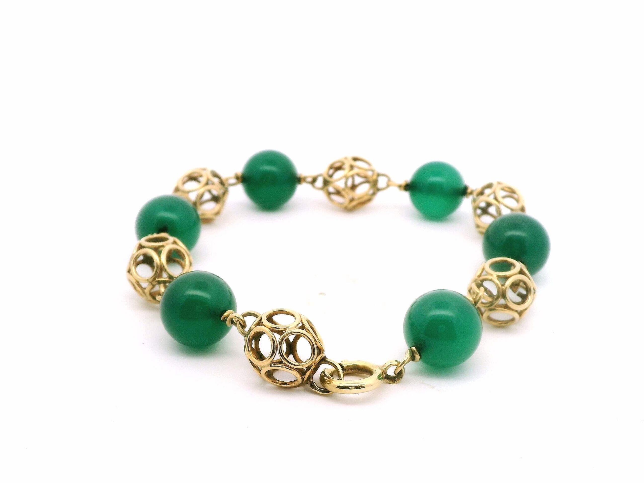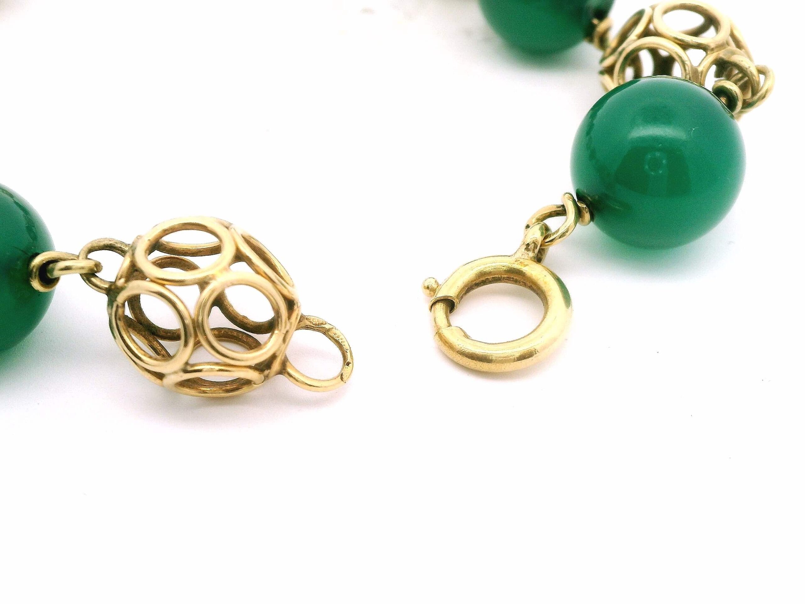 Armband aus Gelbgold 585/fein mit grünen Achatkugeln, Länge 20,5 cm, Gesamtgewicht 26 g, Steingewicht 12 g | Bracelet made of yellow gold 585/fine with green agate beads, length 20.5 cm, total weight 26 g, stone weight 12 g