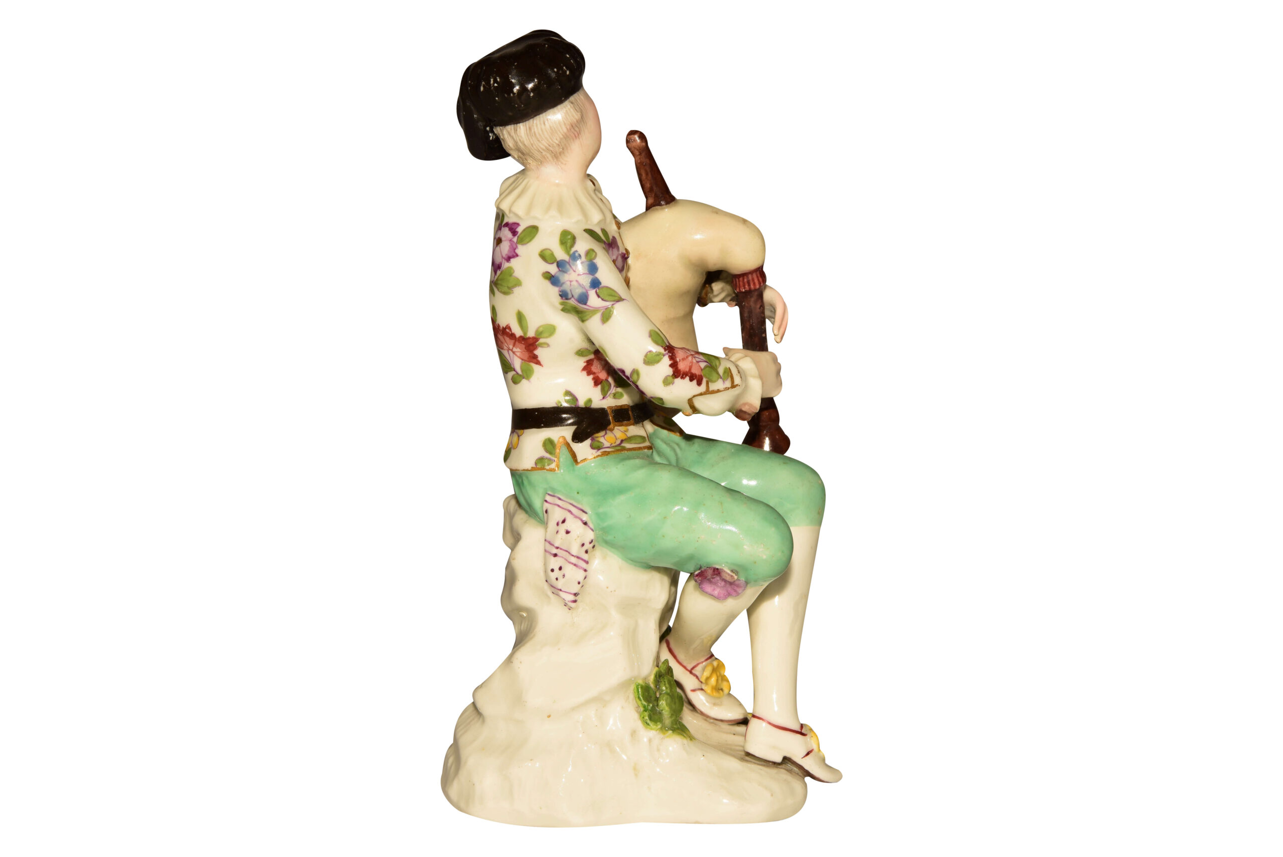 Der Harlekin sitzt auf einem rundem und unregelmäßigem Sockel, welcher mit geprägtem Blattwerk und Blüten verziert ist. Das Porzellan ist bunt bemalt, im Vergleich zum Sockel. Es ist keine Marke vorhanden. Maße: Höhe 13 cm | The harlequin sits on a round, irregular base decorated with embossed foliage and blossoms. The porcelain is brightly painted, unlike the base. There is no mark. Dimensions: Height 13 cm