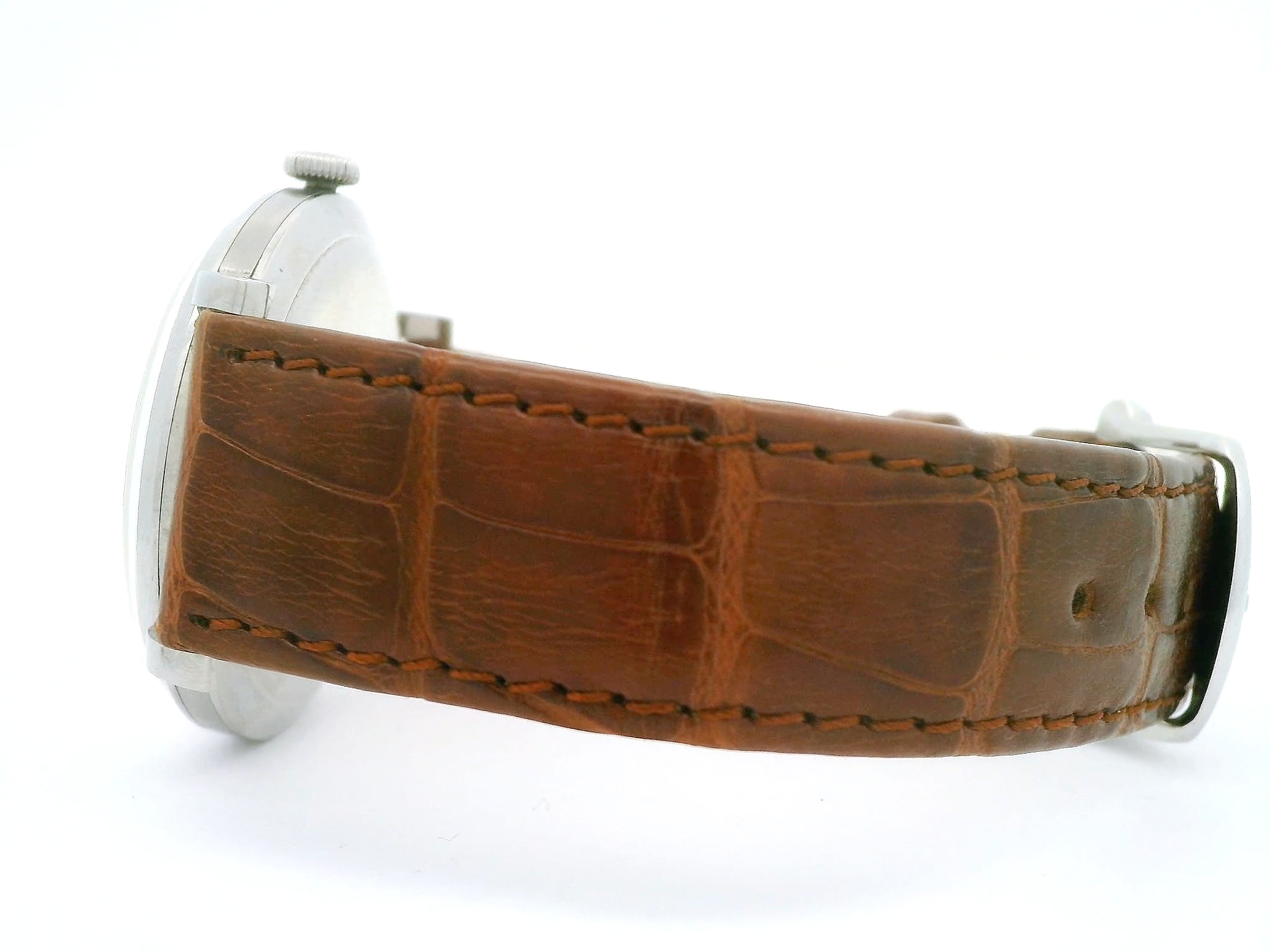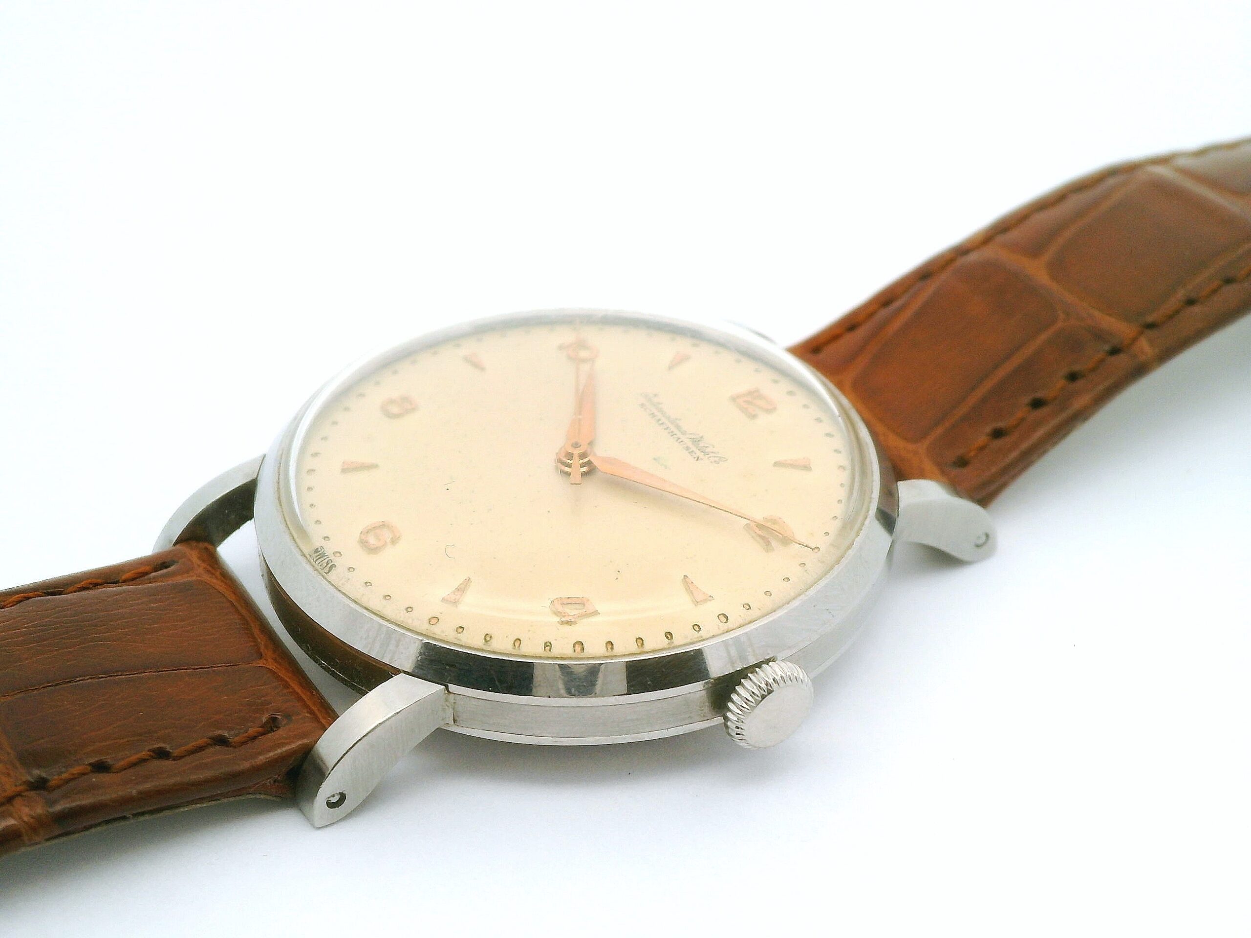 Armbanduhr International Watch Co. Schaffhausen, Handaufzug, Kaliber C89, circa 1949, Stahlgehäuse mit Lederband, Funktion nicht überprüft | Wristwatch International Watch Co. Schaffhausen, manual winding, caliber C89, circa 1949, steel case with leather strap, function not tested