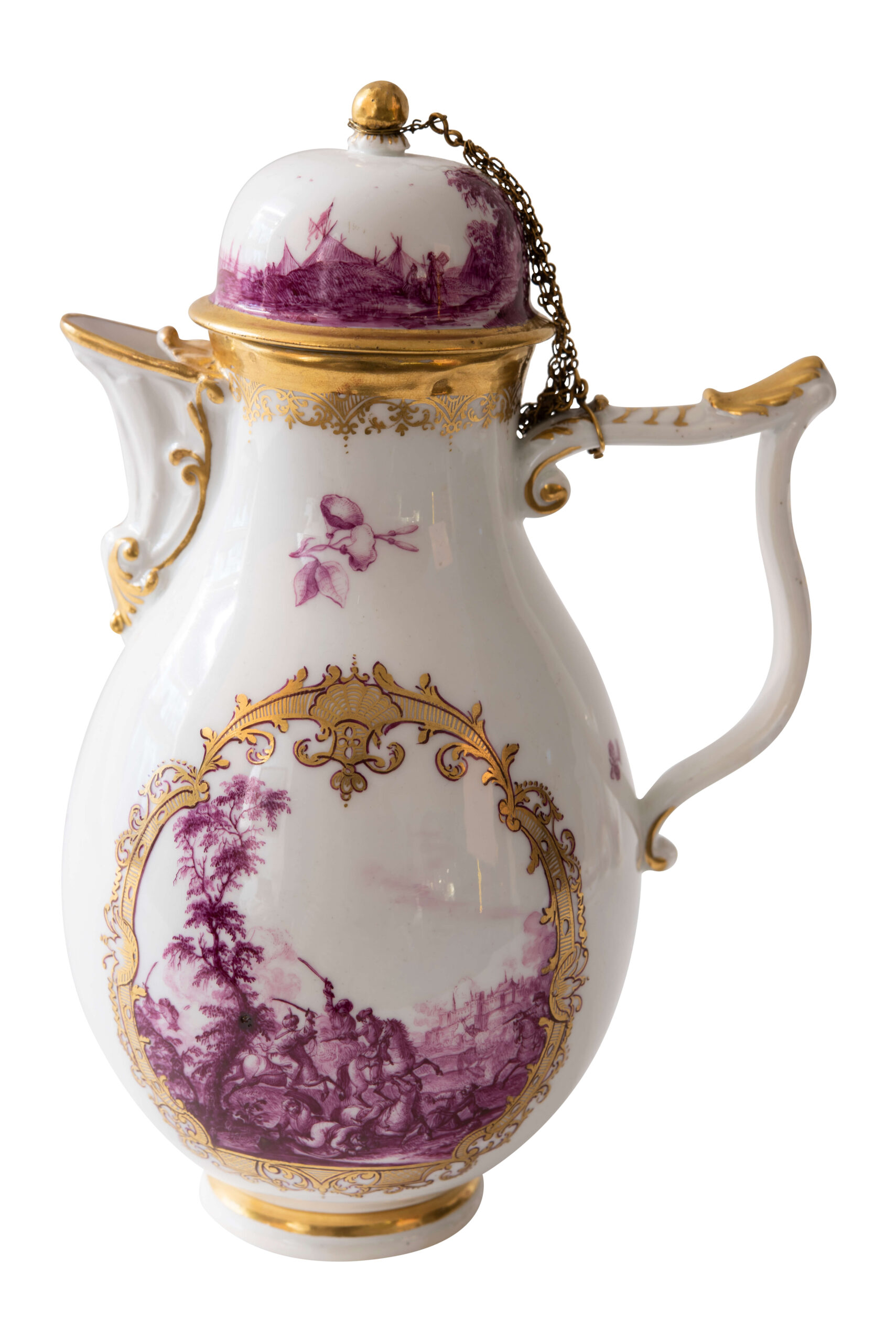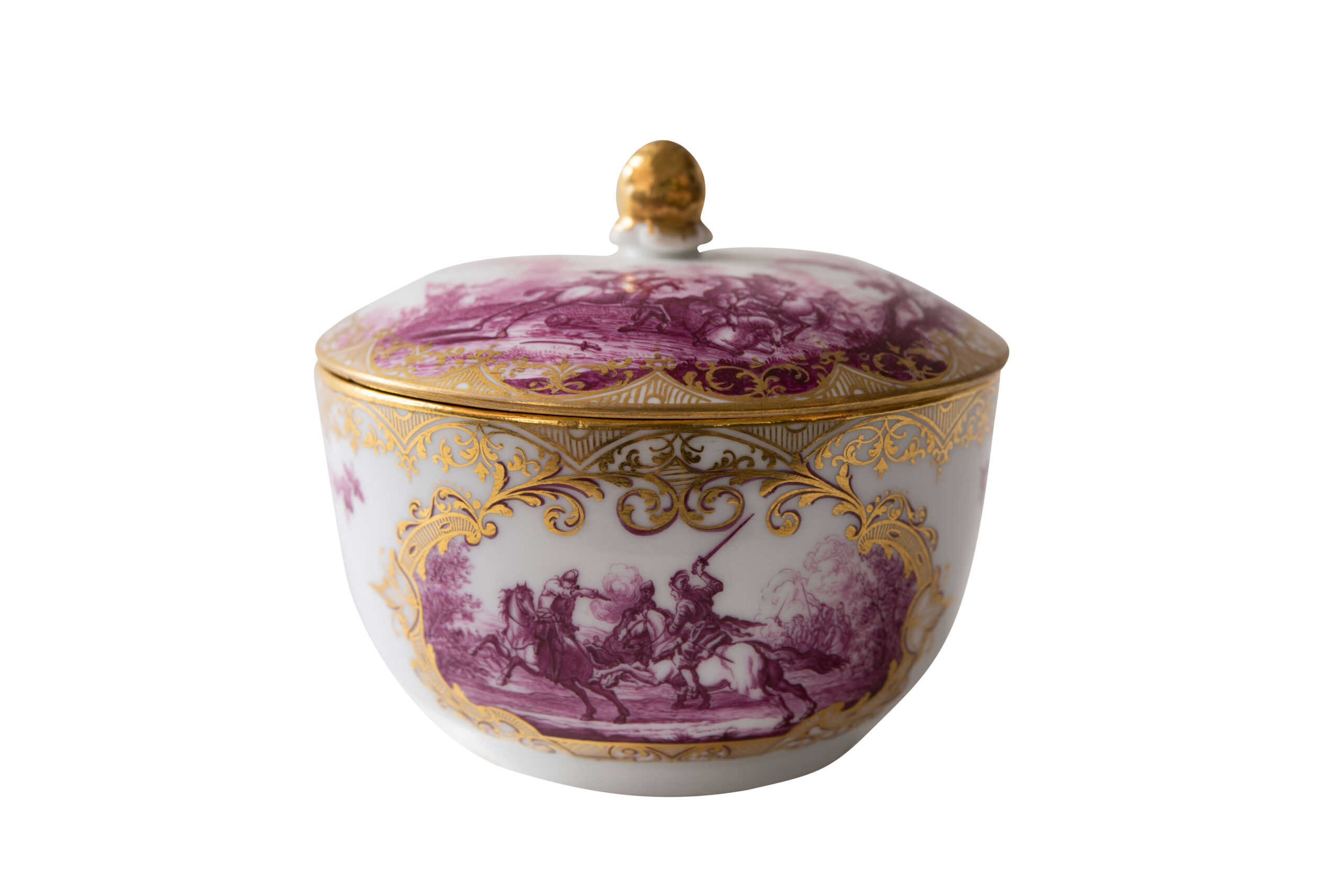 Alle Teile dieses 10-teiligen Prunkservices sind mit äußerst gelungenen Bataillé-Szenen bemalt – begleitet von feinen Goldspitzenborten und Streublumen. Das Service, das ursprünglich wohl noch umfangreicher war, besteht heute aus 6 Tassen mit Untertassen, einer Kaffeekanne, einer Teekanne, einem Milchkännchen und einer Zuckerdose. Unterglasurblaue Schwertermarke, Goldbuchstabe Z und andere Ritzmarken, Malerei in Purpurkamaieu, Gold. Insgesamt ist das Service in sehr gutem Zustand. Es weist keine Beschädigungen auf. Die Dekoration ist gut erhalten. | All parts of this 10-piece ceremonial service are painted with extremely successful bataillé scenes – accompanied by fine gold lace borders and scattered flowers. The service, which was probably originally even more extensive, now consists of 6 cups with saucers, a coffee pot, a teapot, a milk jug and a sugar bowl. Underglaze blue sword mark, gold letter Z and other incised marks, painting in purple camaieu, gold. Overall, the service is in very good condition. It shows no signs of damage. The decoration is well preserved.