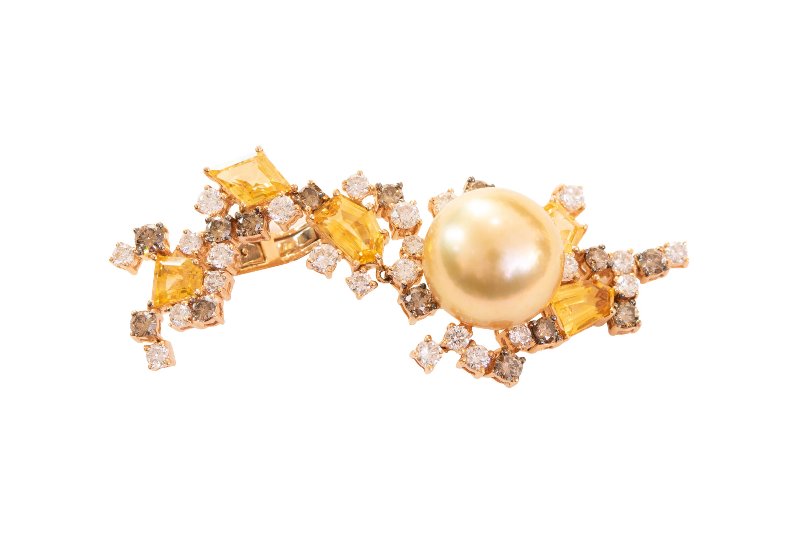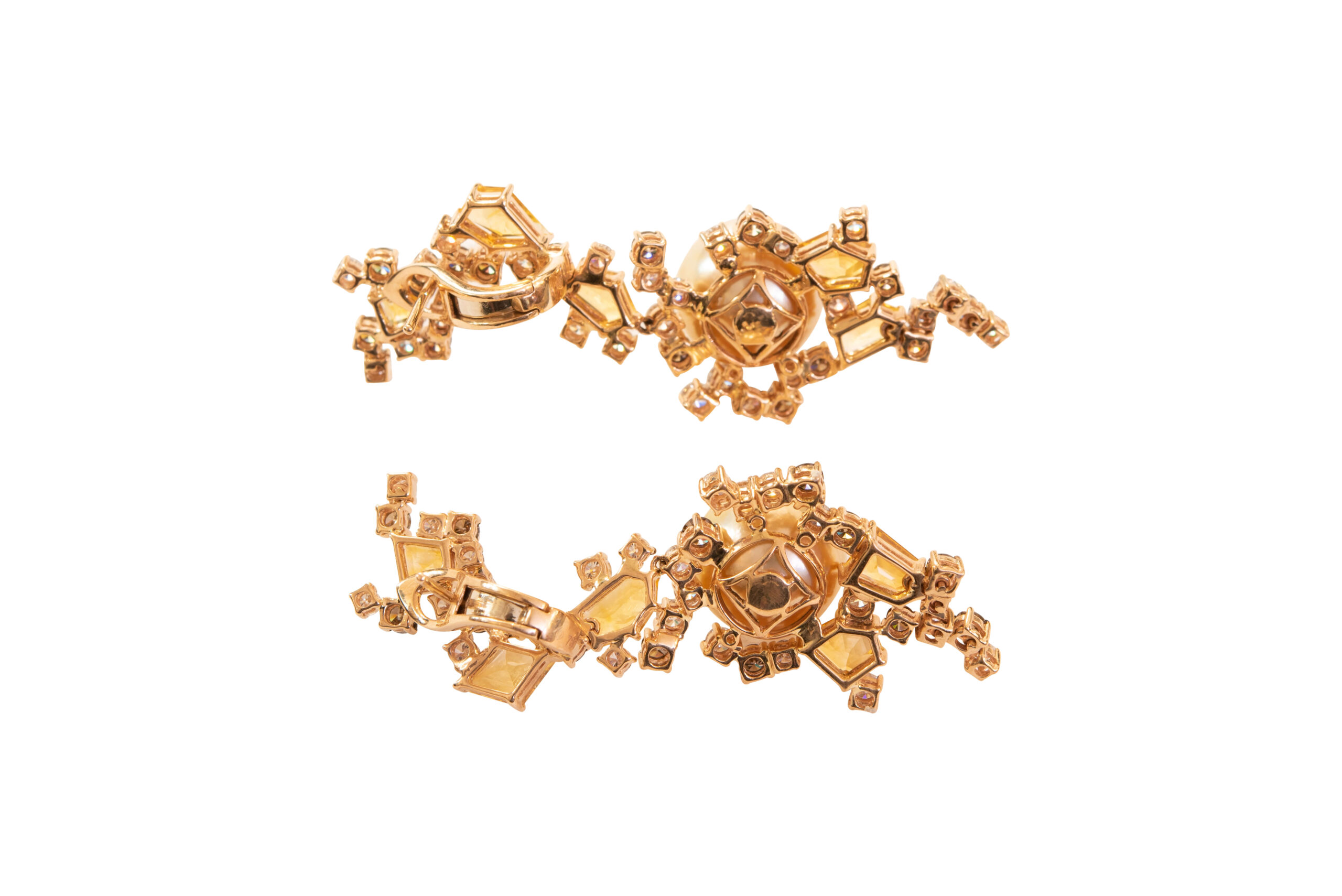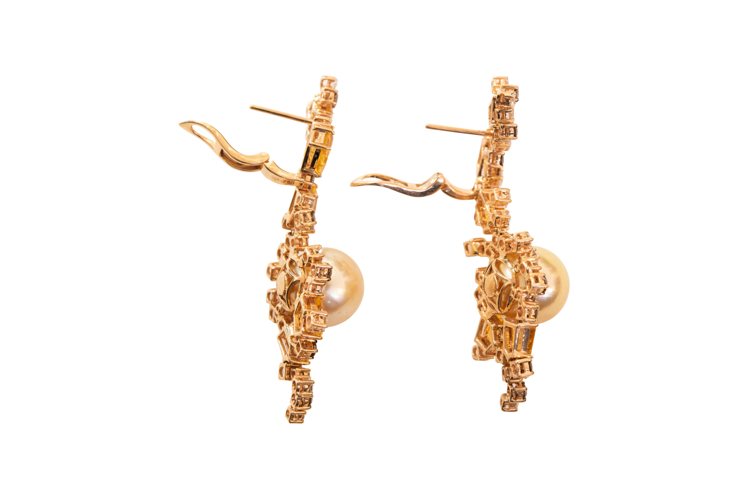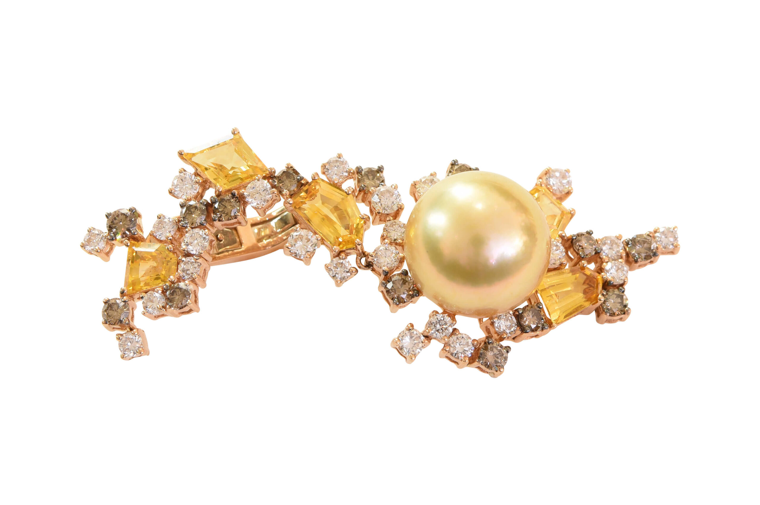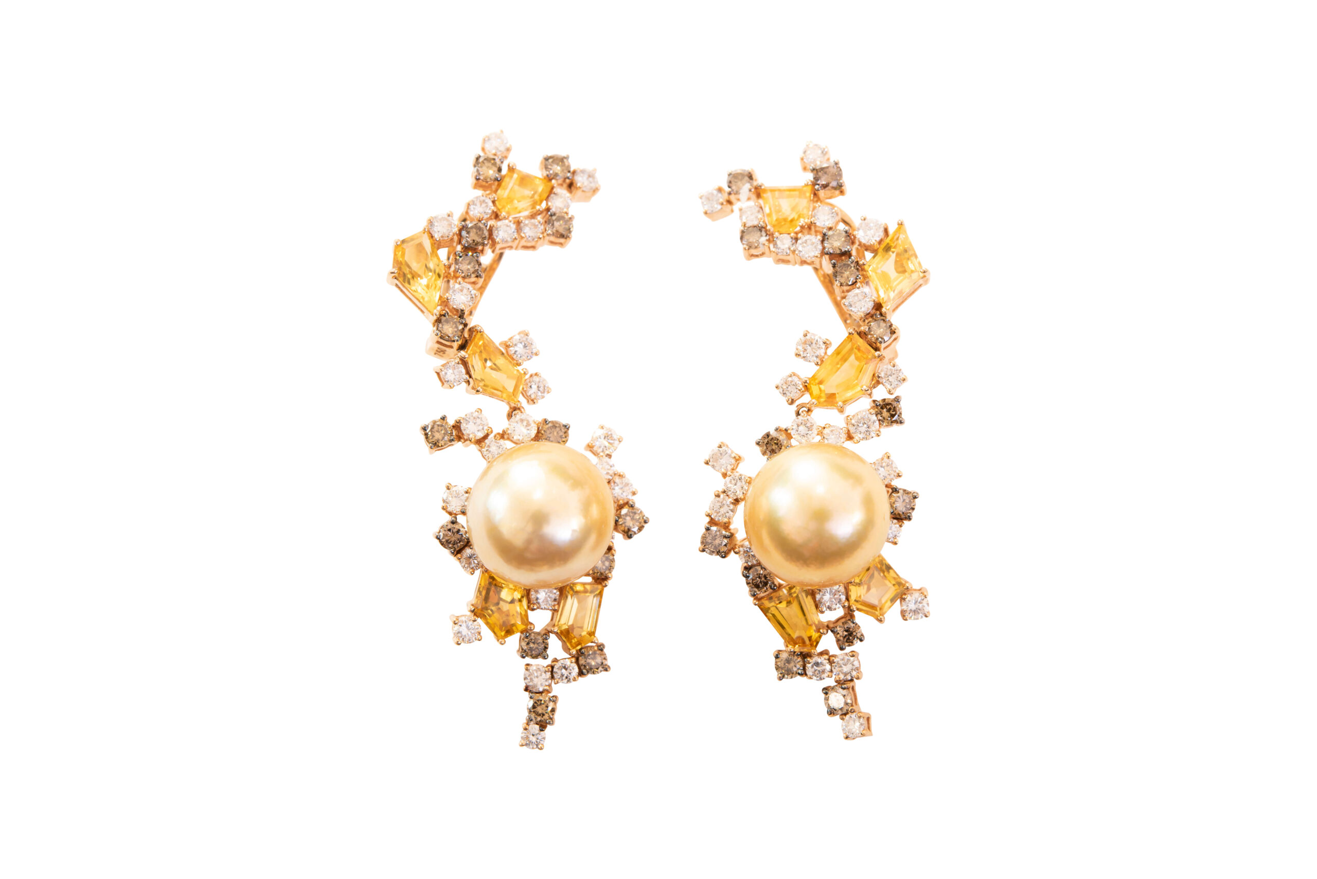 Ohrclipse aus Rotgold 750/fein mit Brillanten von zusammen circa 4,80 ct (Farbe H, Reinheit Si), fancy yellow Brillanten von zusammen circa 7,70 ct und zwei Südsee-Kulturperlen von circa 12 mm (32,35 ct), Gesamtgewicht 24,32 g | Earrings in Rose Gold 750/Fine with Brilliant-Cut Diamonds Totaling Approx. 4.80 ct (Color H, Clarity Si), Fancy Yellow Diamonds Totaling Approx. 7.70 ct, and Two South Sea Cultured Pearls Measuring Approx. 12 mm (32.35 ct), Gross Weight 24.32 g